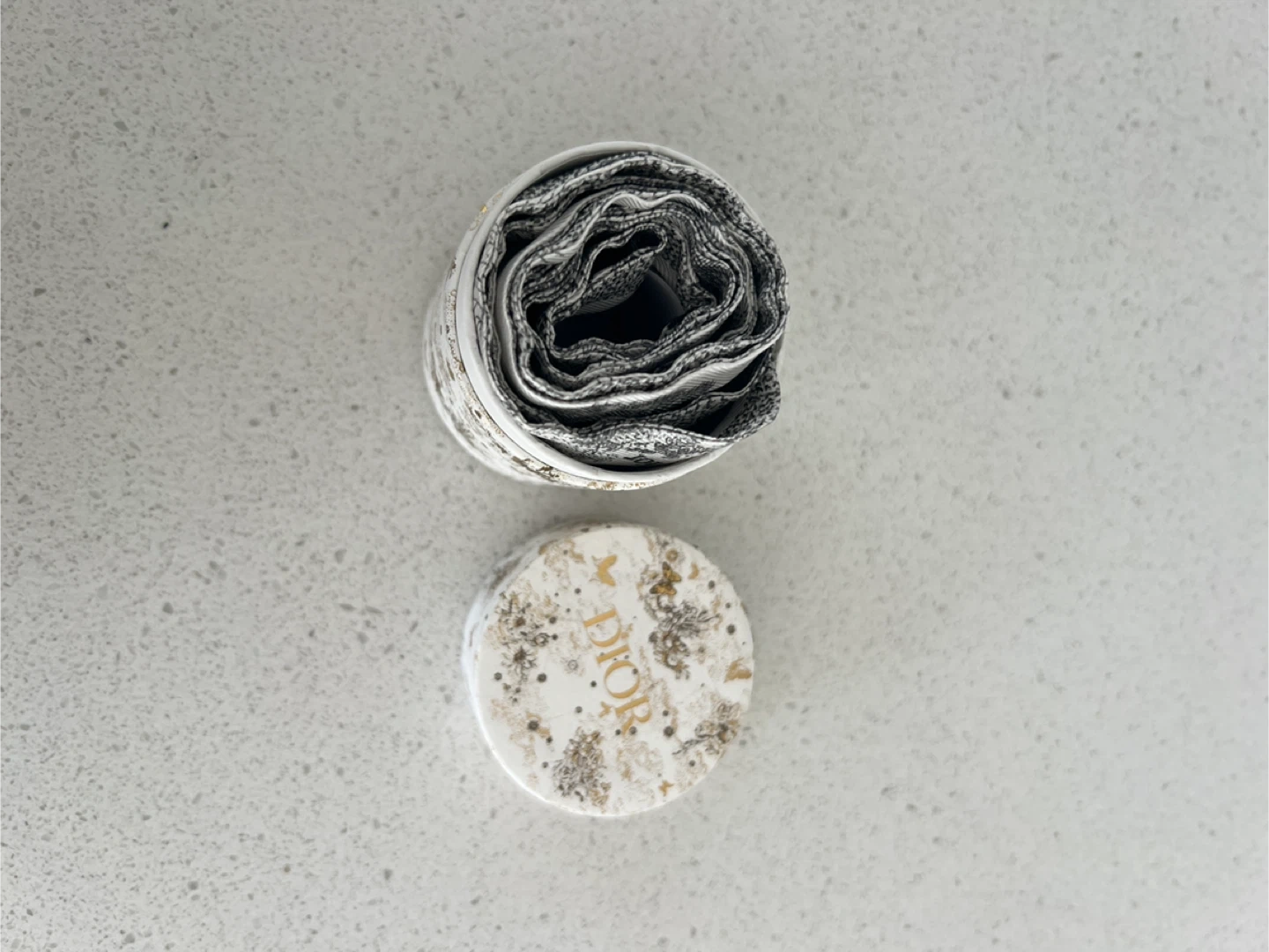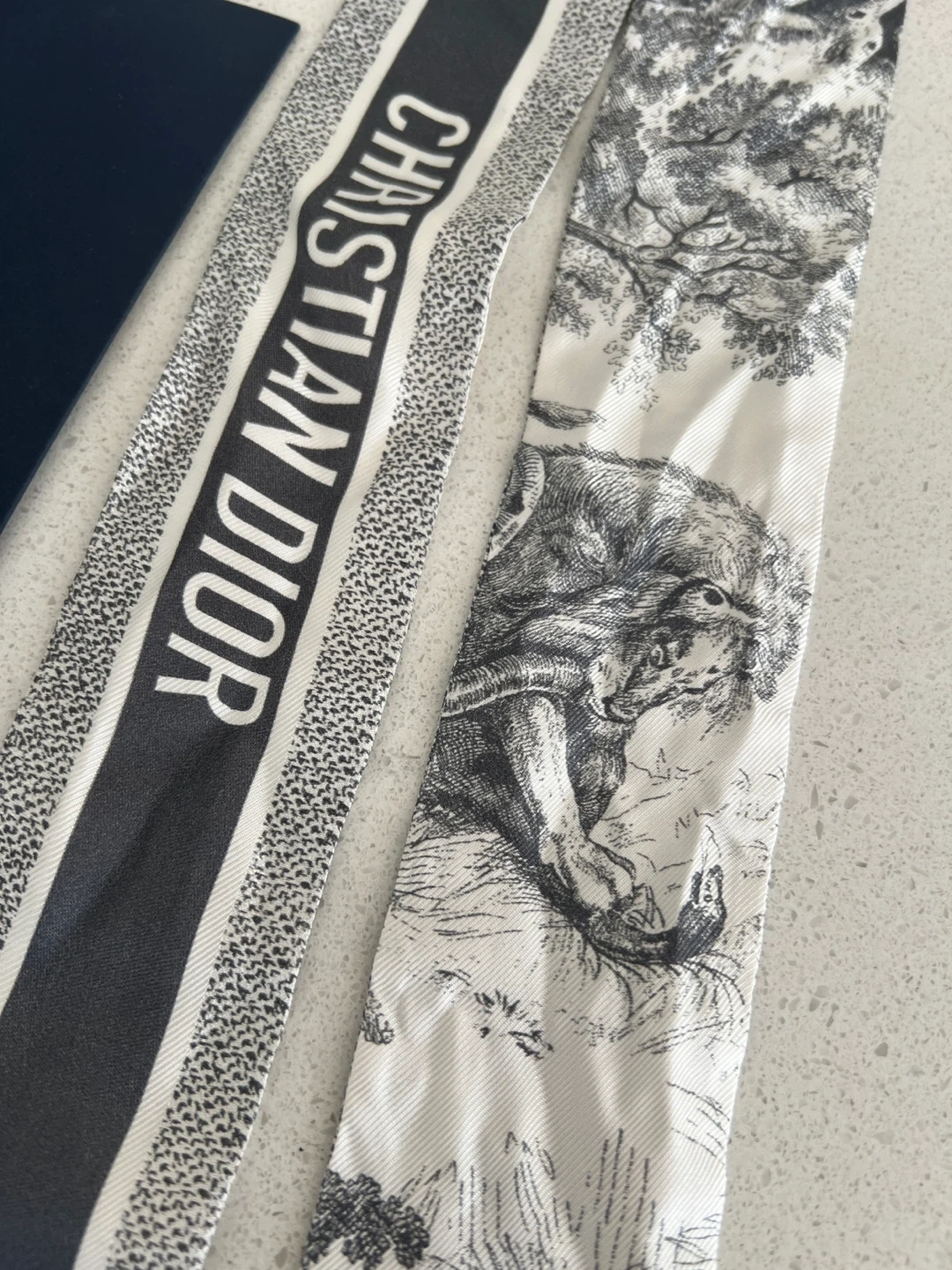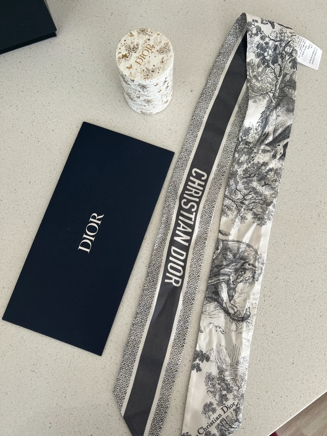 60Color: gray Selling a brand new Christian Dior silk scarf! It comes with the box and is in perfect condition. The scarf features a beautiful black and white design. It's a stylish accessory to elevate any outfit