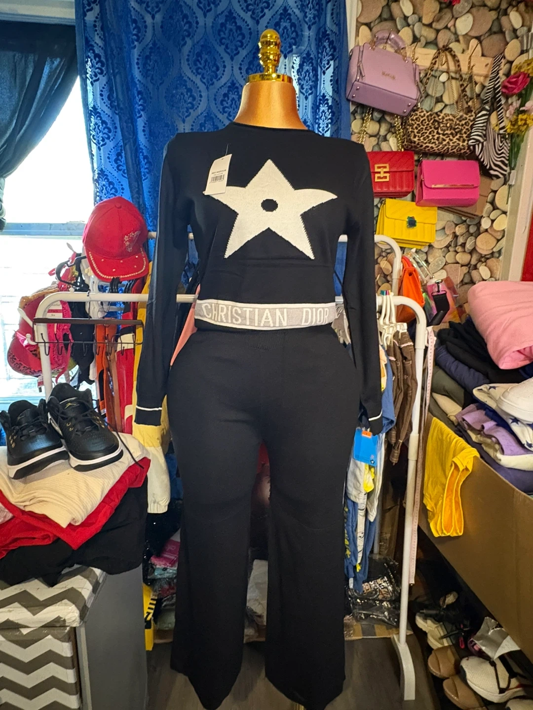 131Stylish Christian Dior lounge set featuring a star print top and wide-leg pants. The set includes a top with a large star design and pants with a Christian Dior branded elastic waistband. Perfect for lounging in style!
