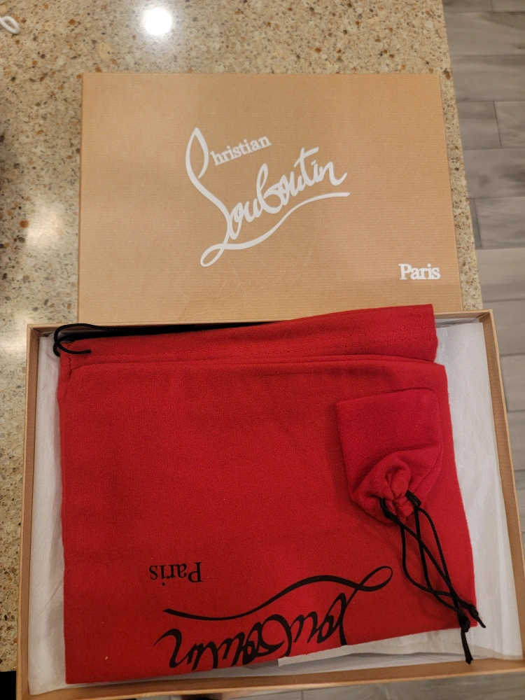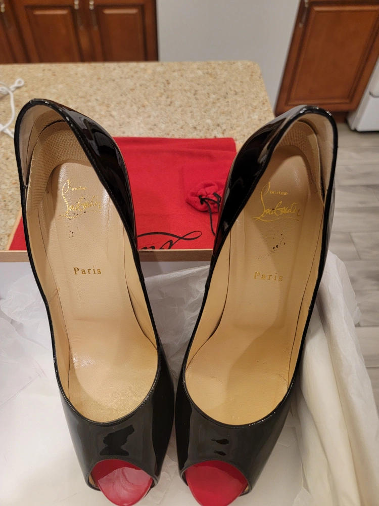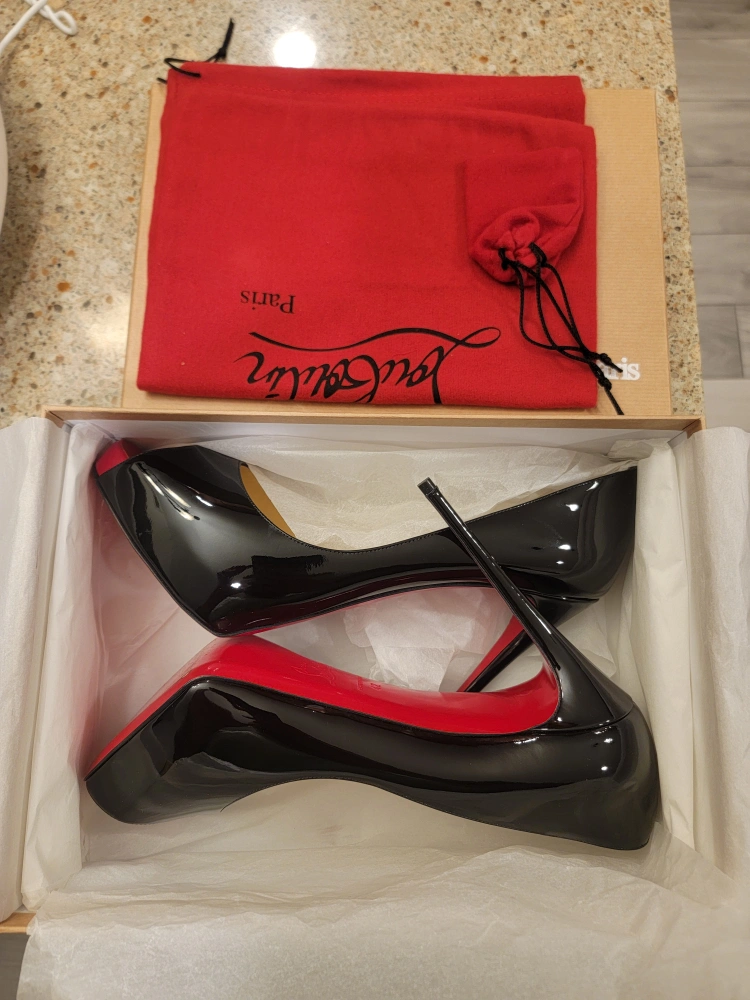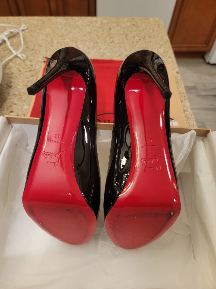 Selling a pair of Christian Louboutin heels in size 42. They are made of black patent leather with the iconic red soles. Comes with the original box and dust bag!