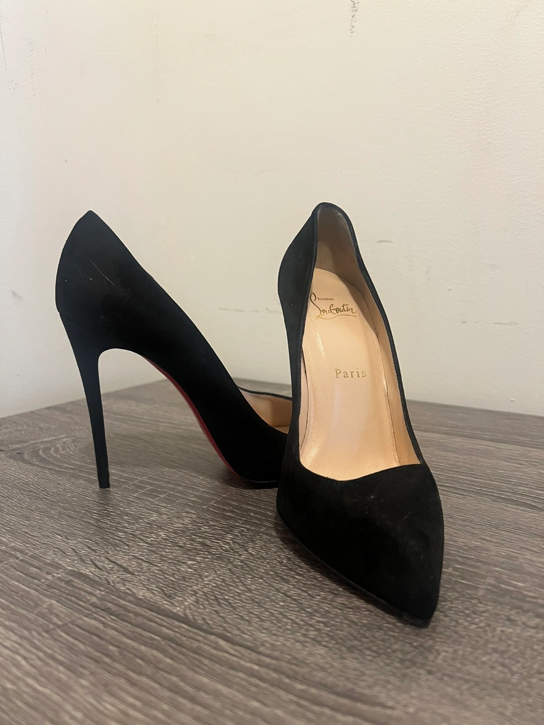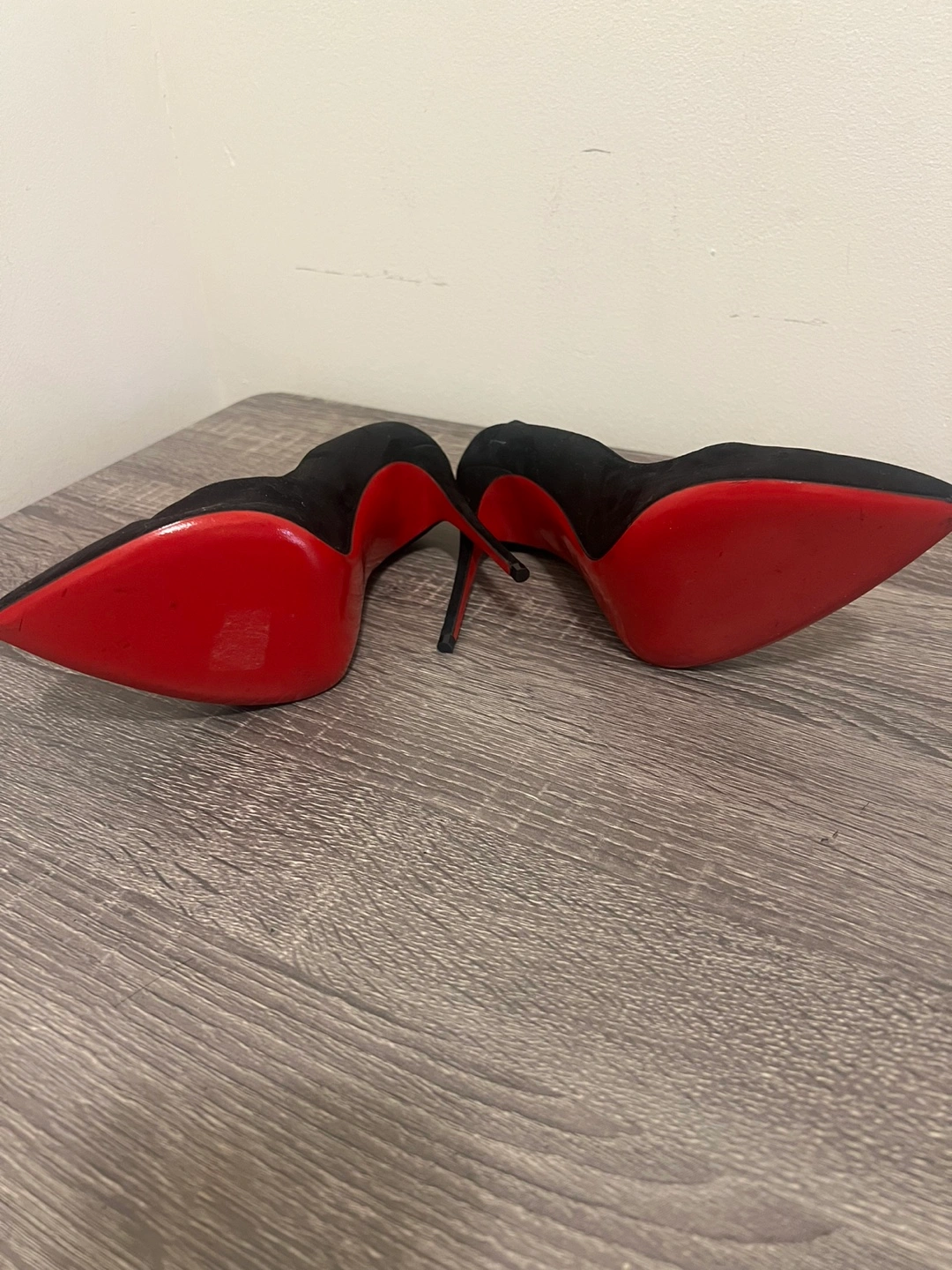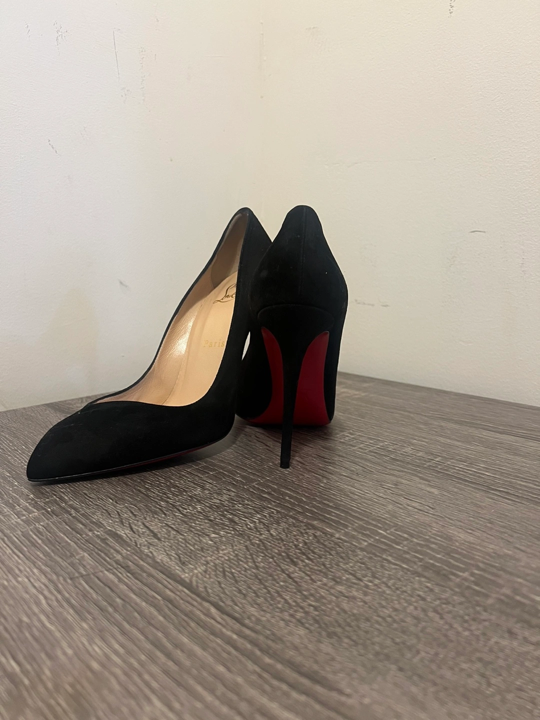 60Beautiful black suede Christian Louboutin heels. Pointed toe. High heels. Red soles.