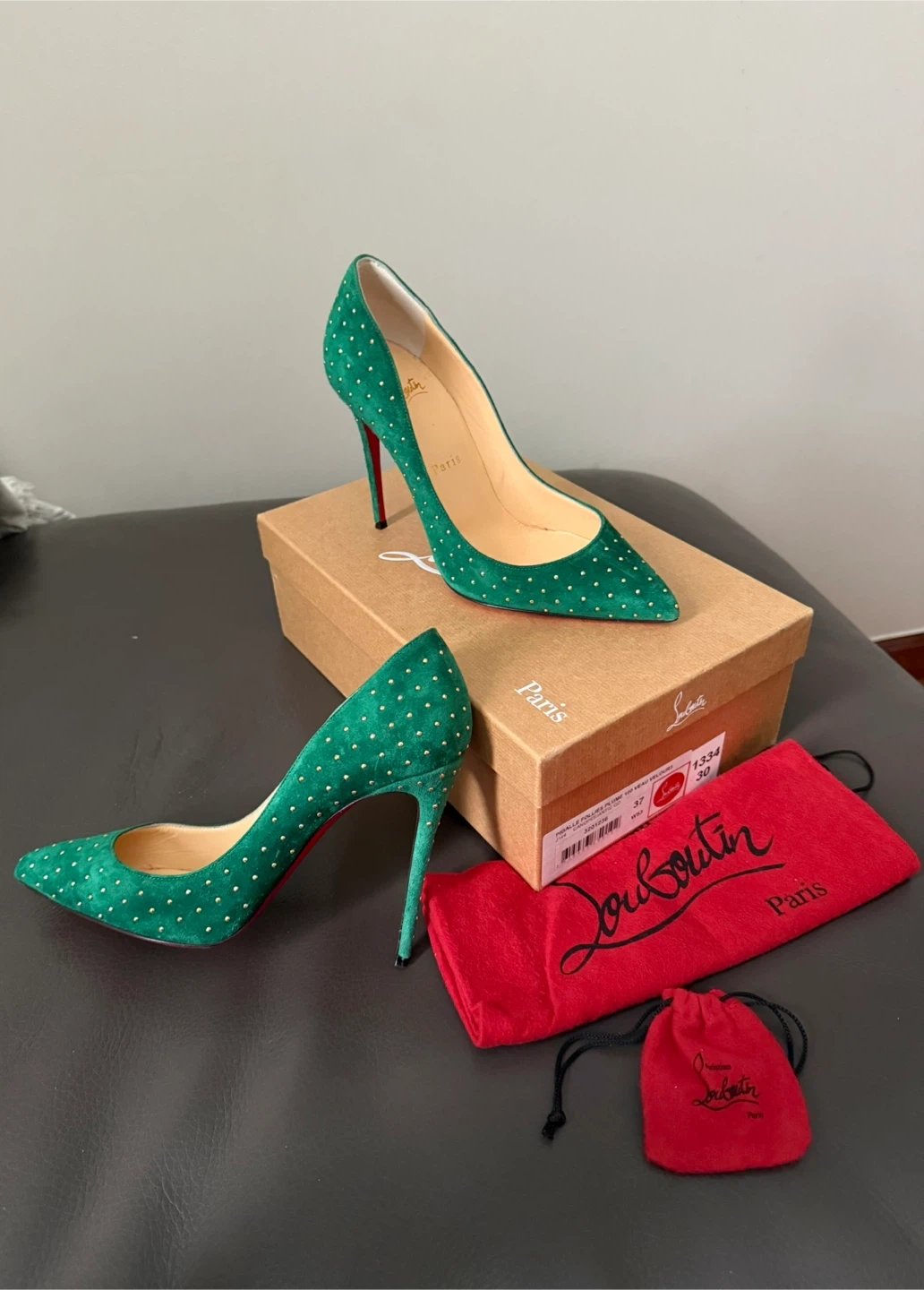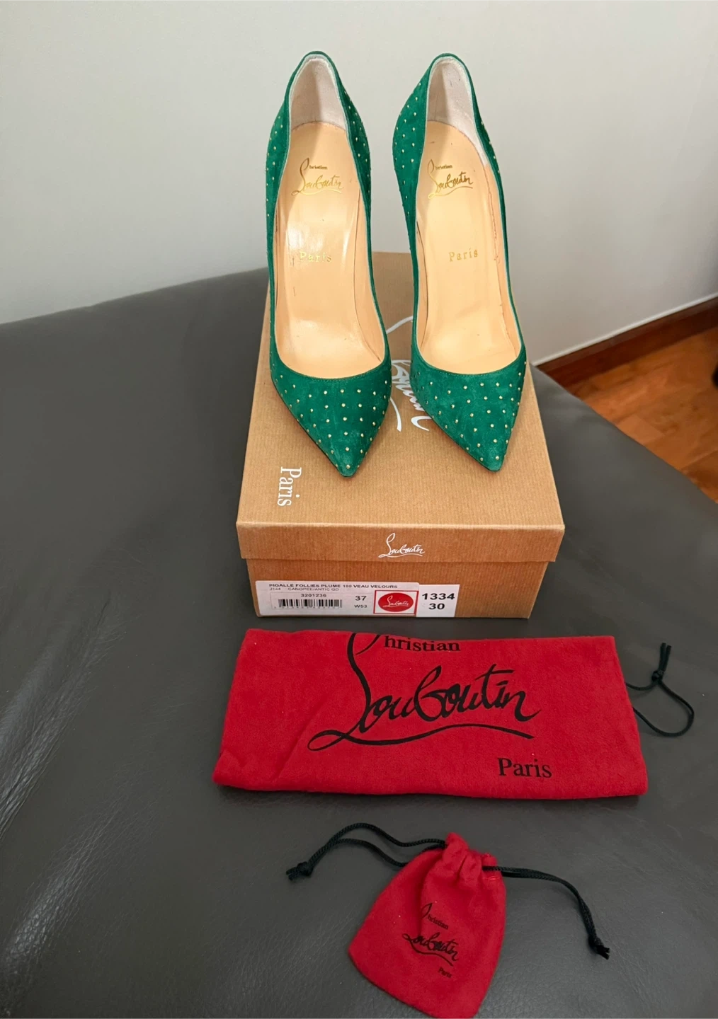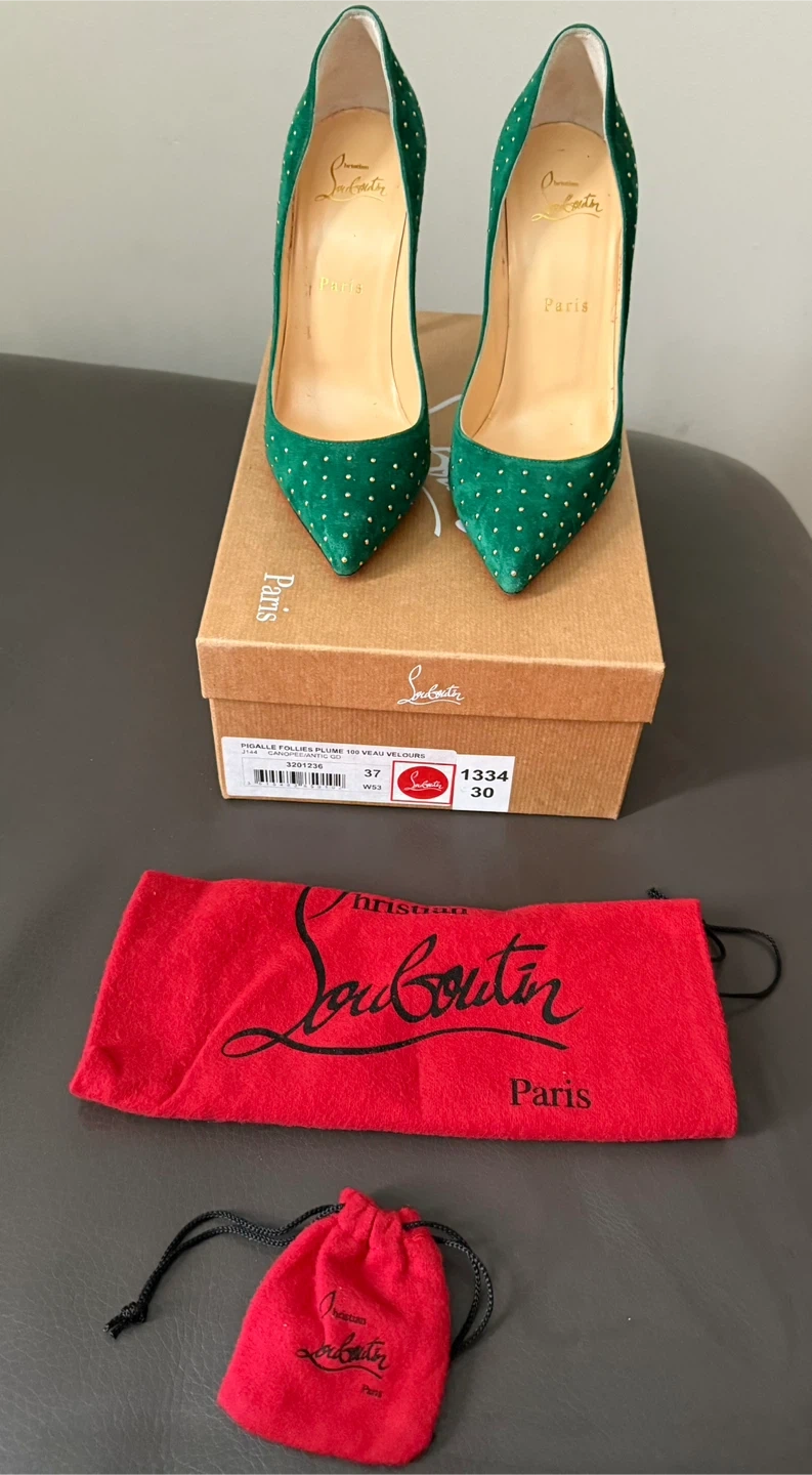 Selling a pair of Christian Louboutin Follies Strass heels in green, size 37. They are in great condition and come with the original box and dust bags! The material is 100% Veau Velours.