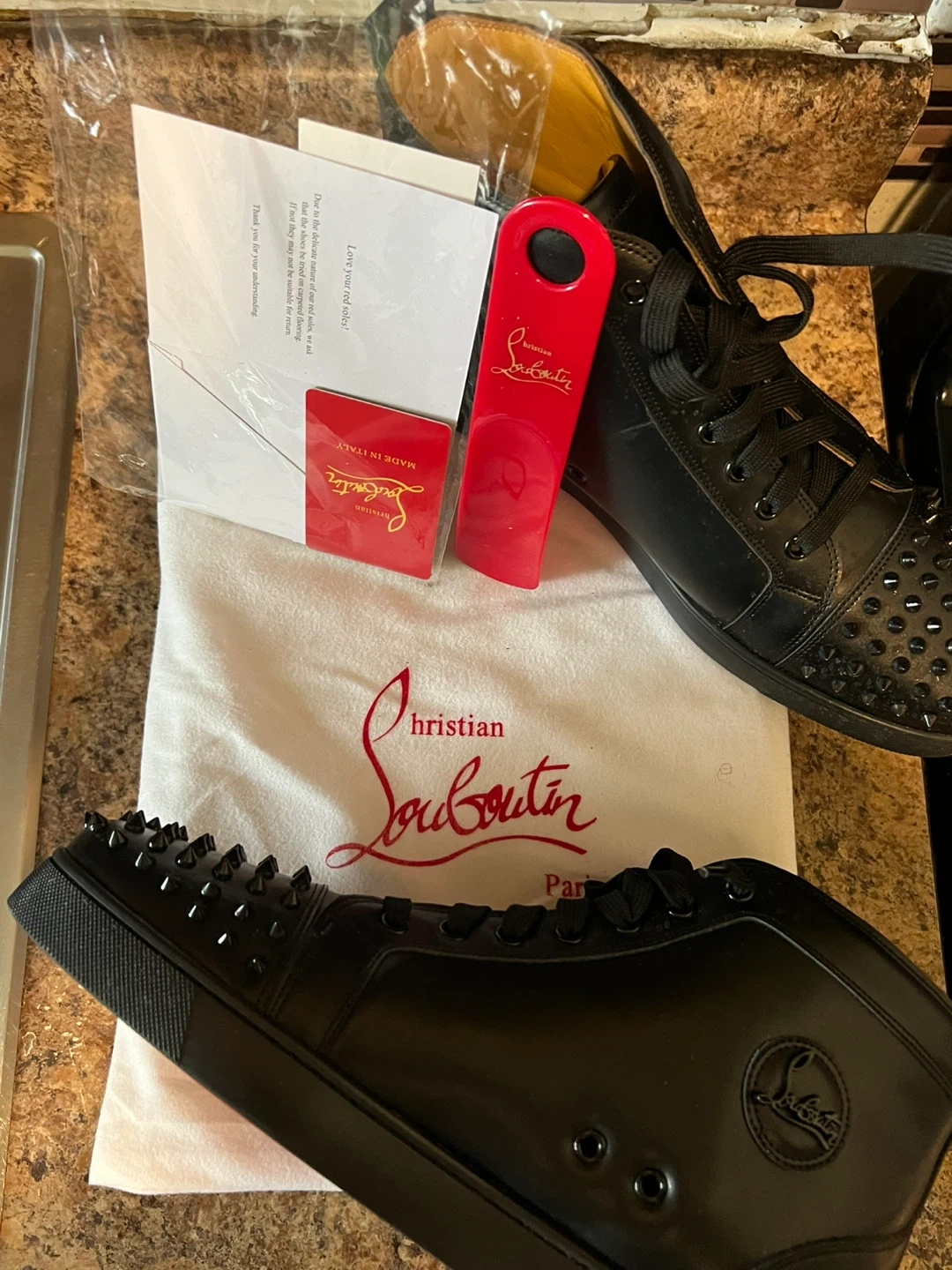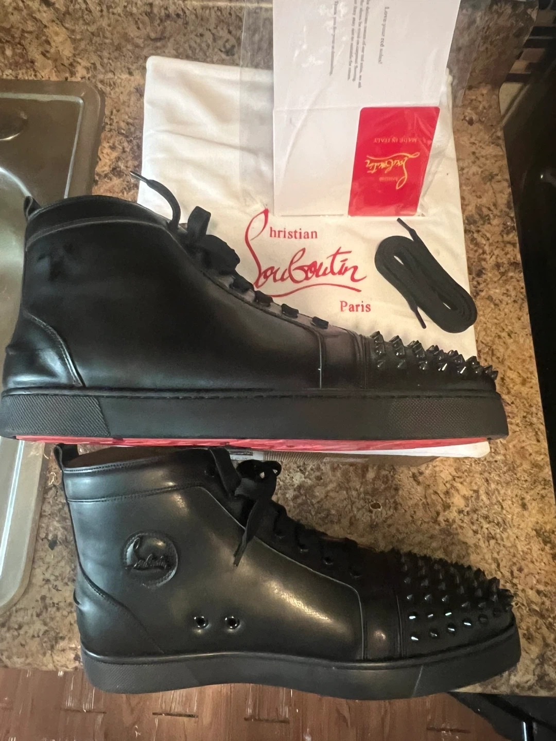 Selling a pair of Christian Louboutin Louis Flat Python sneakers in black. These high-top sneakers feature a unique spike design and the iconic red sole. Comes with the original box, dust bag, shoehorn, and extra laces
