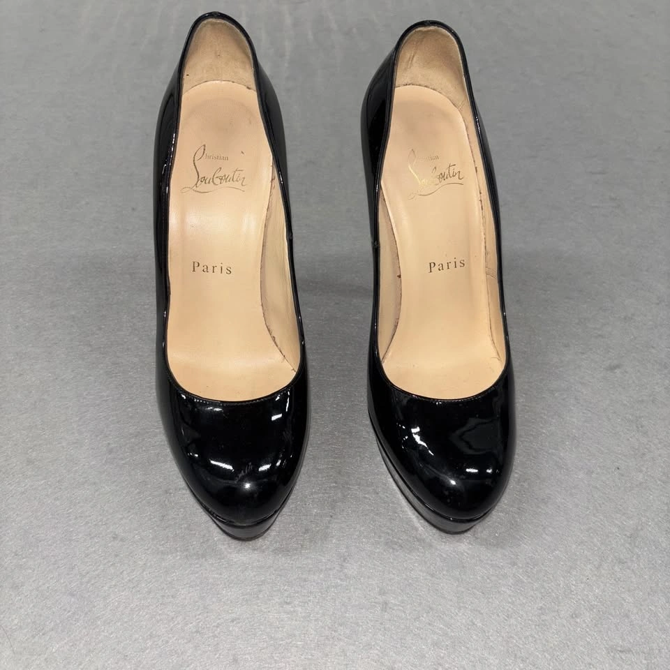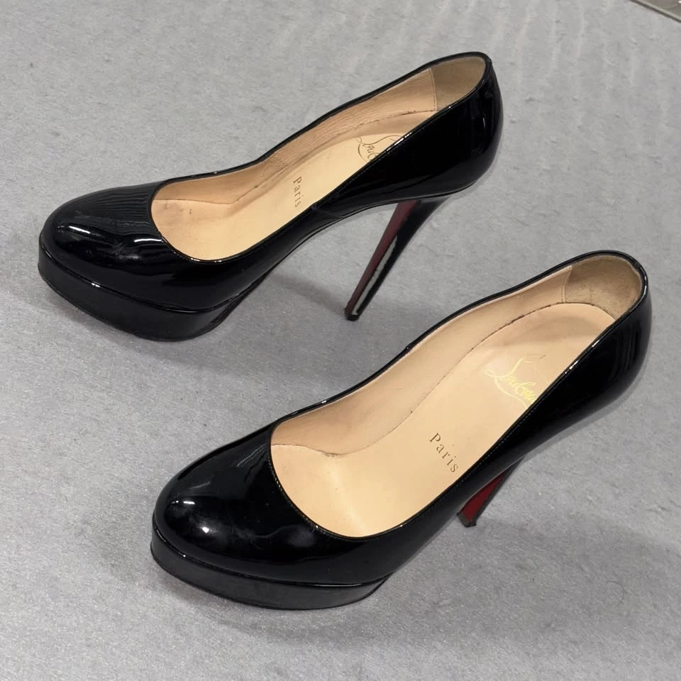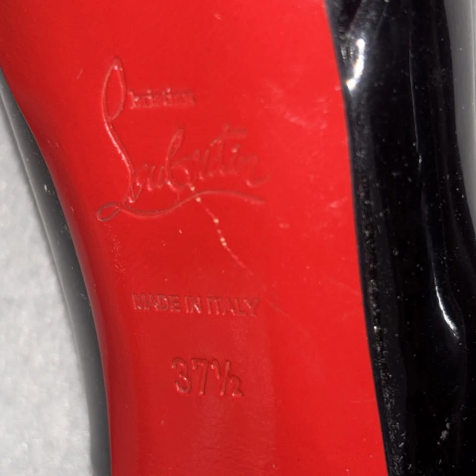 65Christian Louboutin Shoes Womens Size 37.5 Black Patent Leather Platform Heels Condition: Good pre-owned condition. Uppers and insoles show minor wear. Notable wear on the signature red soles (see photos for details). Classic round toe platform pumps in glossy black patent leather Signature red lacquered soles with embossed brand logo and "Made in Italy" marking Brand markings: "Christian Louboutin Paris" in gold on inner sole Made in Italy, size marked as 37.5 (approx US womens 7.5) Slip-on style, high stiletto heel with platform for comfortable lift Timeless Louboutin silhouette, ideal for special occasion or evening wear All pictured details and wear are exactly as shown