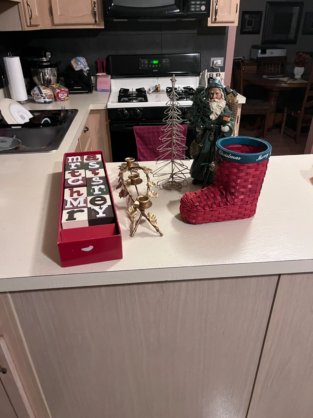 10I have a collection of Christmas decorations for sale. Included are a set of blocks spelling out Christmas, a decorative metal Christmas tree, a Santa figurine, and a red woven Christmas basket. All items are in good condition and ready to add some holiday cheer to your home!