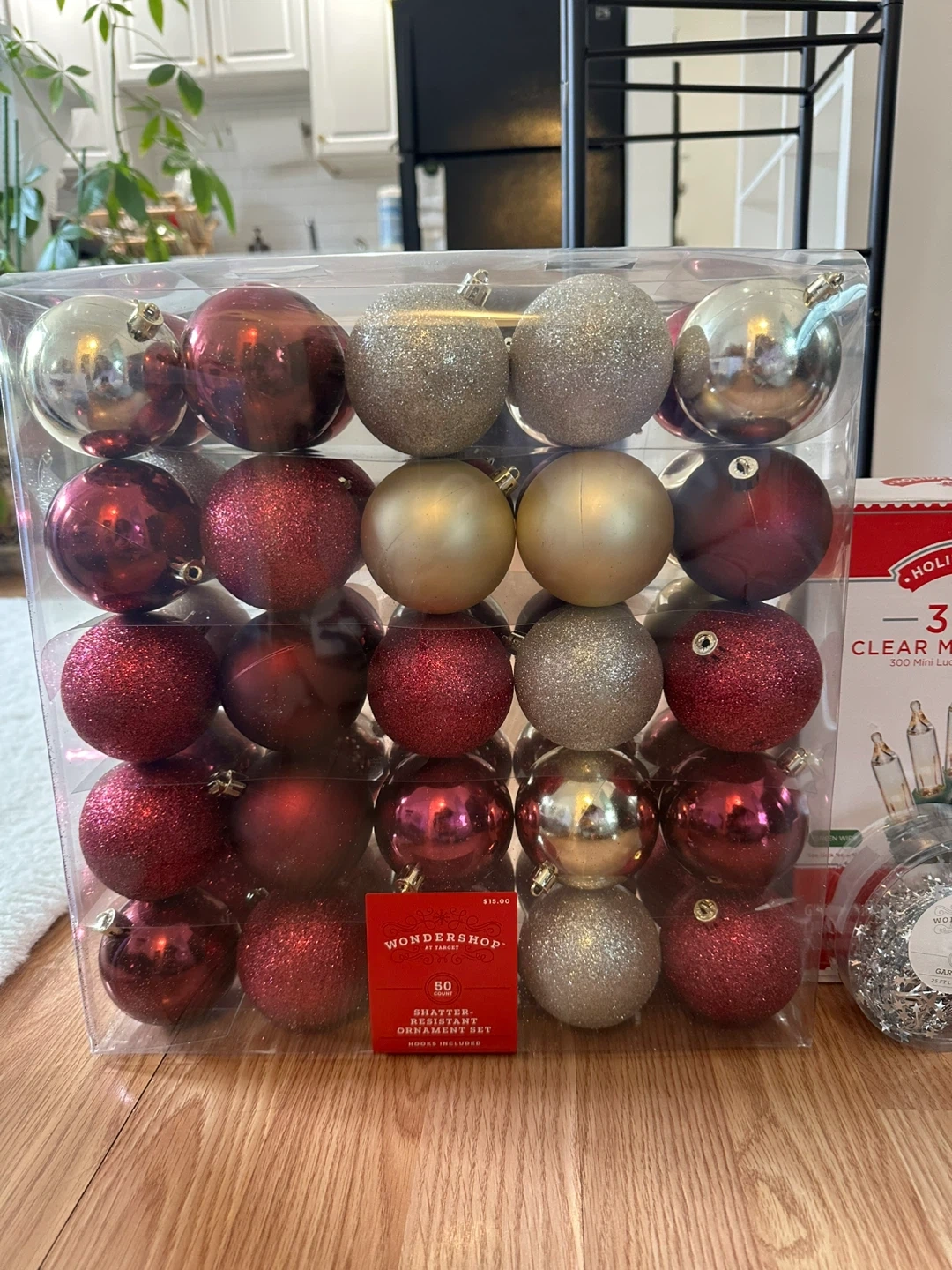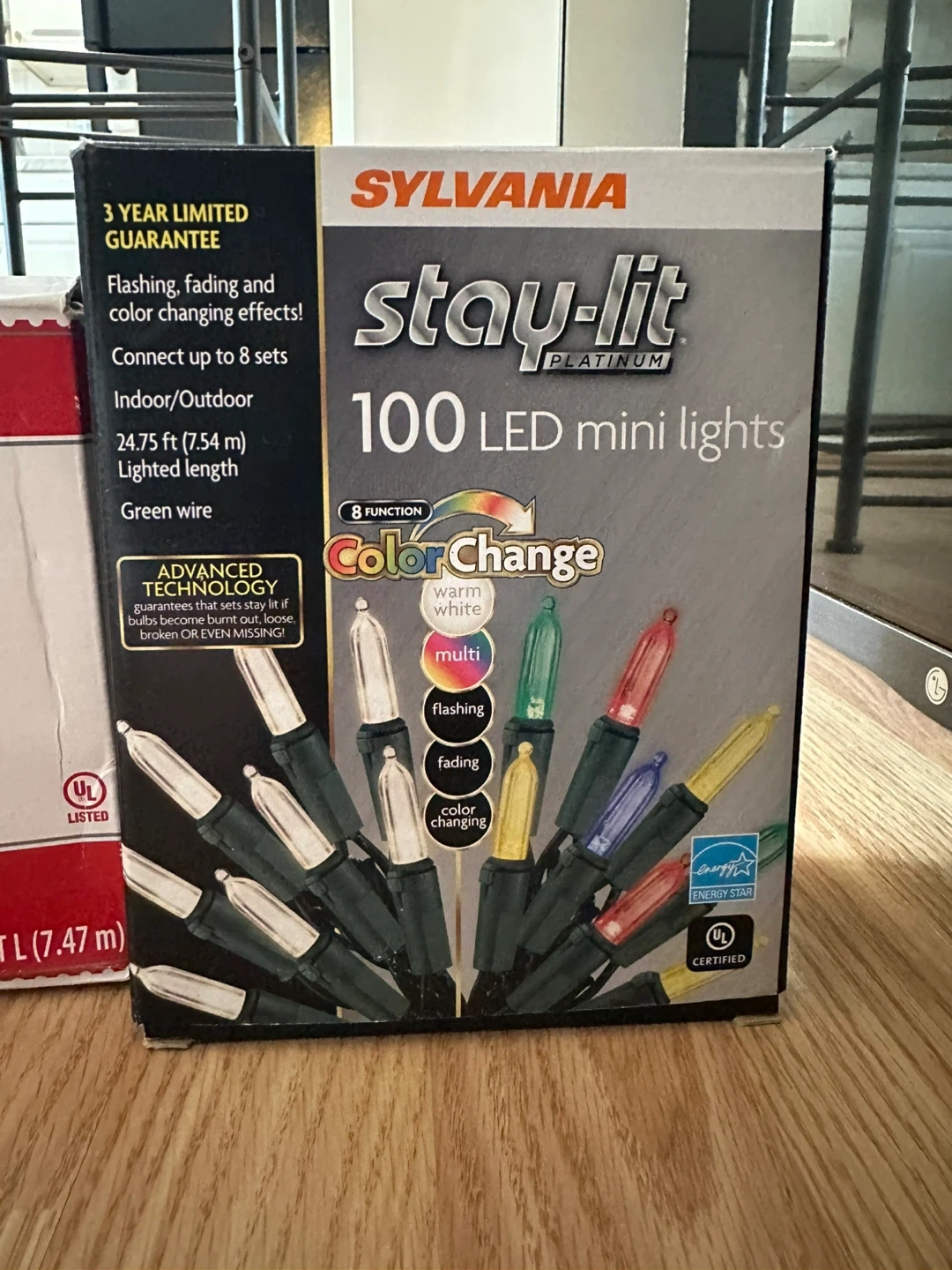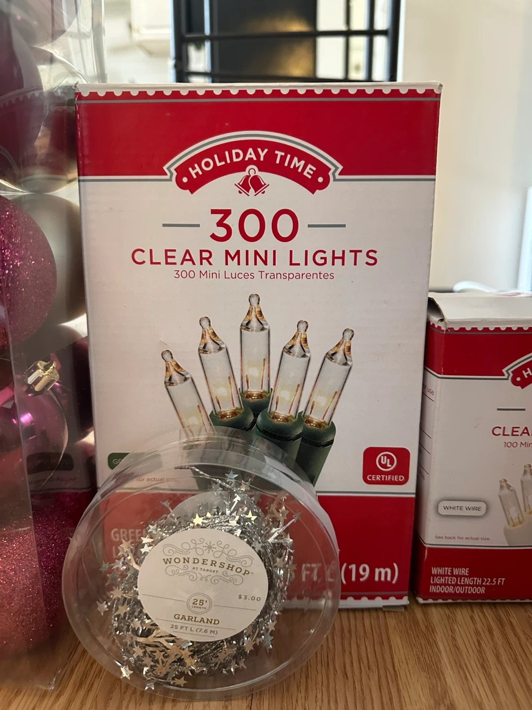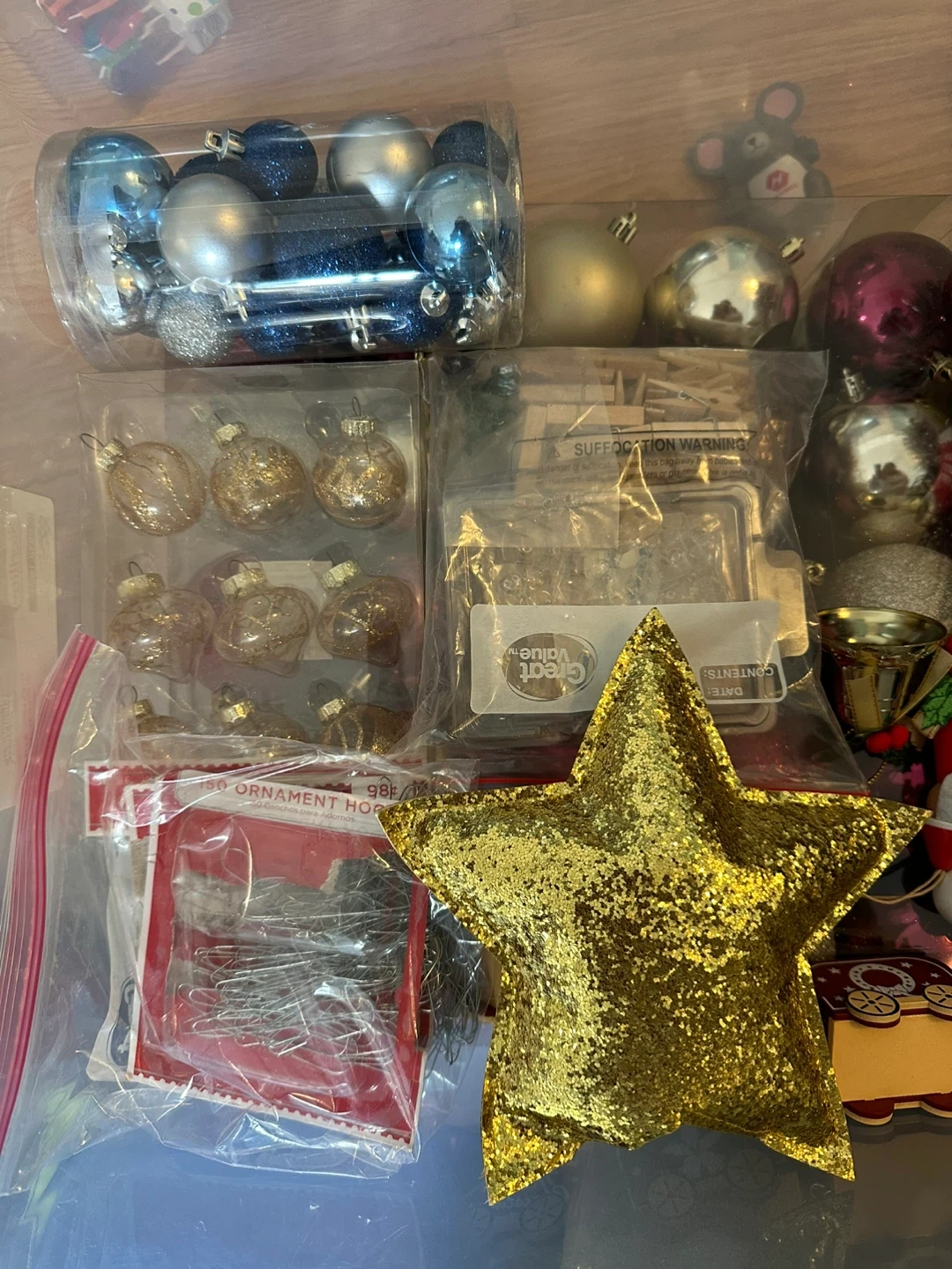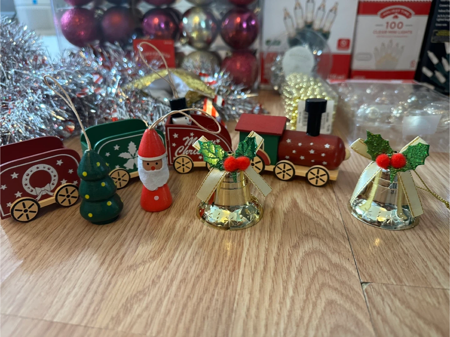 91Christmas tree was used once along with some of the other items. The lights in the tree works as well as all the other lights. Bundle includes: 3ft pre-lit Christmas tree 300 ct lights 100 ct lights 100 ct color changing lights Another set of lights (don’t know the count) 40 large ornament balls 20 mini blue ornament balls 9 mini clear and gold ornaments Ornament hooks Replacement bulbs for the lights Mini wood clips Command strip hooks for attaching lights to walls Gold star topper Gold bead garland Silver star garland Silver candy cane garland 2 bell ornaments 1 Santa ornament 1 snowman ornament 1 Christmas tree ornament 1 mini wooden train