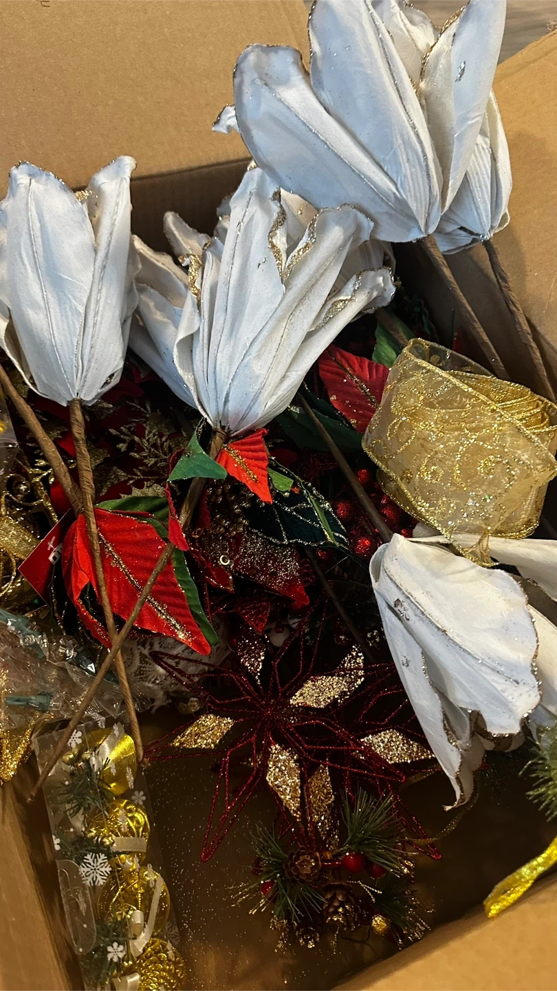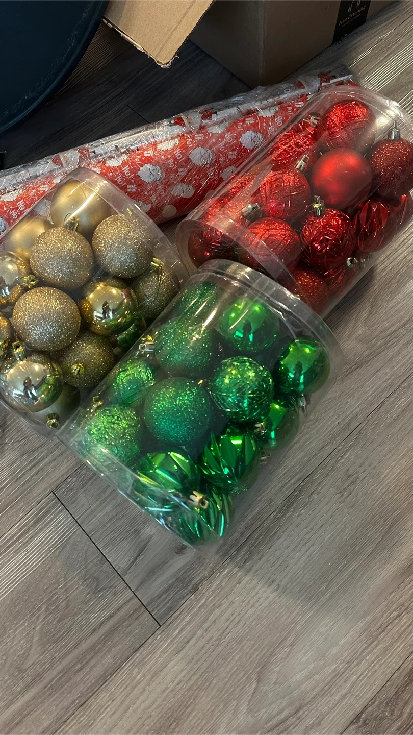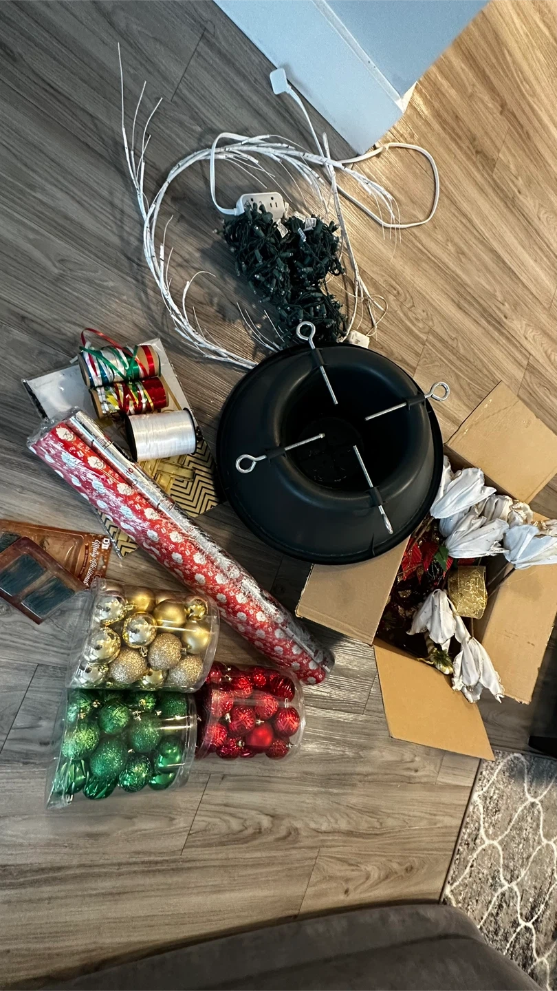 - Christmas tree stand - Multiple rolls of wrapping paper and ribbons - Sets of colorful ornaments (red, green, gold – glitter and shiny styles) - 3 Christmas lights and decorative branches - Box of assorted festive decorations and garlands All items in good condition, gently used for one season. Perfect for someone starting their Christmas collection or looking to refresh their decor! Selling because we are moving.