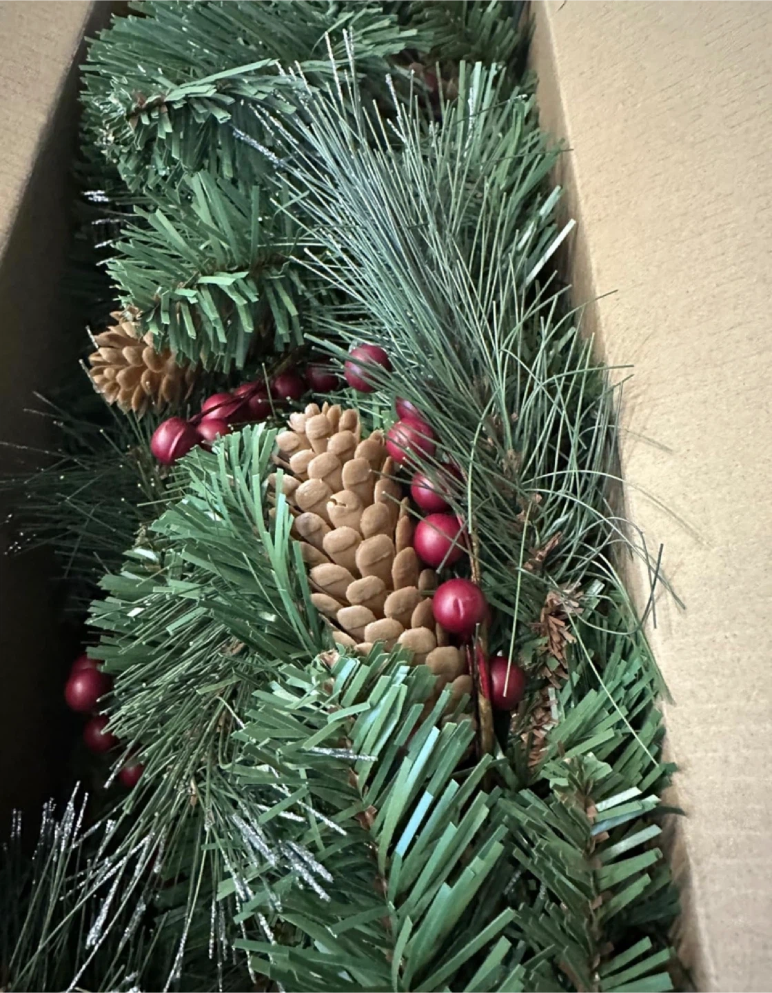 Selling a festive Christmas garland! It features realistic green pine needles, pinecones, and red berries. Perfect for adding a touch of holiday cheer to your home this season. It’s battery powered