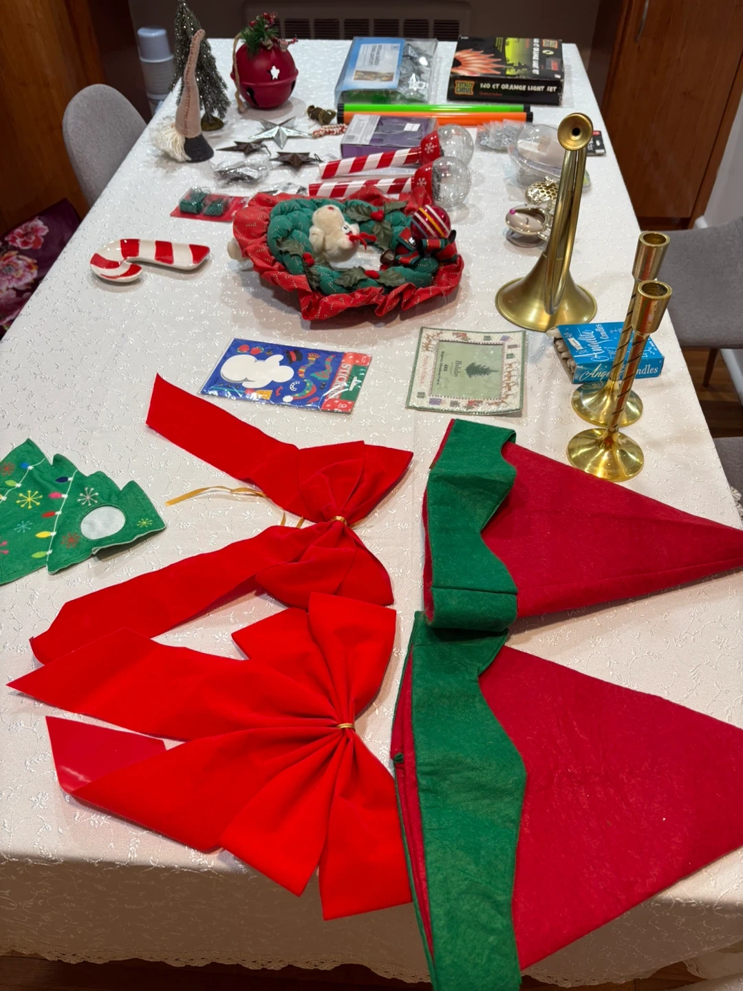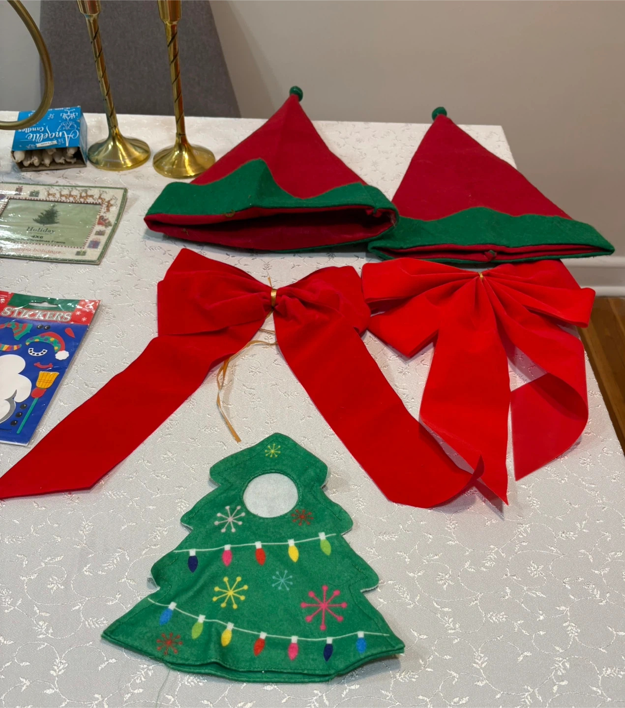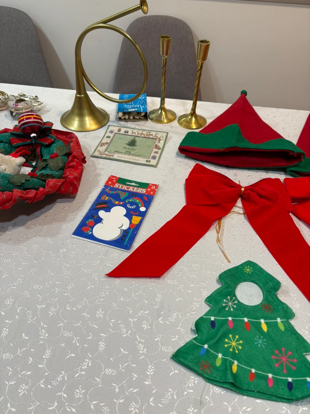 15I have a lot of Christmas and holiday decor items for sale. Includes elf hats, bows, a Christmas tree decoration, and other festive items. Perfect for adding some holiday cheer to your home!