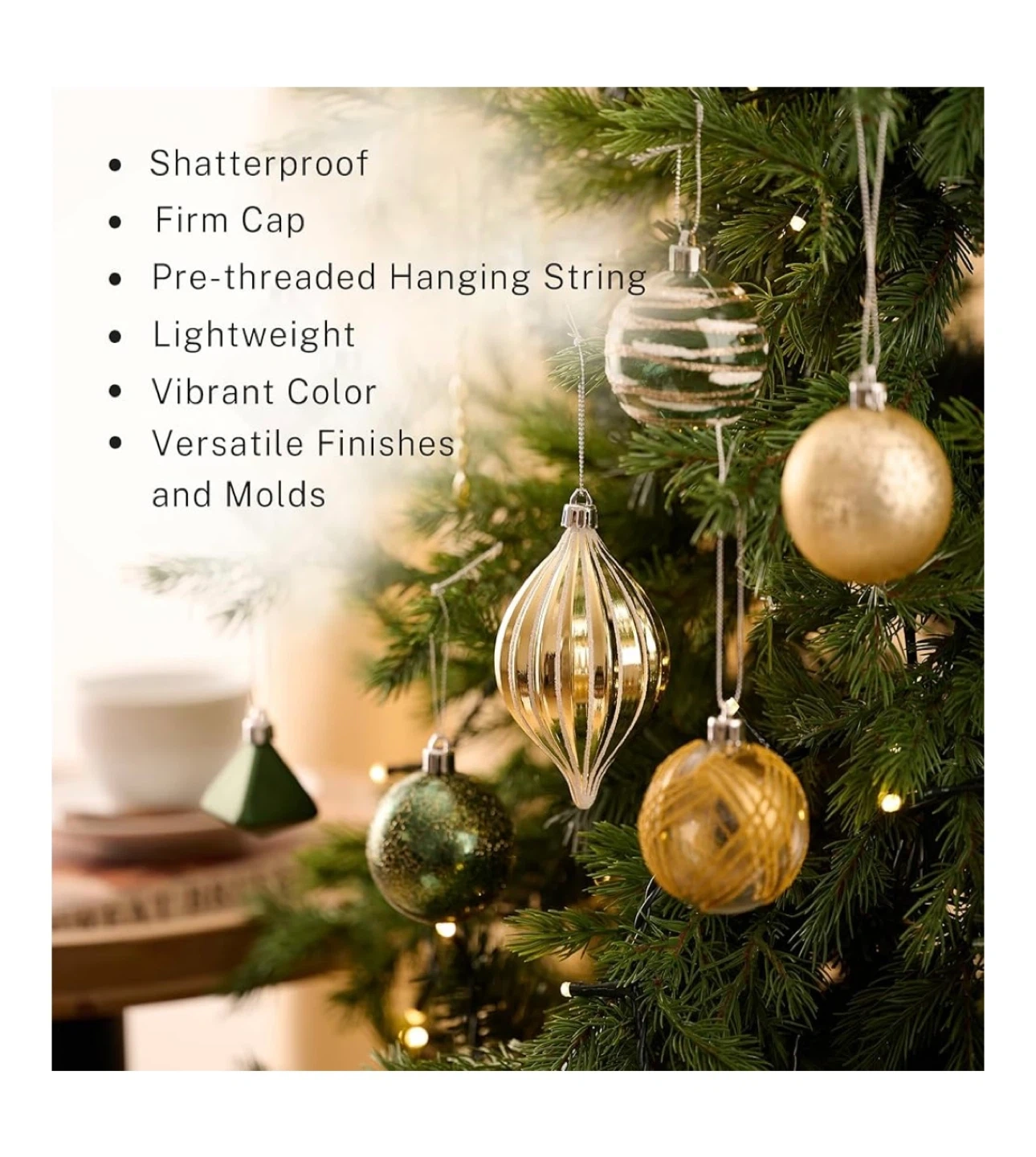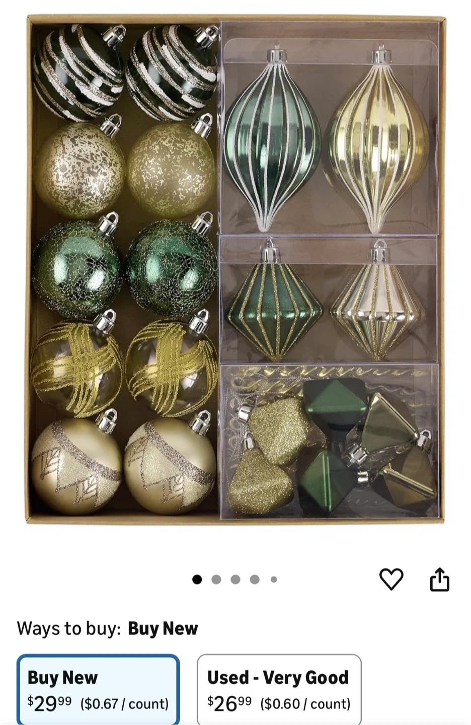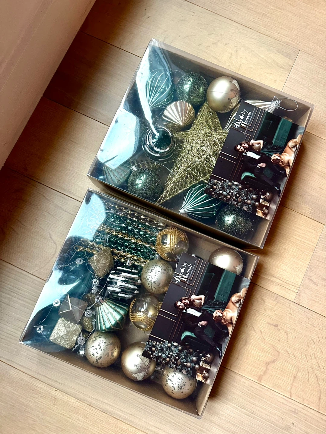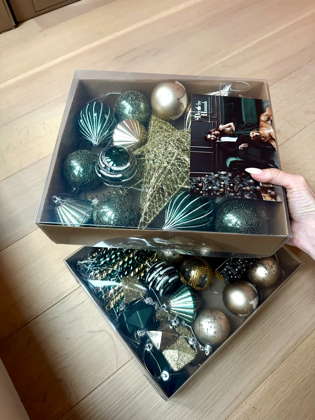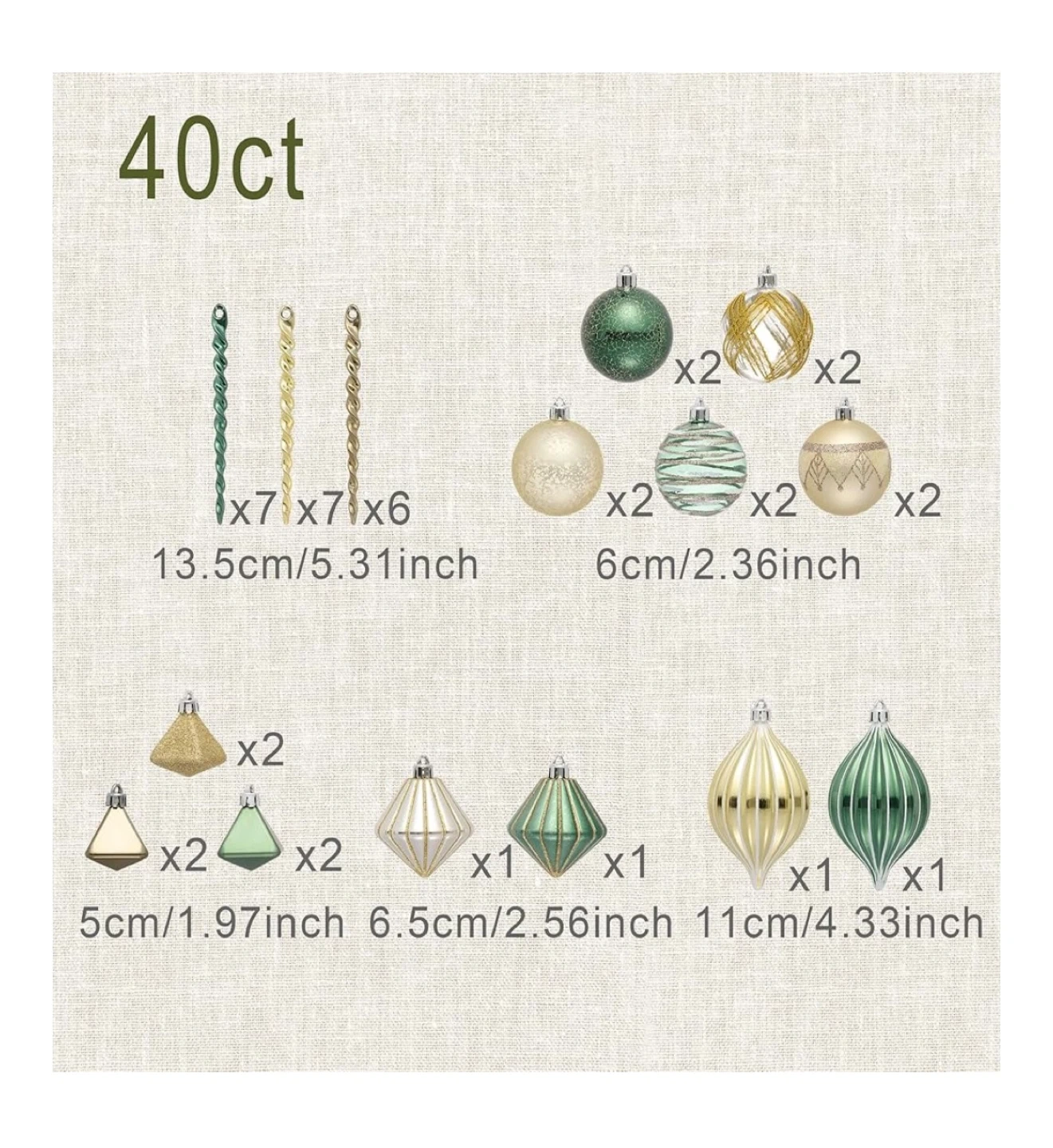 Selling 2 SETS of 40-piece Christmas ornament (green & gold)! The set includes a variety of shapes and finishes. Selling also a Gold Star. All used only for one Christmas, everything looks like new.