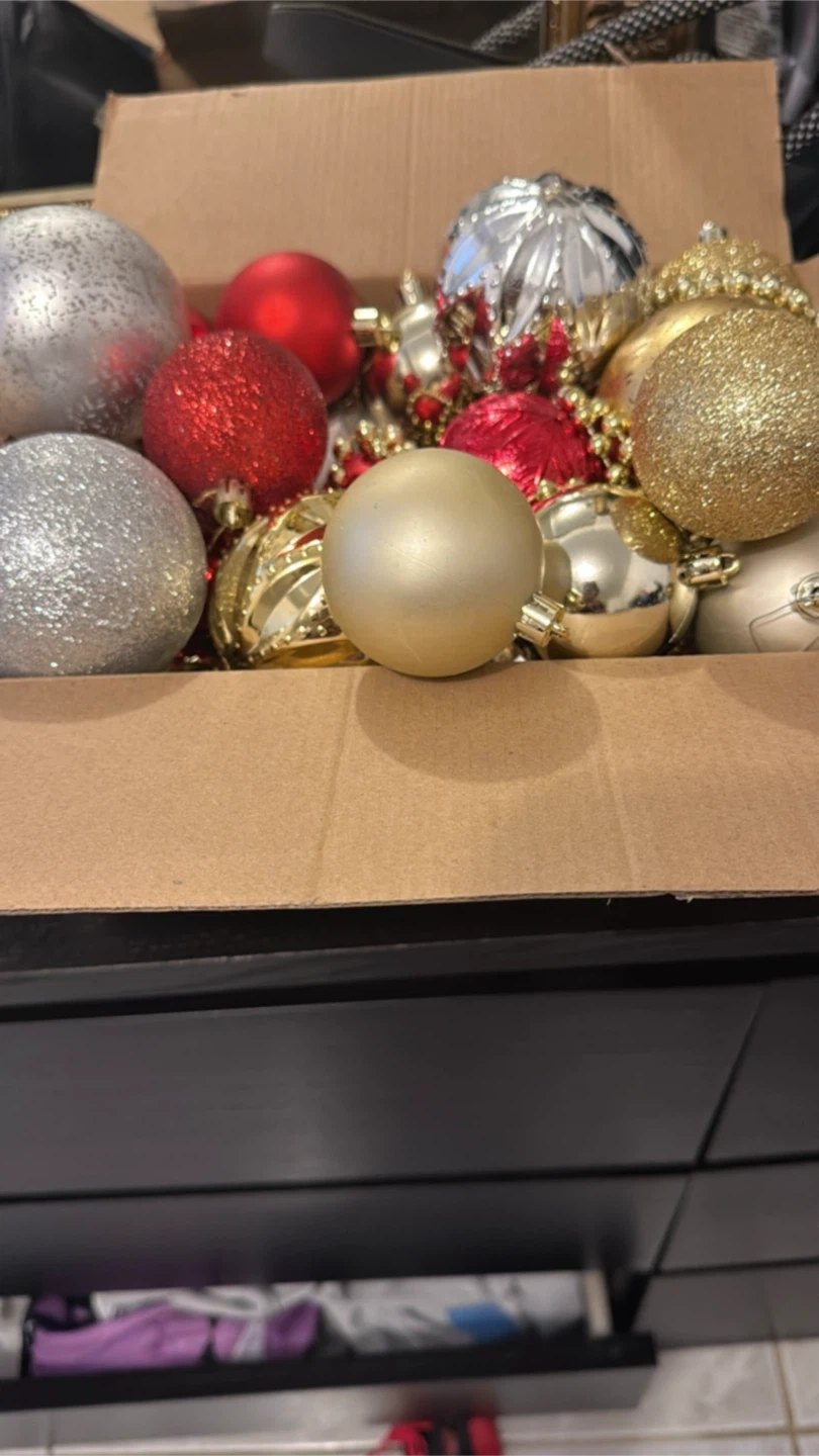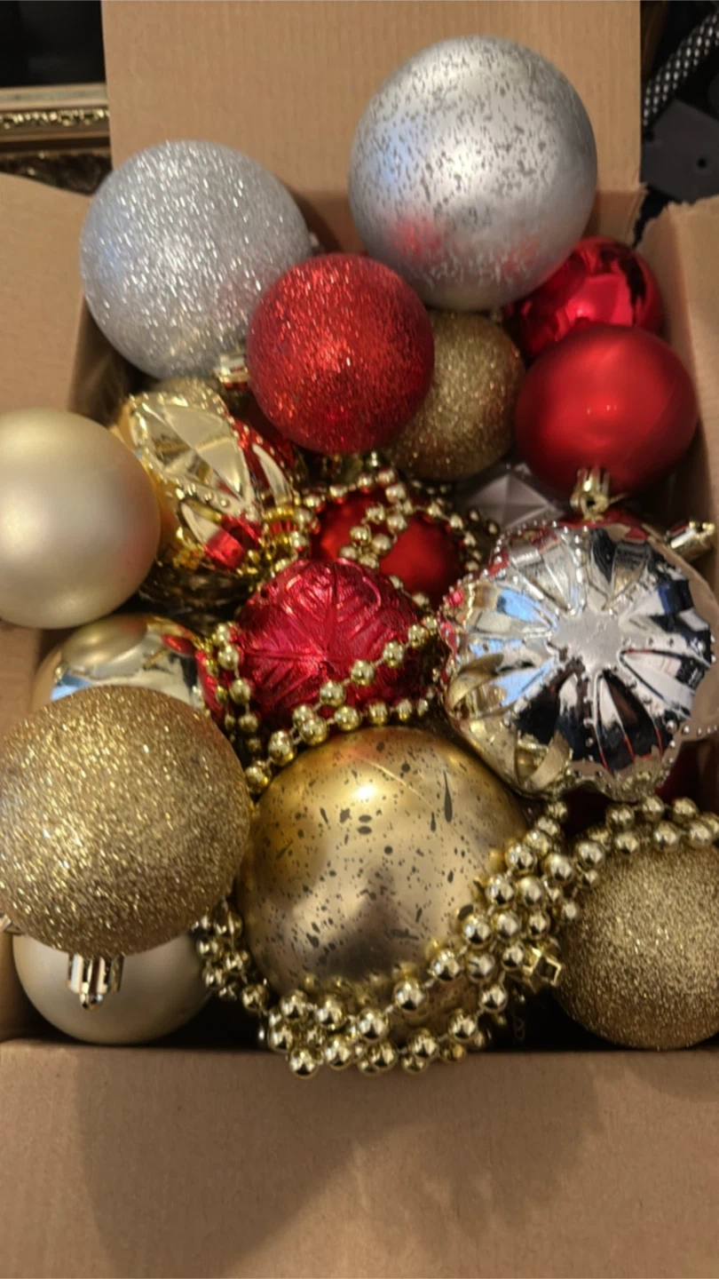 211Selling a box of assorted Christmas ornaments! There are various colors and styles, perfect for decorating your tree or home this holiday season