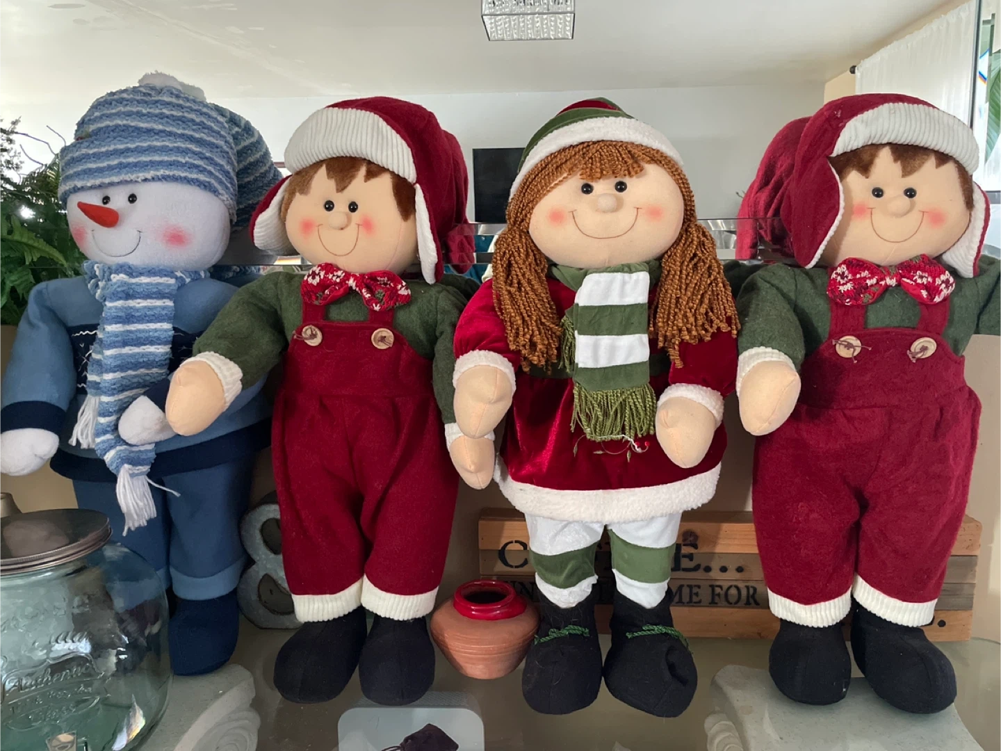 23Set of 4 Christmas-themed plush dolls! These festive dolls are perfect for adding a touch of holiday cheer to your home. They feature classic Christmas characters like a snowman and children dressed in holiday attire. They are like new and ready to bring some joy to your space.