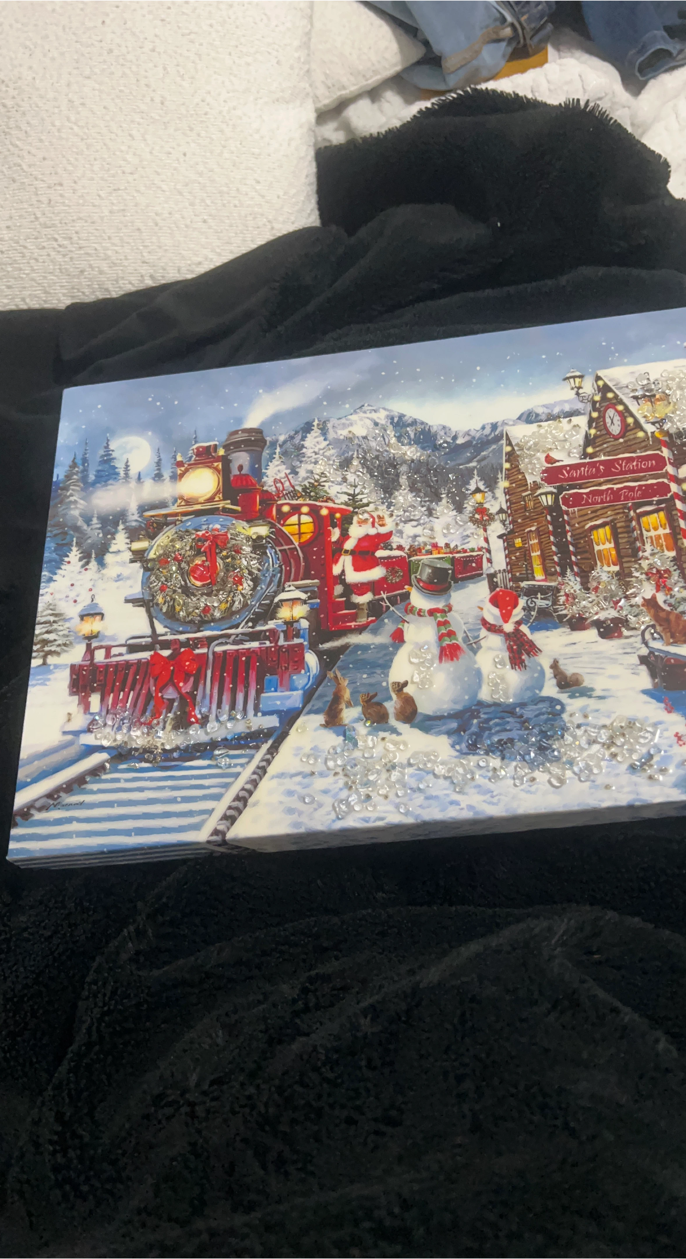 10I'm selling a Christmas train canvas wall art. It features a festive scene with a train, snowmen, and Santa's Station. The canvas is decorated with glittery accents to add a touch of sparkle to your holiday decor