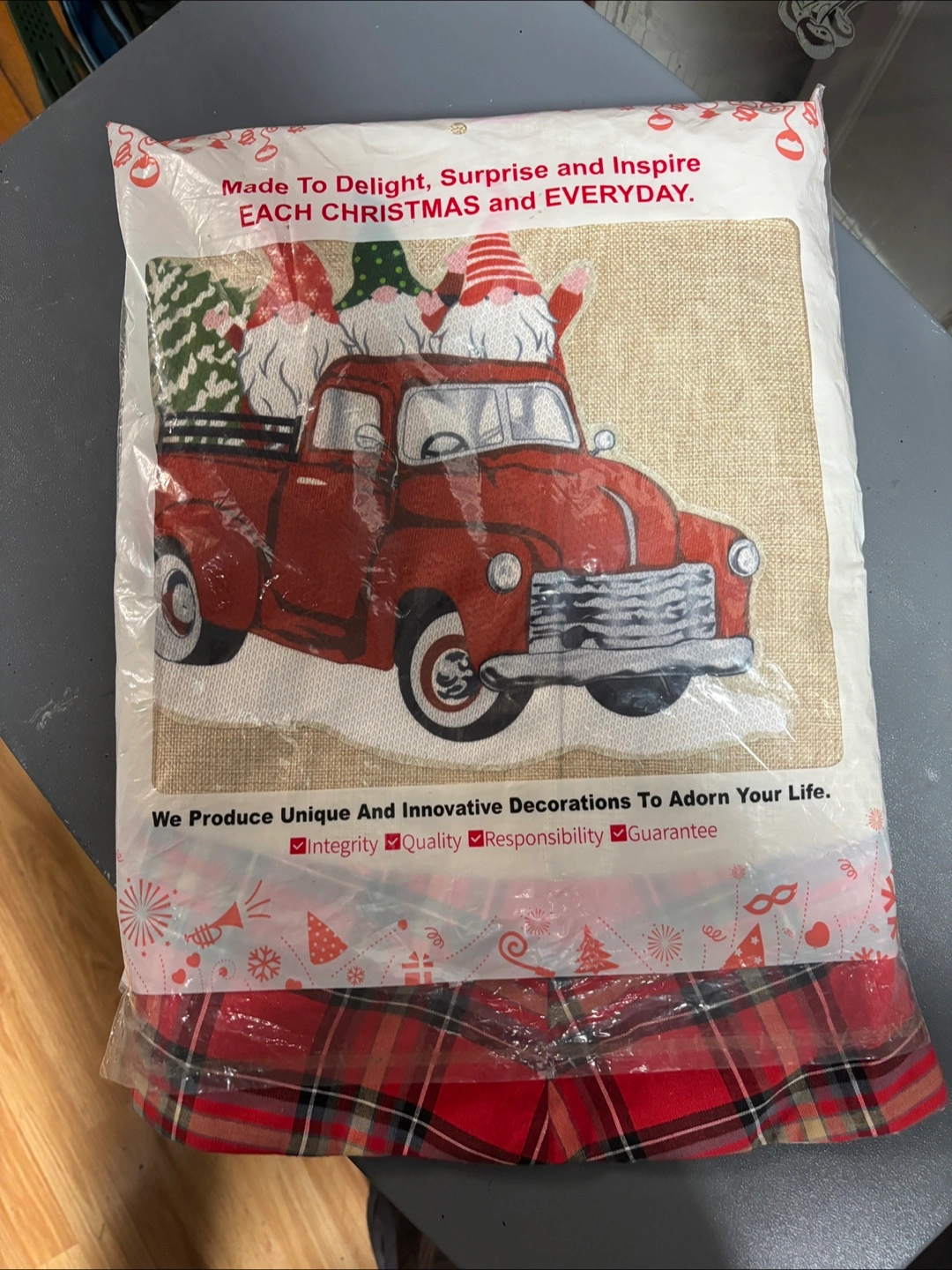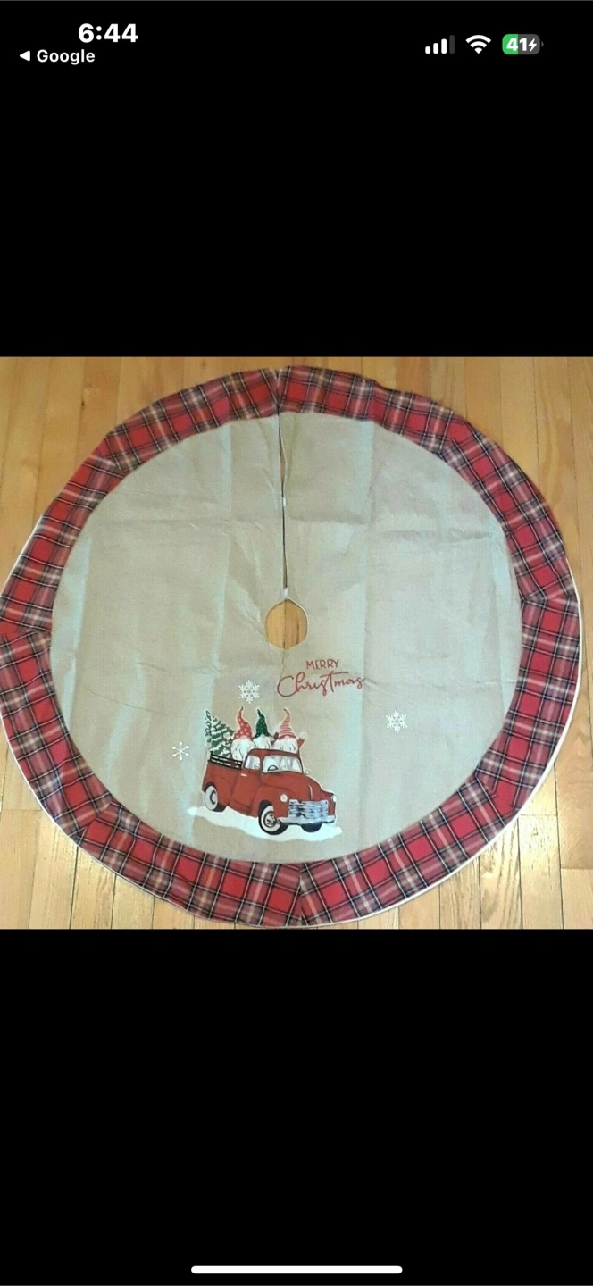 Add a festive touch to your holiday decor with this adorable Christmas tree skirt! It features a charming red truck design with gnomes, perfect for bringing a touch of whimsy to your Christmas tree. The skirt has a classic plaid trim that complements the design beautifully. It's in great condition and ready to spread some holiday cheer