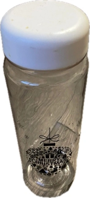 Clear plastic water bottle with a white lid. Has a Merry Christmas design on the bottom half. I want to give for someone who prepare to the holy Christmas 🎄 Happy Christmas earlier at here Karrot 🥕❣️