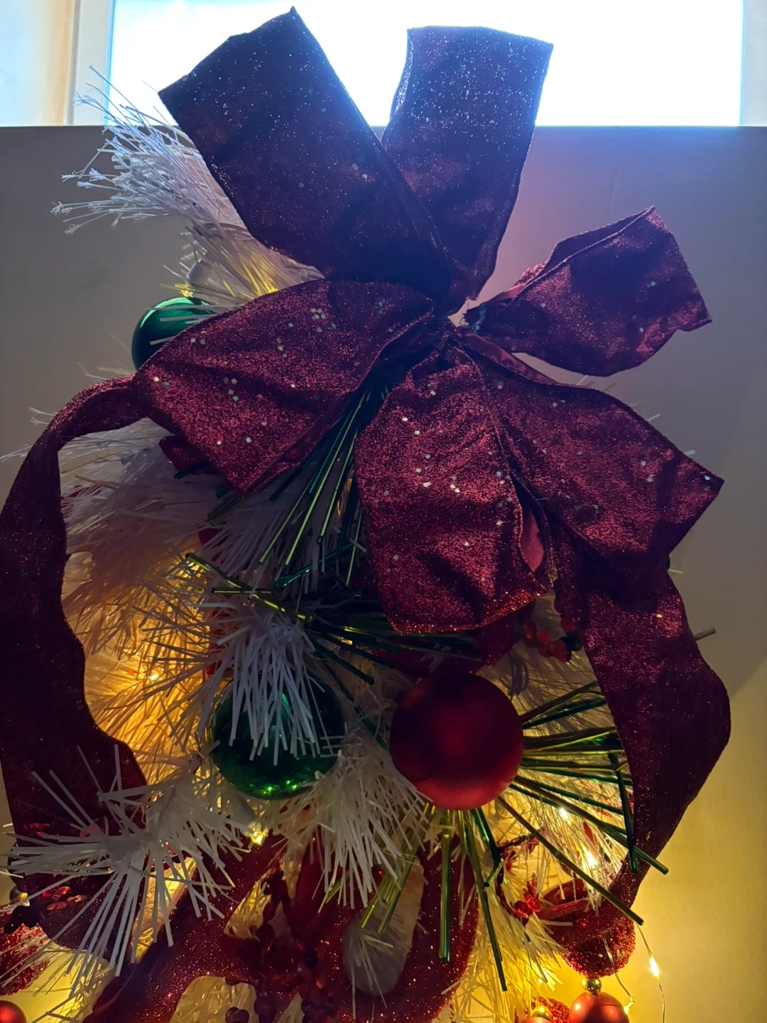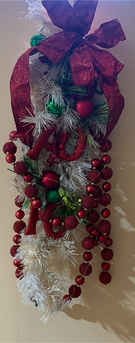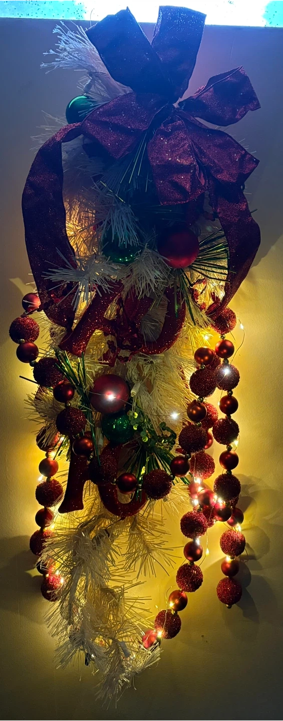 Festive Christmas wreath ready to brighten up your home! It features a mix of red and green ornaments, a sparkly bow, and warm white lights. Perfect for adding a touch of holiday cheer to your door or wall High about 35 “
