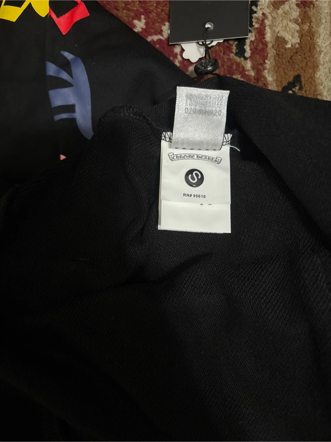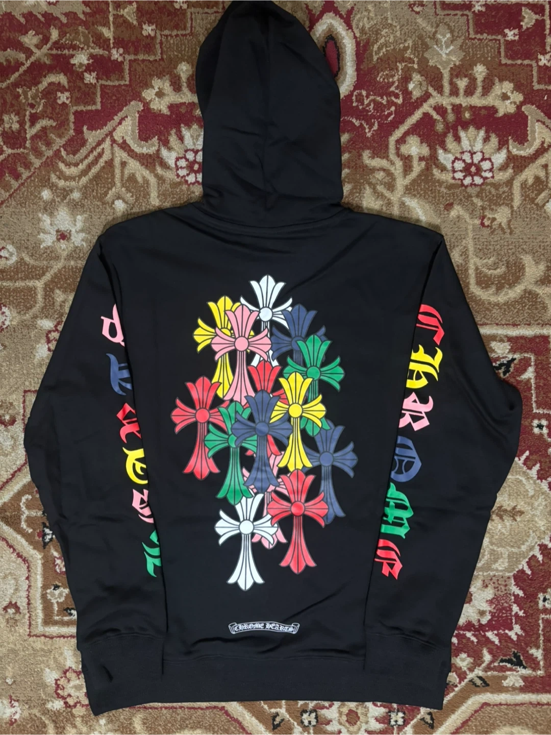 20Selling a Chrome Hearts black hoodie in size small. It features colorful cross designs on the sleeves and back. The hoodie is in new condition with tags still attached!