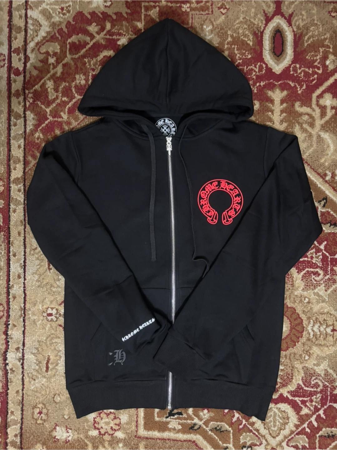 20Selling a Chrome Hearts black zip-up hoodie in size S. It features the classic Chrome Hearts logo and design details. The hoodie is in great condition and ready for a new home! The material feels comfortable and high-quality.