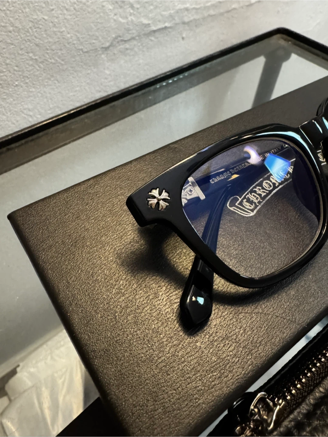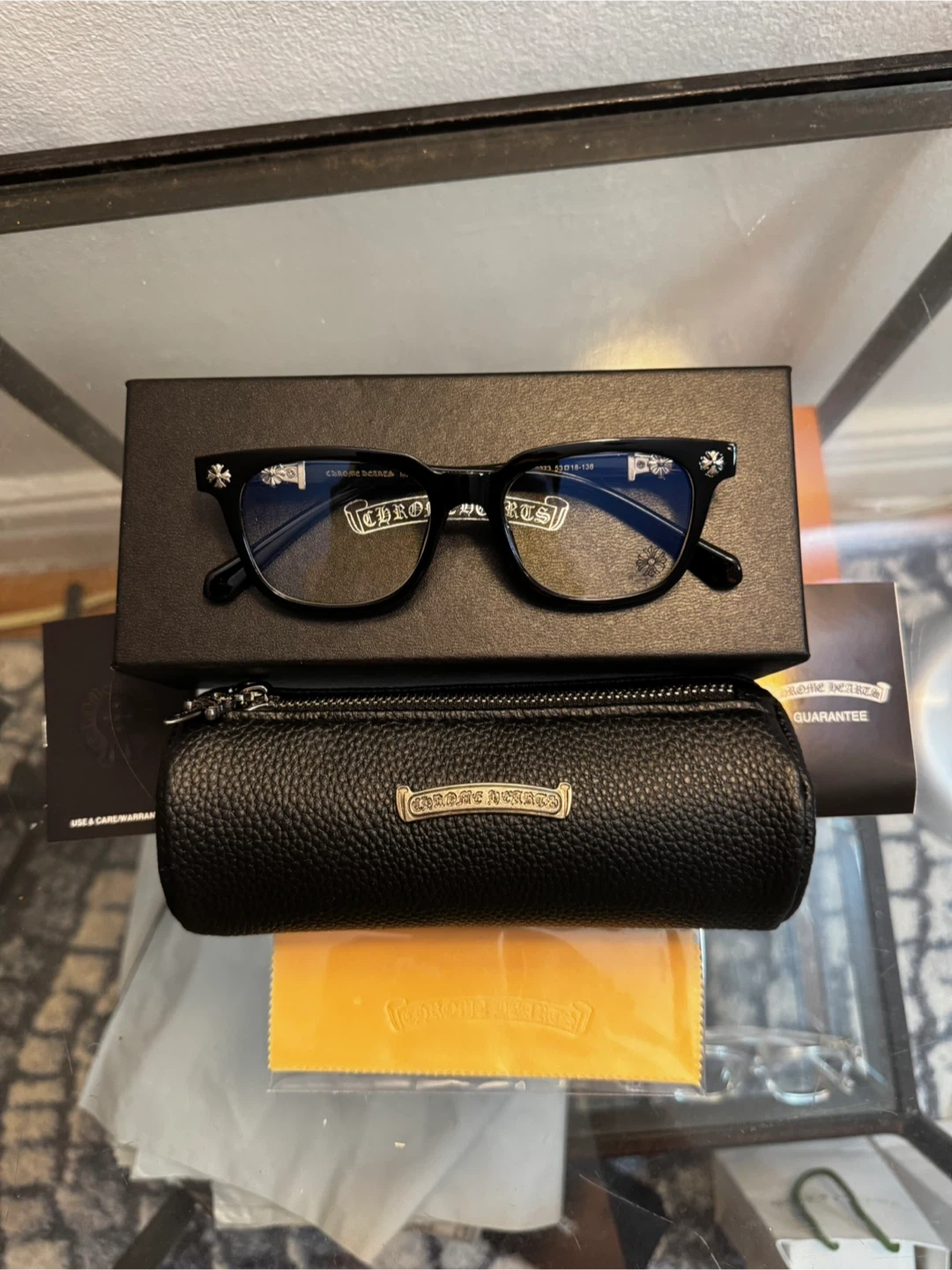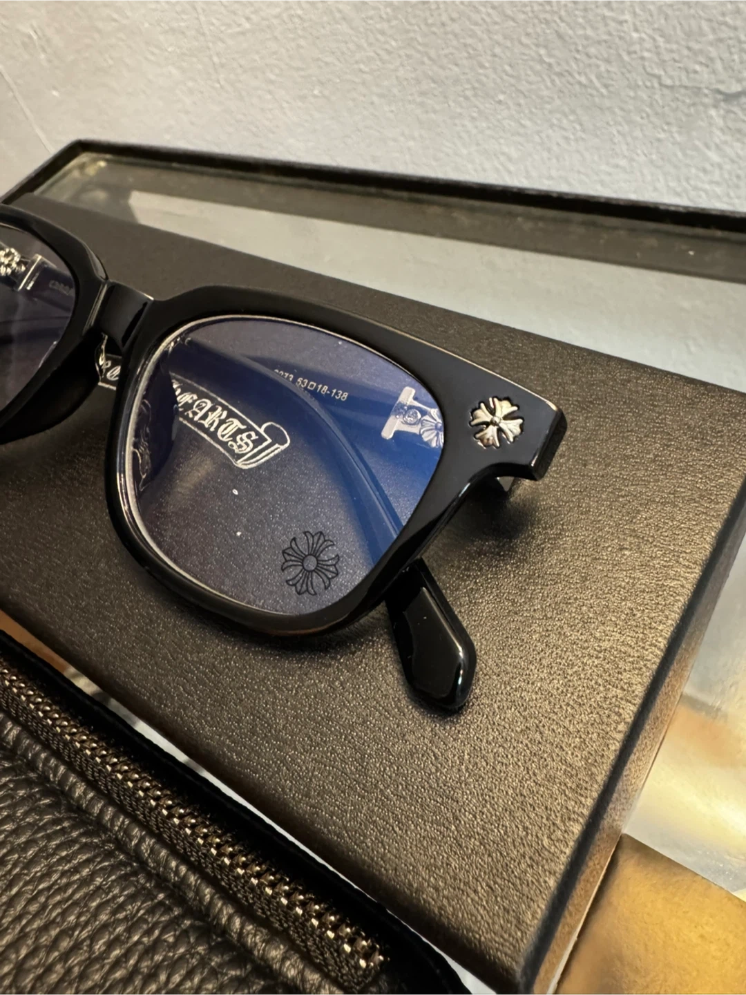 10Selling a pair of Chrome Hearts eyeglasses in black. They come with the original box, case, and cleaning cloth. The size is 53-18-138. These glasses are in great condition and ready for a new home!