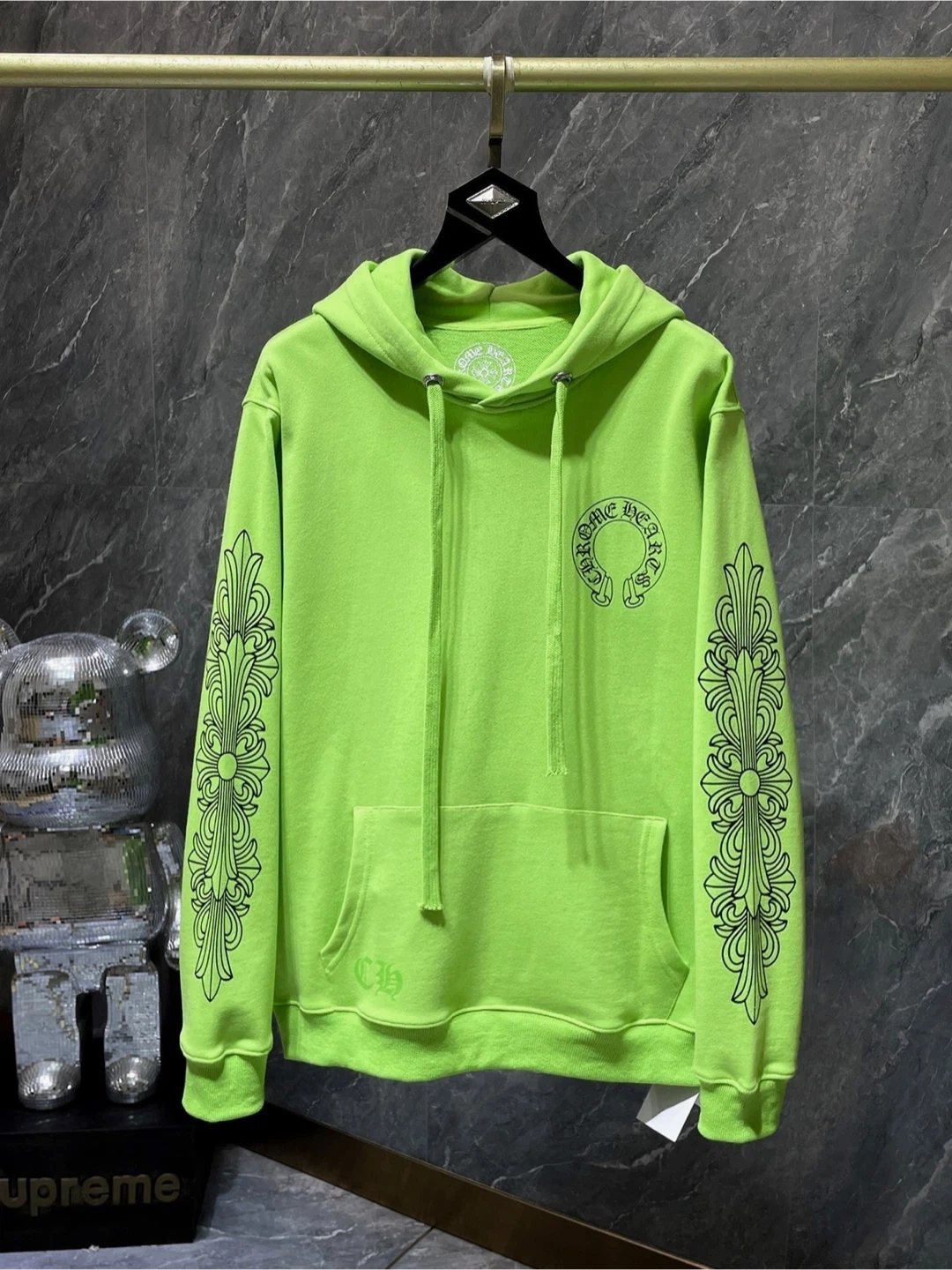 Selling a Chrome Hearts hoodie in a vibrant green color! It features the signature Chrome Hearts cross design on the sleeves and back. The hoodie is in great condition and ready for a new home