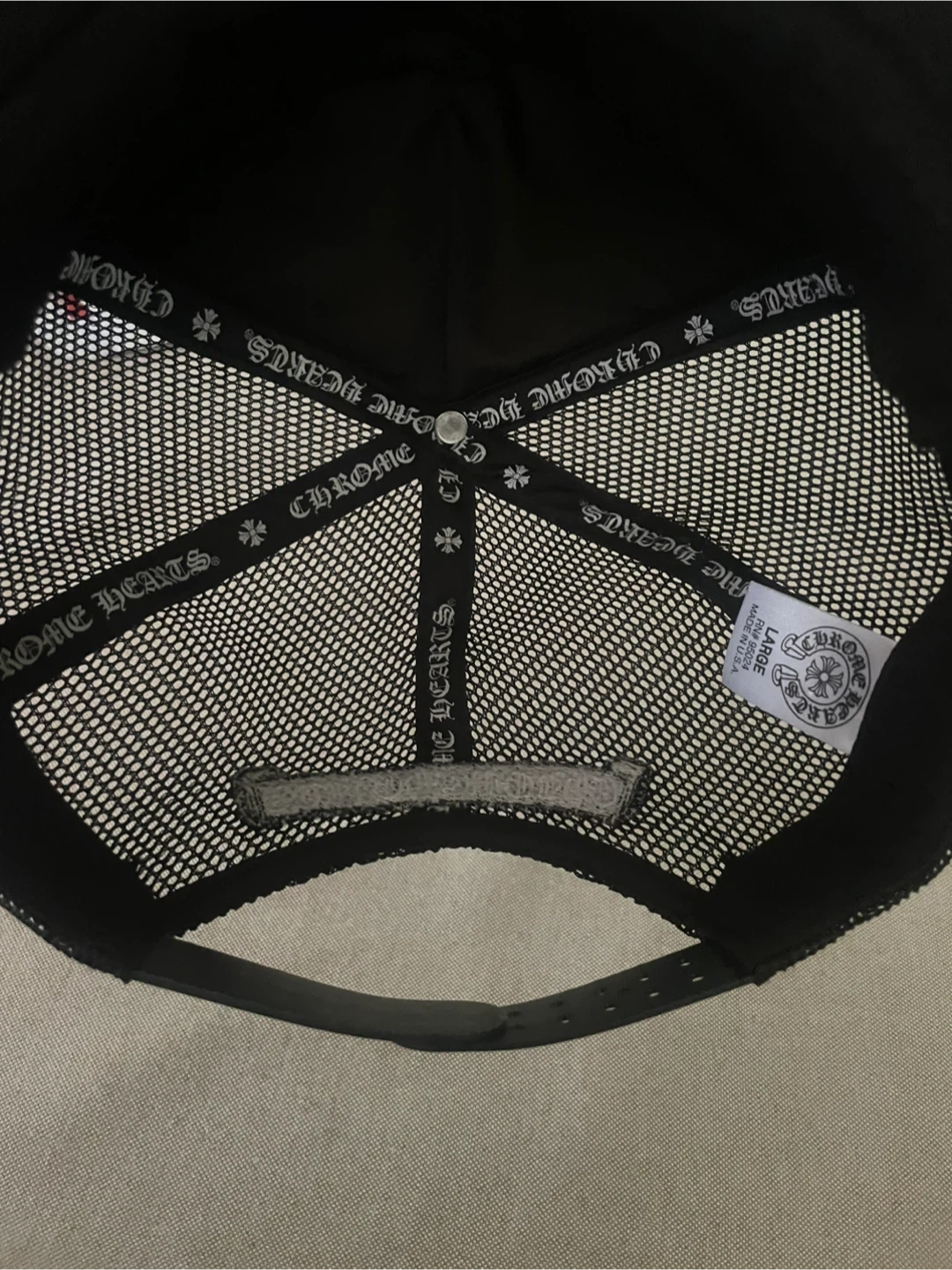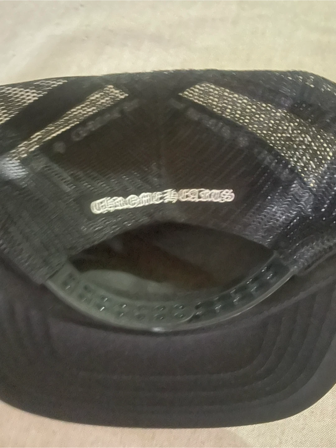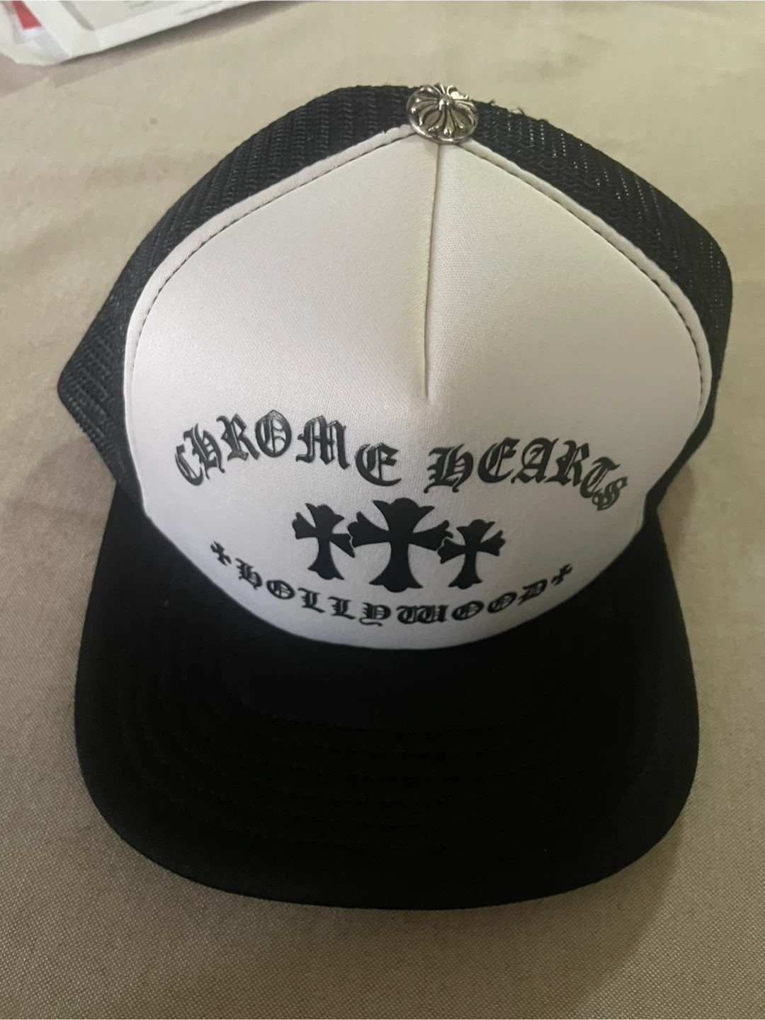 Selling a Chrome Hearts trucker hat in black and white. It's in great condition and has the classic Chrome Hearts logo. The back is a mesh material, and the size is adjustable.