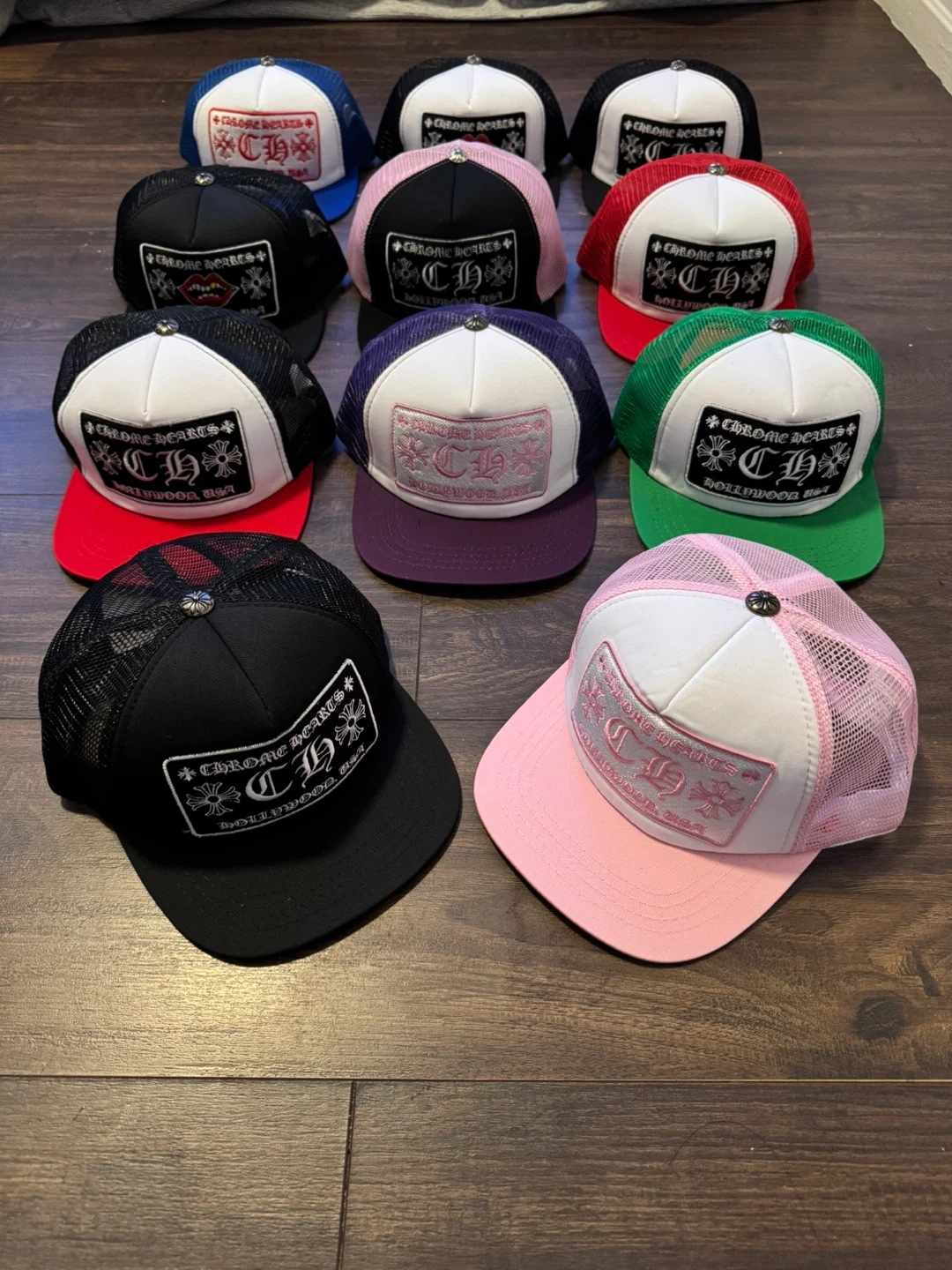 15Chrome Hearts trucker hats in various colors! Classic design with the iconic CH logo. Perfect for adding a touch of edgy style to any outfit