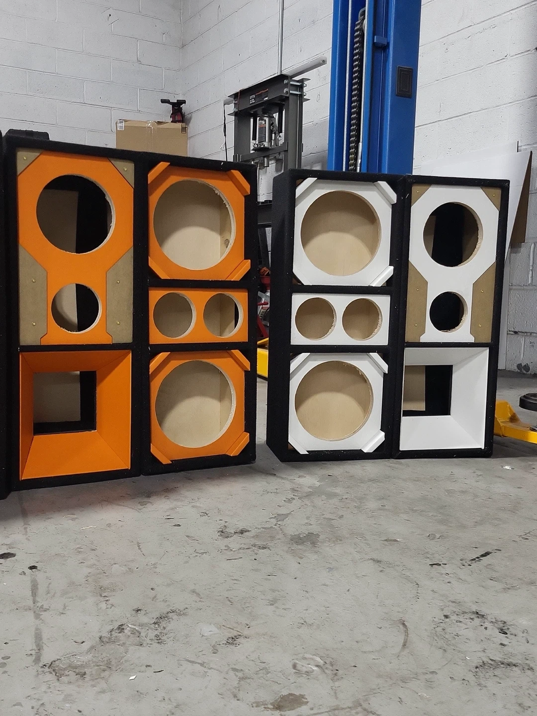 10I have a pair of custom-built speaker boxes for sale. One is painted orange and the other is white. They're in great shape and ready for your speakers!