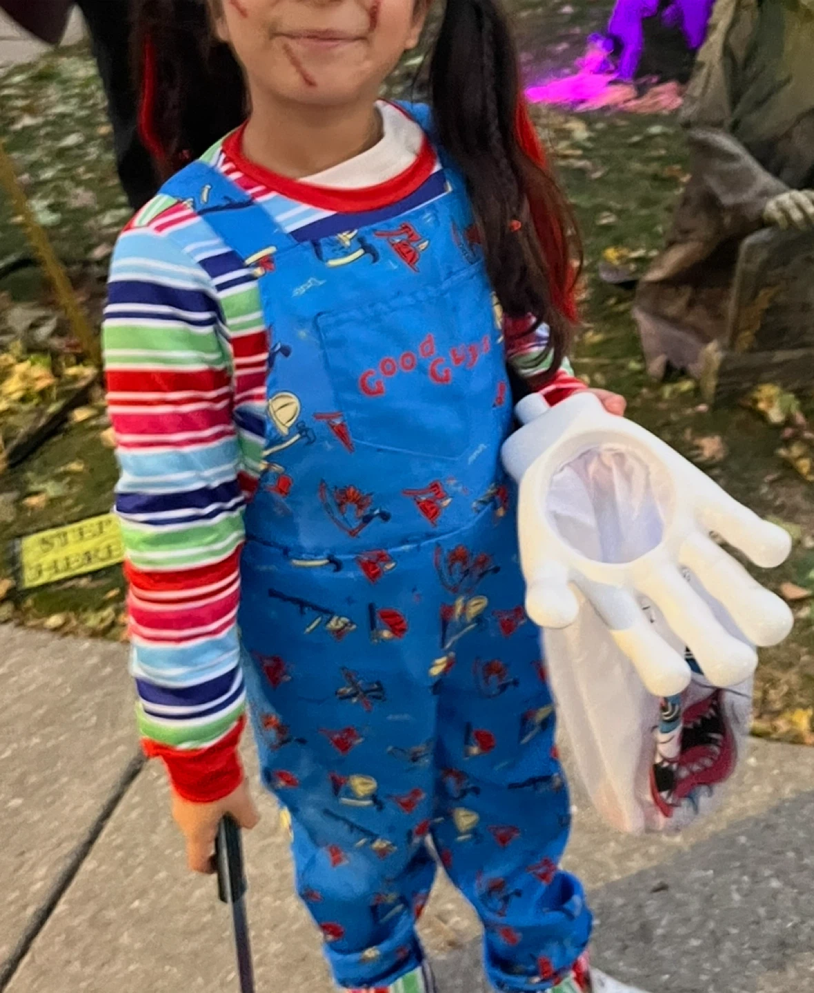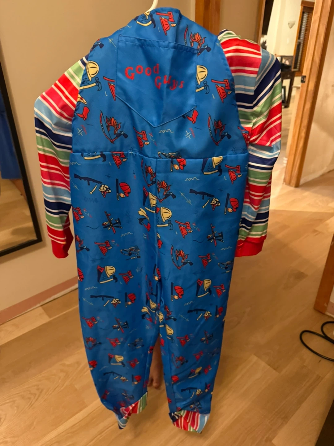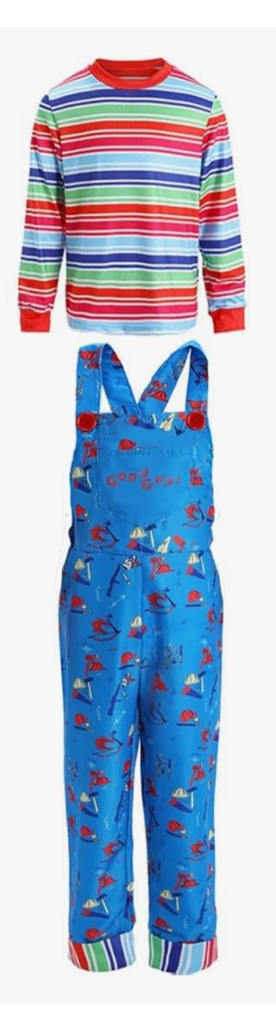 5Here's a Chucky costume for kids! It includes the striped long-sleeve shirt and the "Good Guys" overalls. Perfect for Halloween or dress-up! Size 6-7