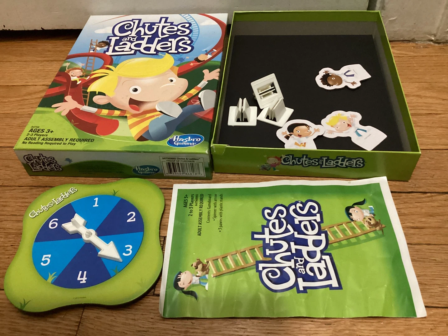 Selling a gently used Chutes and Ladders game by Hasbro! It's perfect for kids ages 3 and up and can be played with 2-3 players. Adult assembly is required, but no reading is needed to play. The box includes the gameboard, spinner with arrow, and 3 pawns with plastic stands