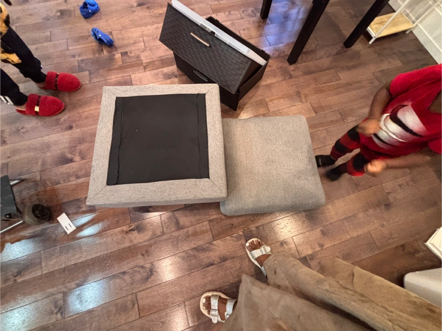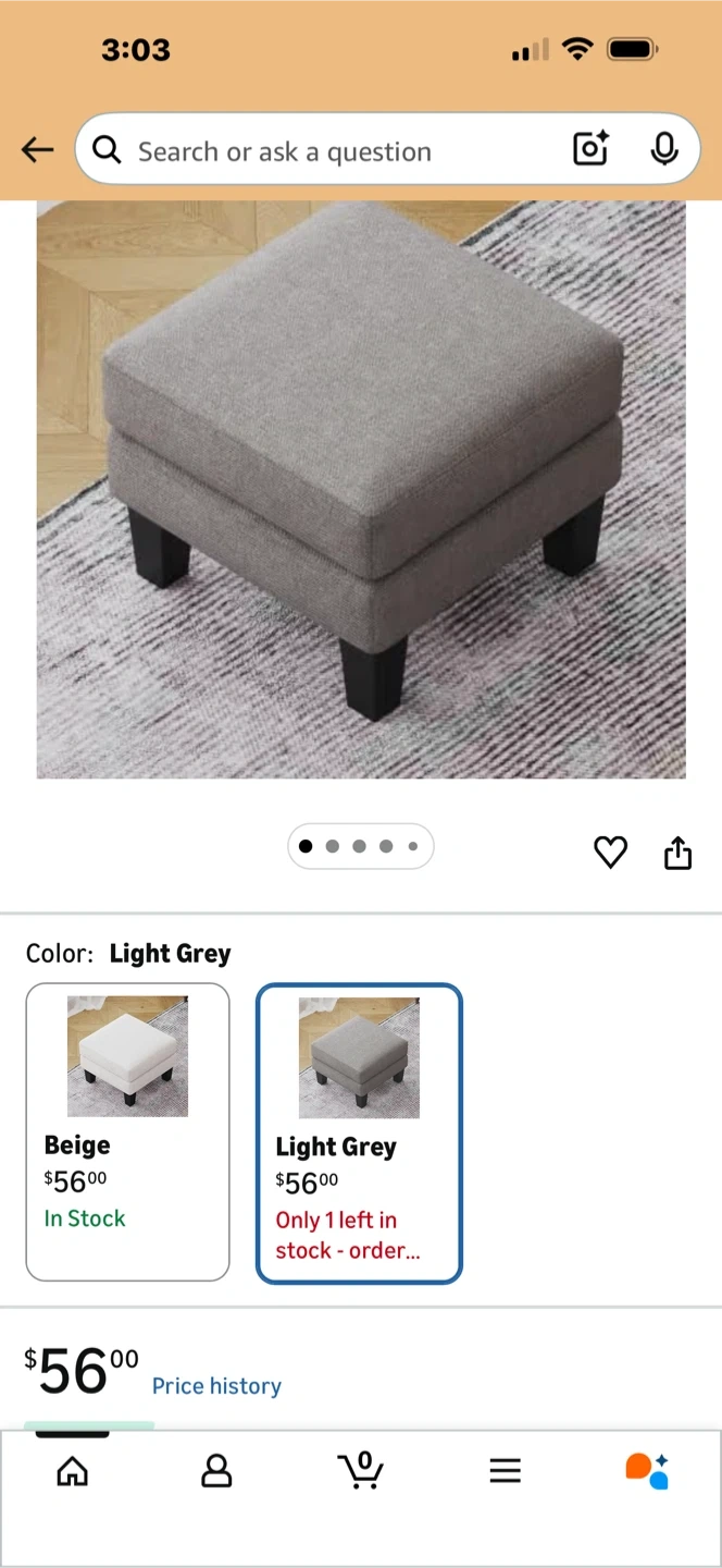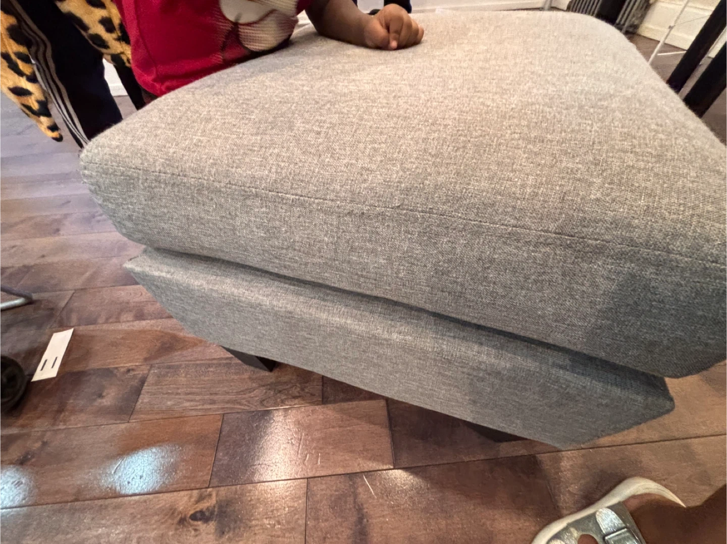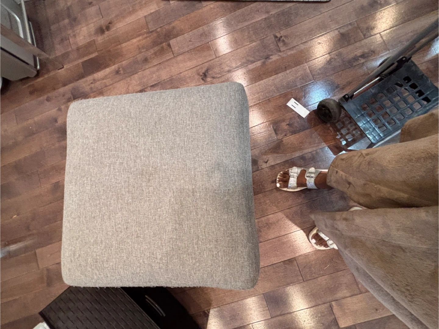 This light grey upholstered ottoman is perfect for resting your feet. It features a soft fabric finish and sturdy dark legs. Dimensions are approximately 18"x18"x16".
