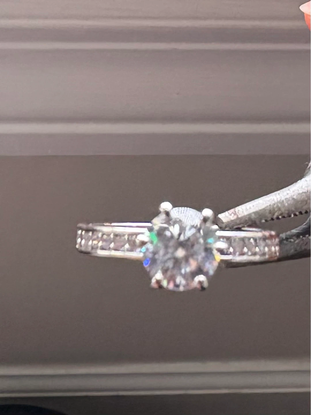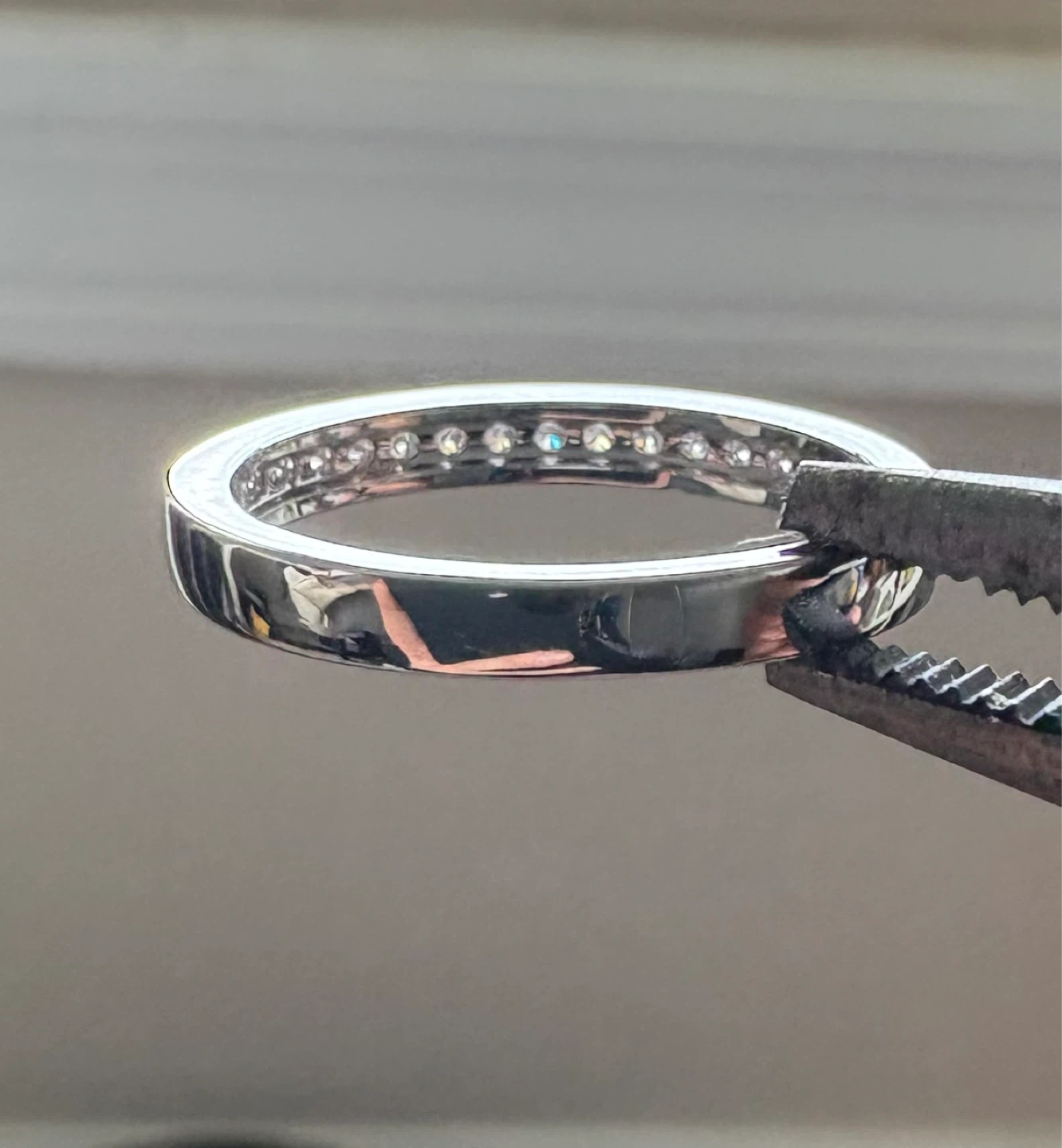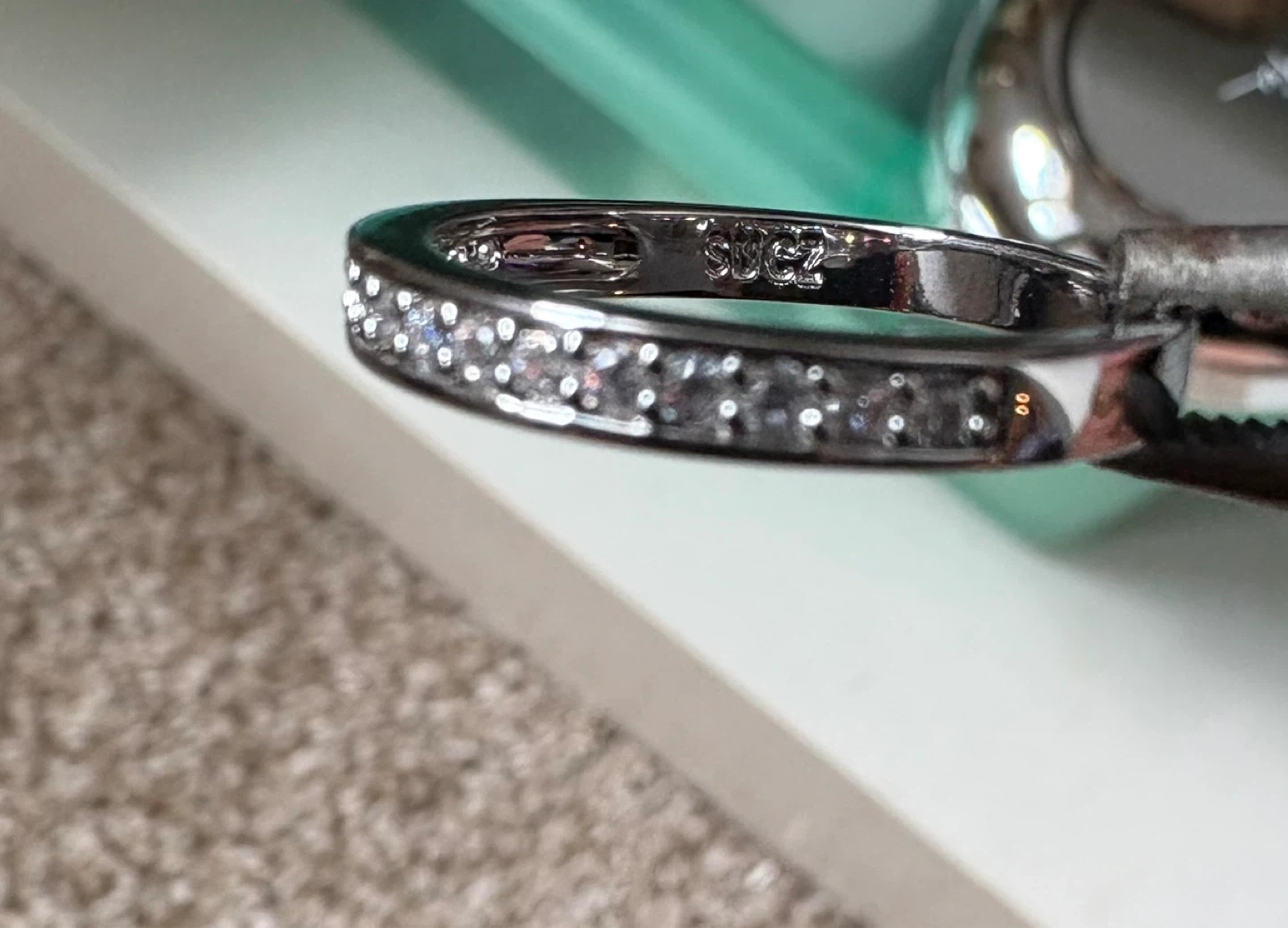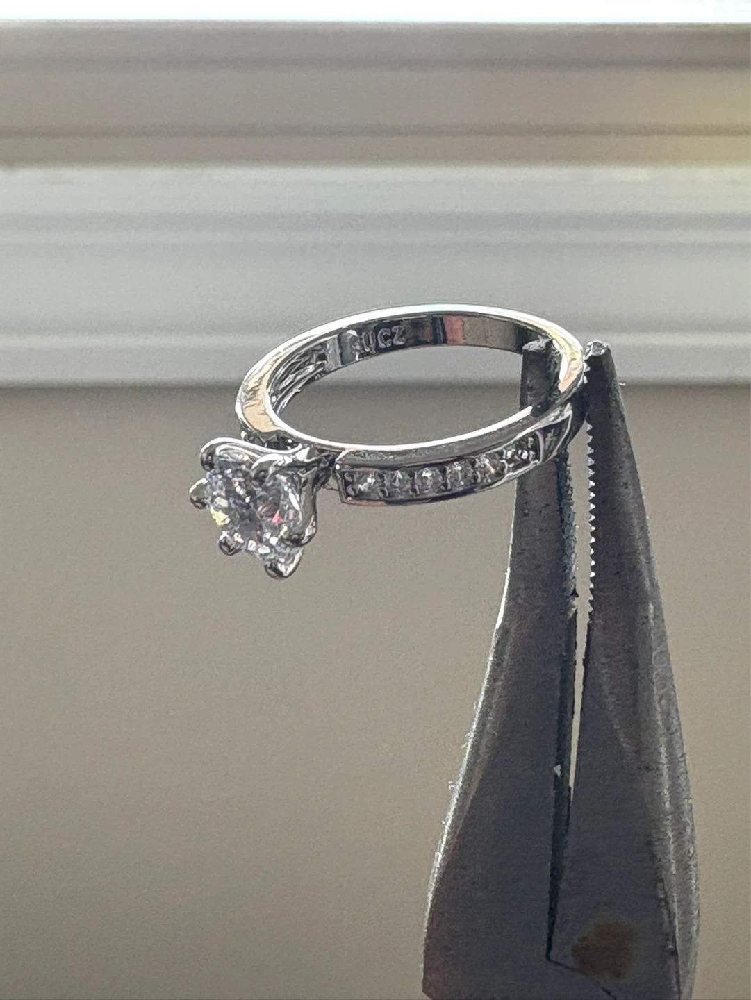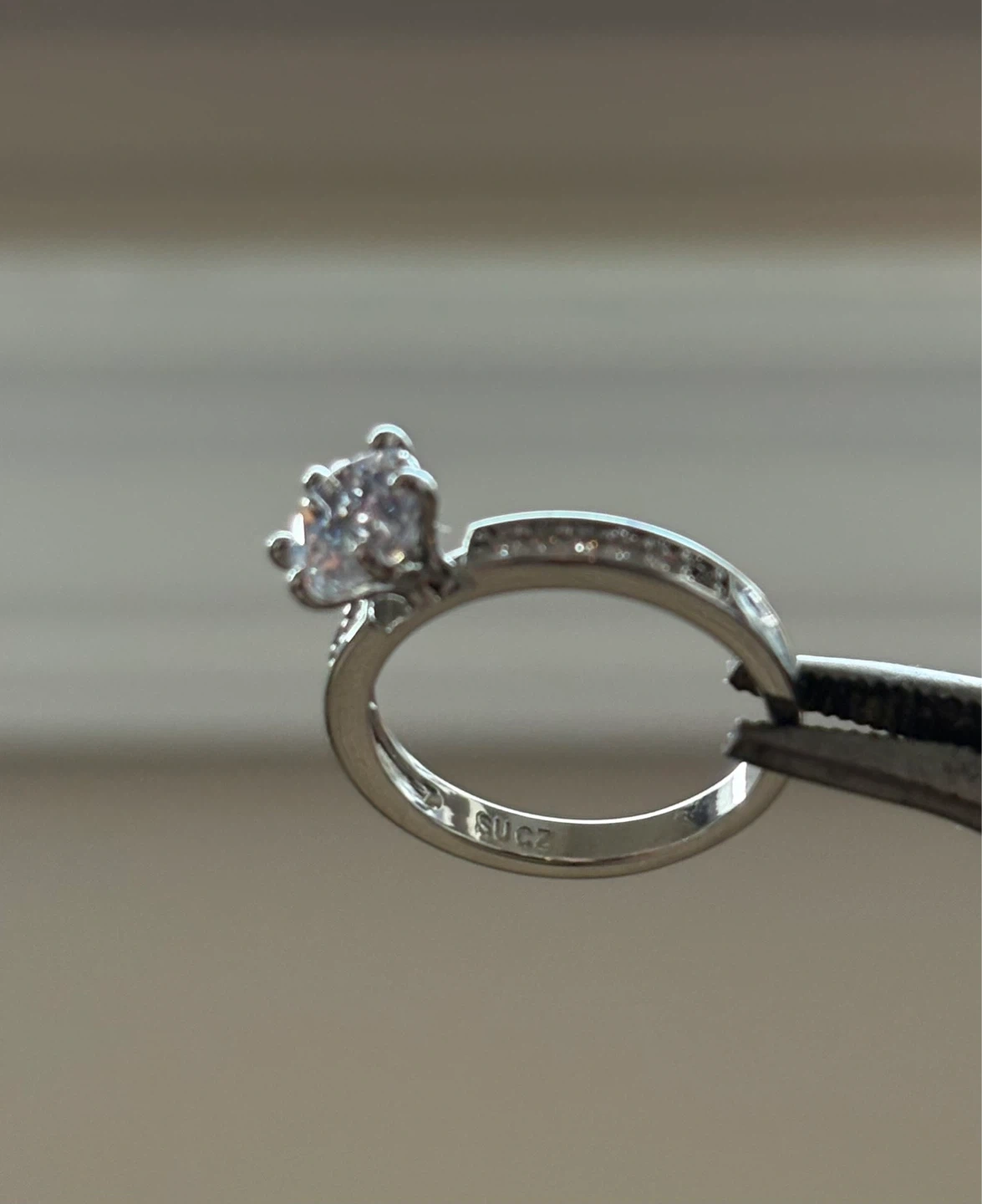 This ring features a central cubic zirconia stone with smaller stones set along the band. It's made of sterling silver. The band is stamped "SU CZ".