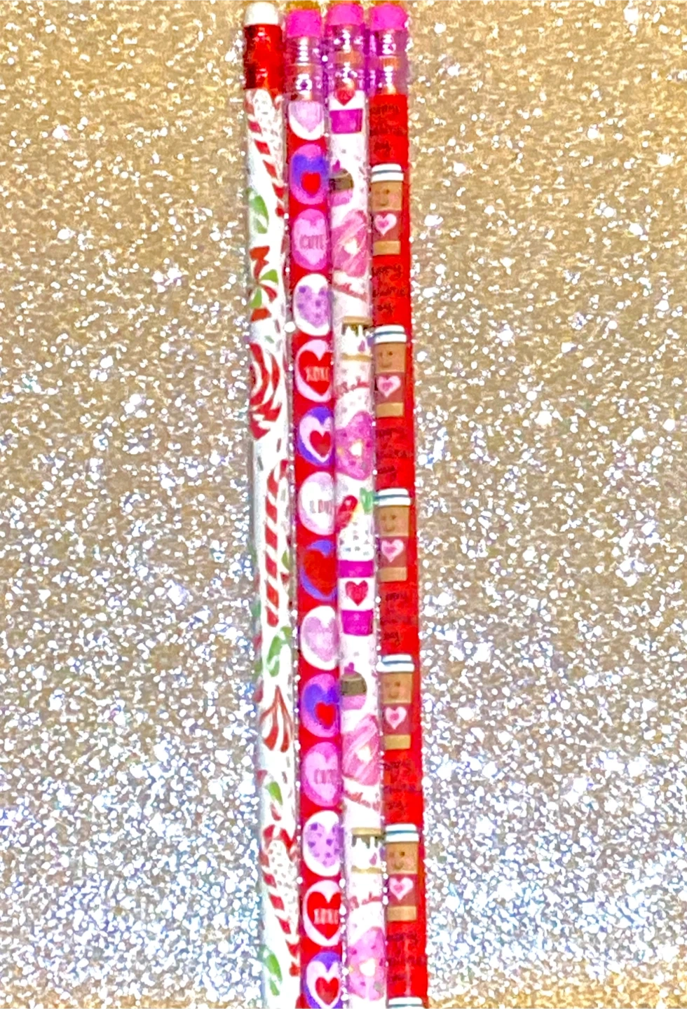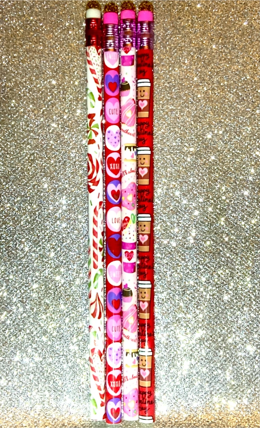 Set of 4 pencils featuring various Valentine's Day designs including candy canes, hearts, cupcakes, and coffee cups with pink erasers tops.