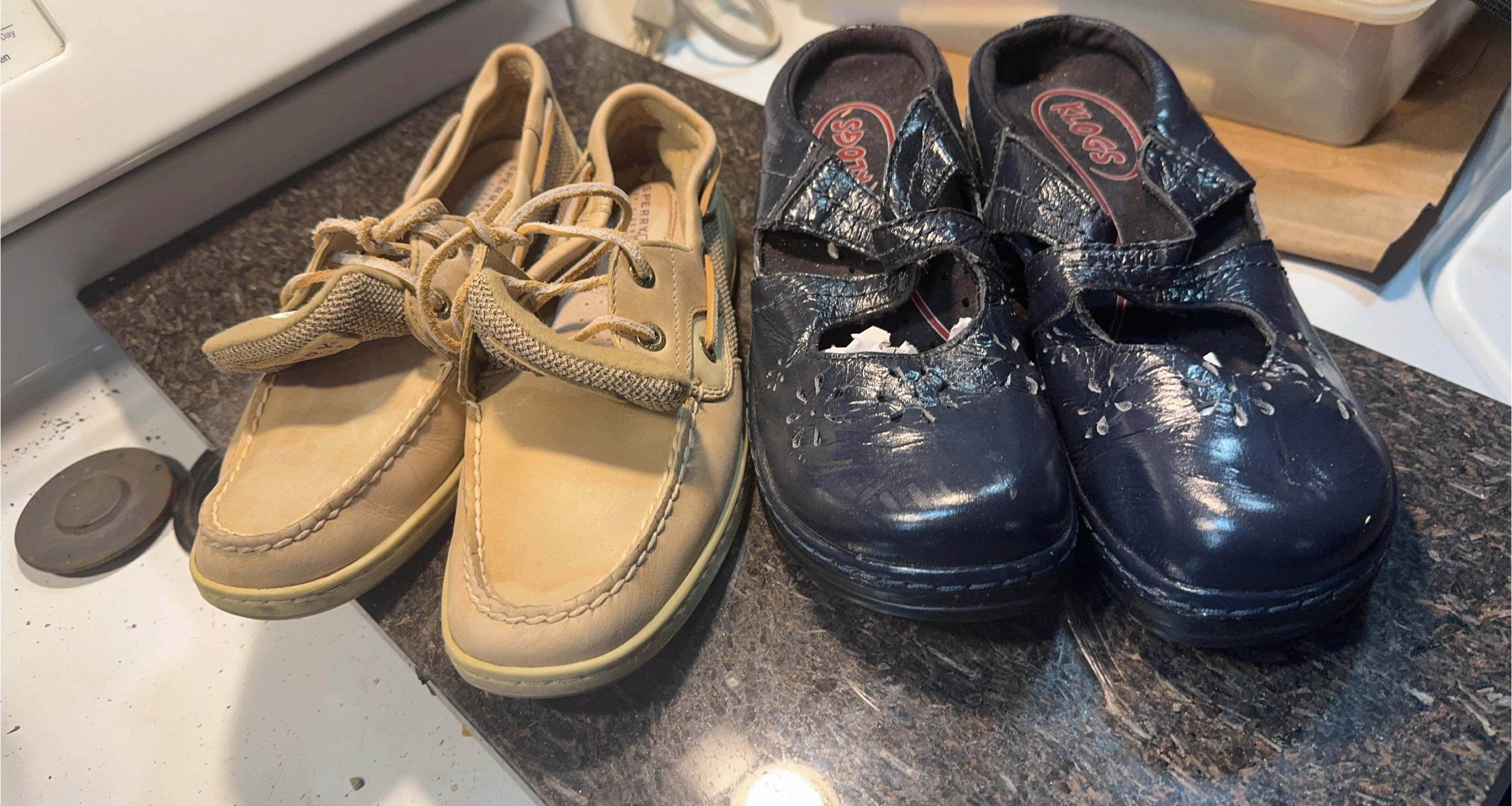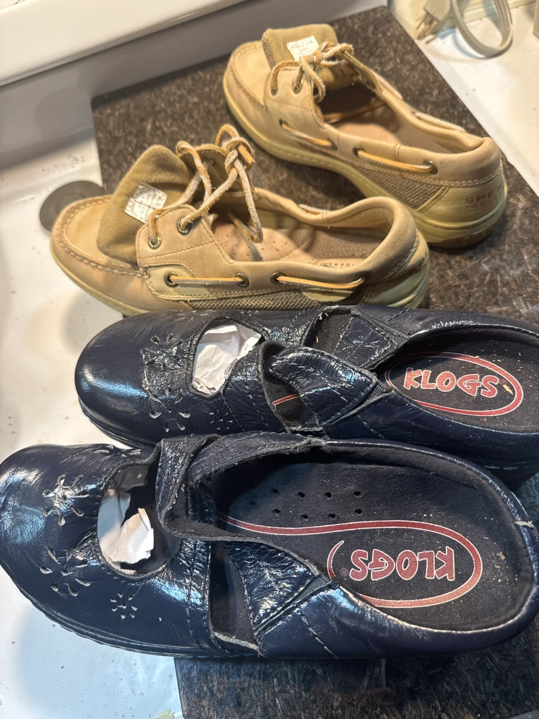 A pair of tan Sperry Top-Sider boat shoes with laces and a pair of navy blue Klogs mary jane style shoes. The Klogs shoes have a decorative floral cutout design and adjustable straps. Both pairs are pre-owned.