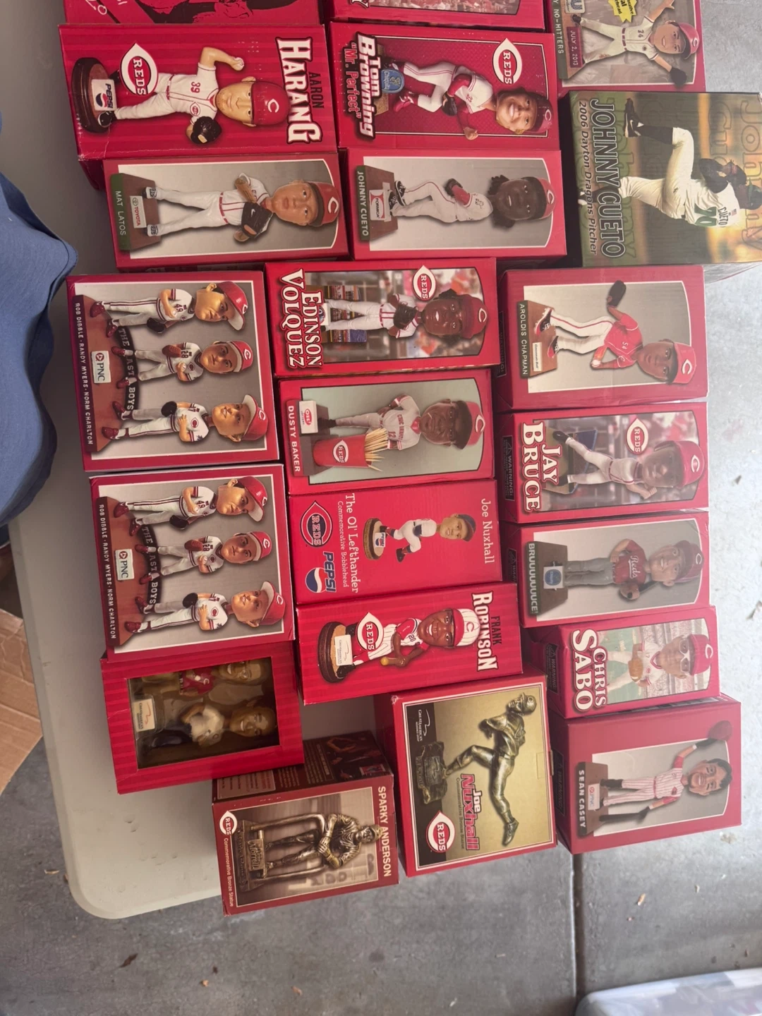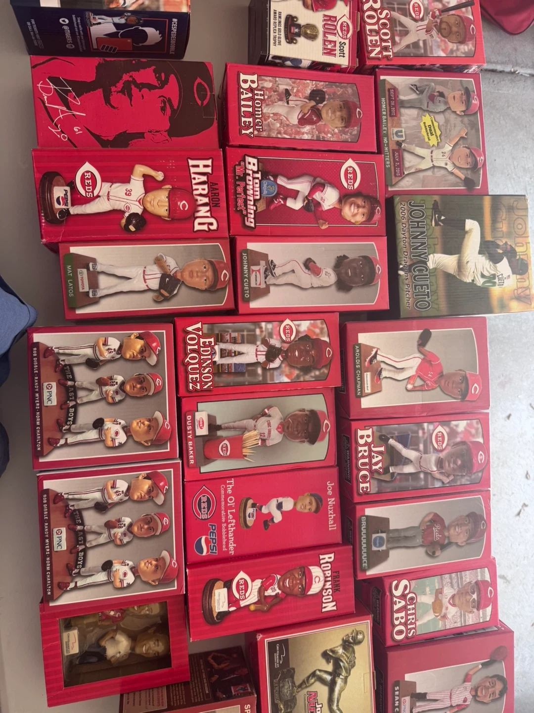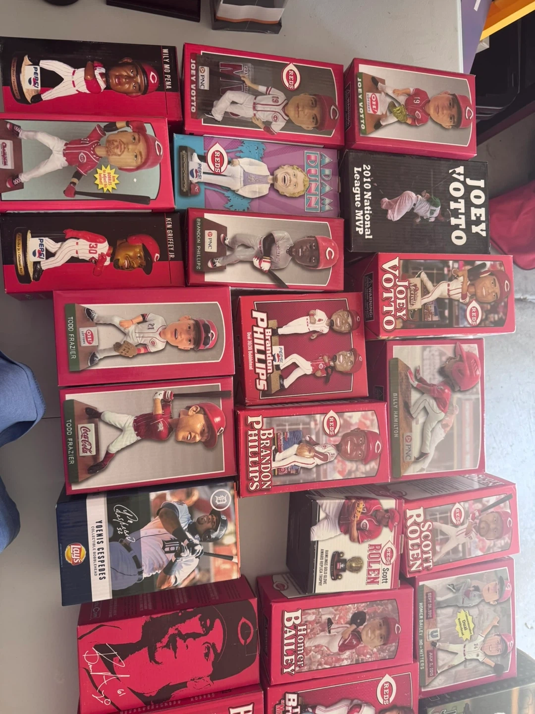 Selling a collection of Cincinnati Reds bobbleheads! They come in their original boxes and feature various players like Joey Votto, Johnny Cueto, Jay Bruce, and more! Perfect for any Reds fan or bobblehead collector!