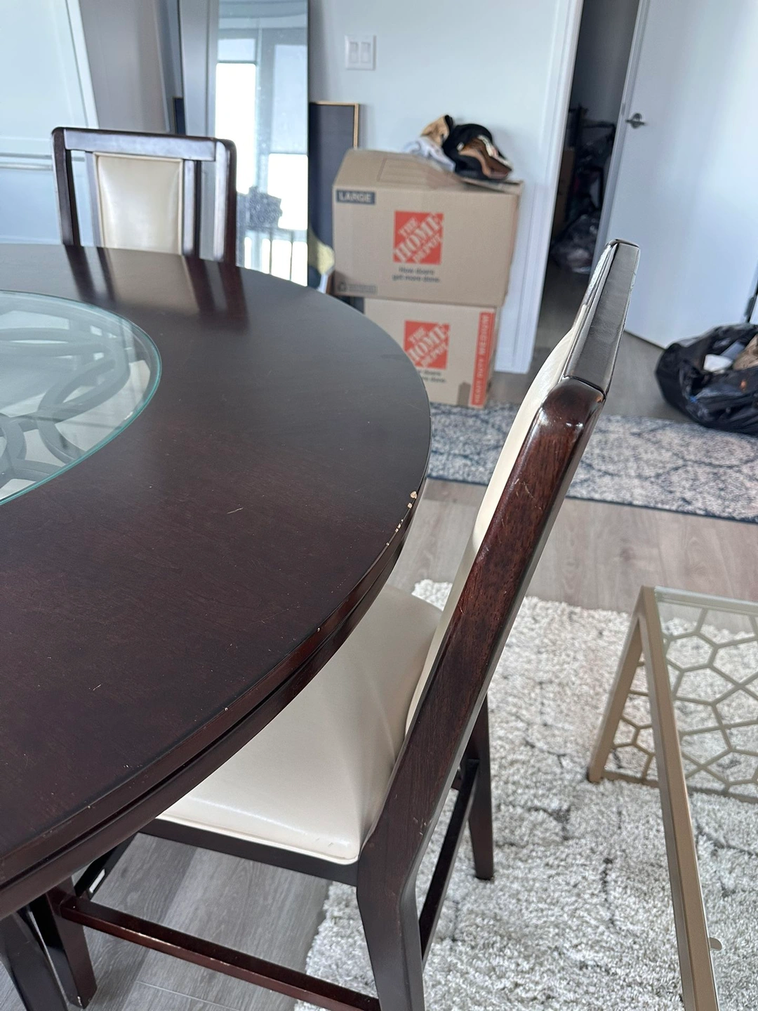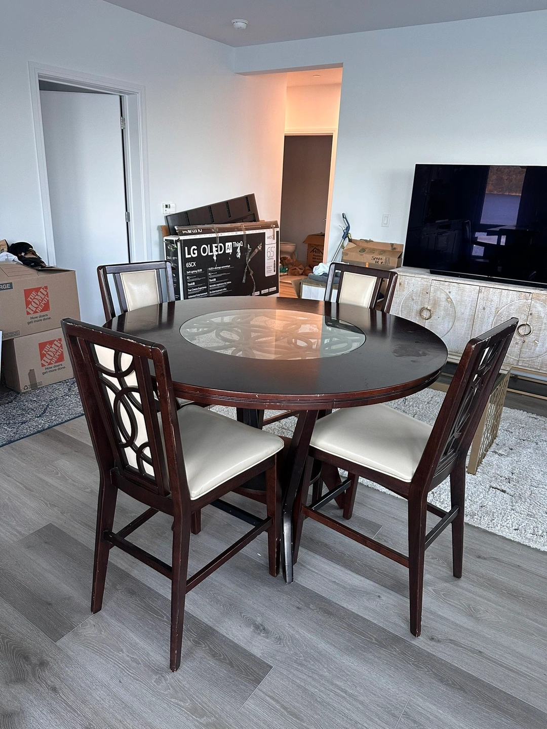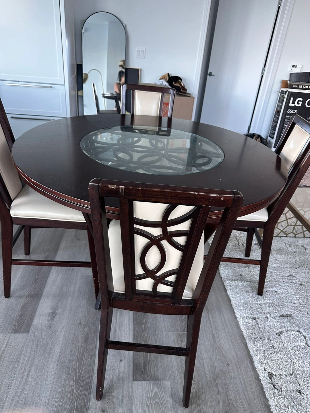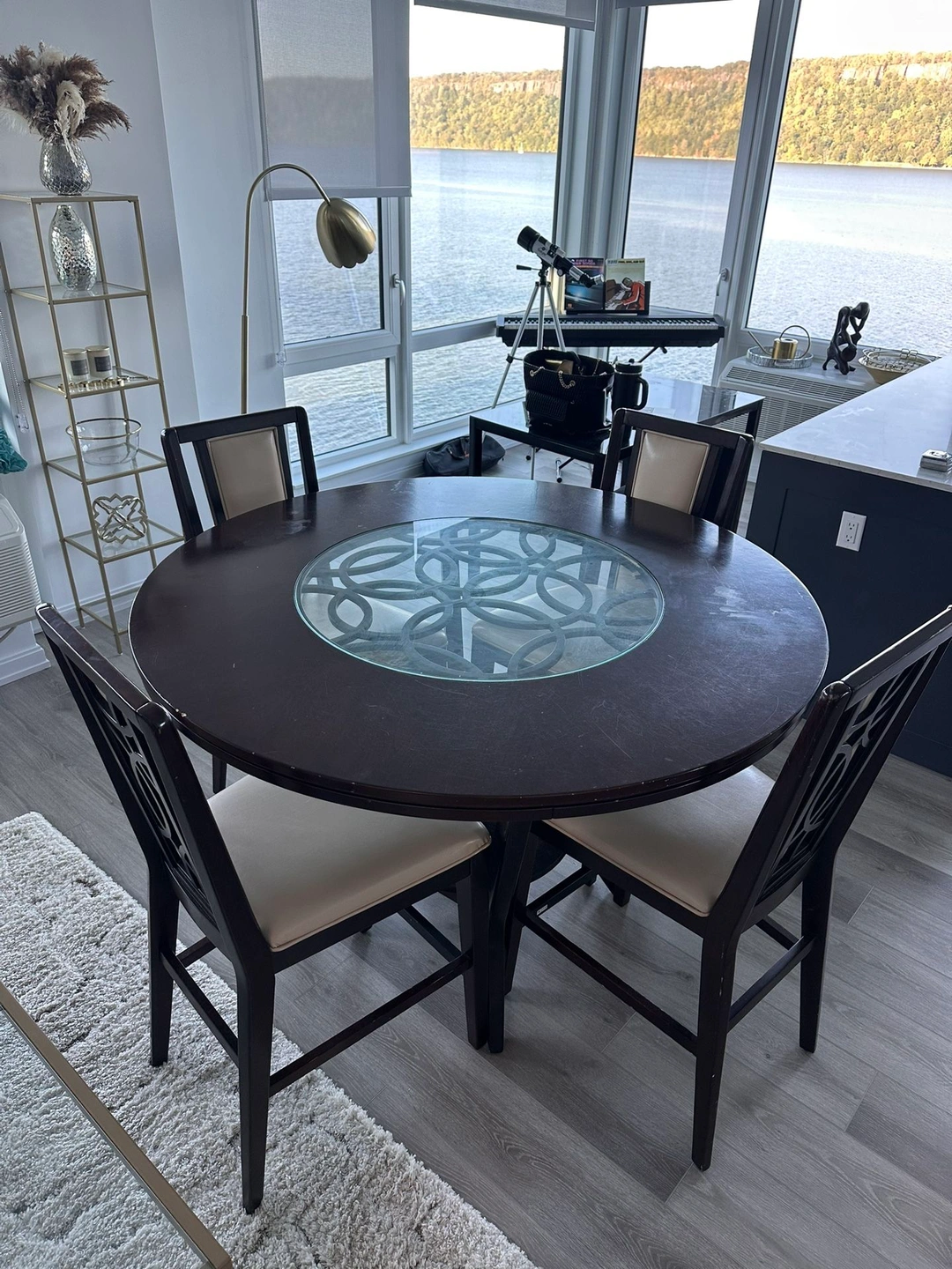 Cindy Crawford Home “Highland” 54″ Round Dining Table + 4 Chairs. This is a solid and functional dining set from the Cindy Crawford Home “Highland” collection. It features a 54″ round table with a glass insert centerpiece and comes with 4 padded chairs. Features: • 54″ round dining table with decorative glass insert • 4 padded dining chairs with wood frames • Sturdy build — table and chairs are solid and reliable • Dark wood finish with timeless style Dimensions (approx): • Table: 54″ diameter × 30″ height • Chairs: 18″ seat height, 36″ back height Condition: • Well-used / older set • Scrapes and scratches on the wood surface and legs (cosmetic wear) • Glass insert intact — no chips or cracks • Cushions and frames still supportive • 100% functional and sturdy — plenty of life left Asking Price: $175 Pickup in Yonkers, NY