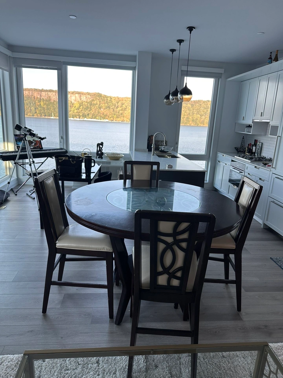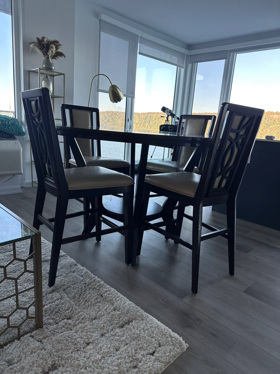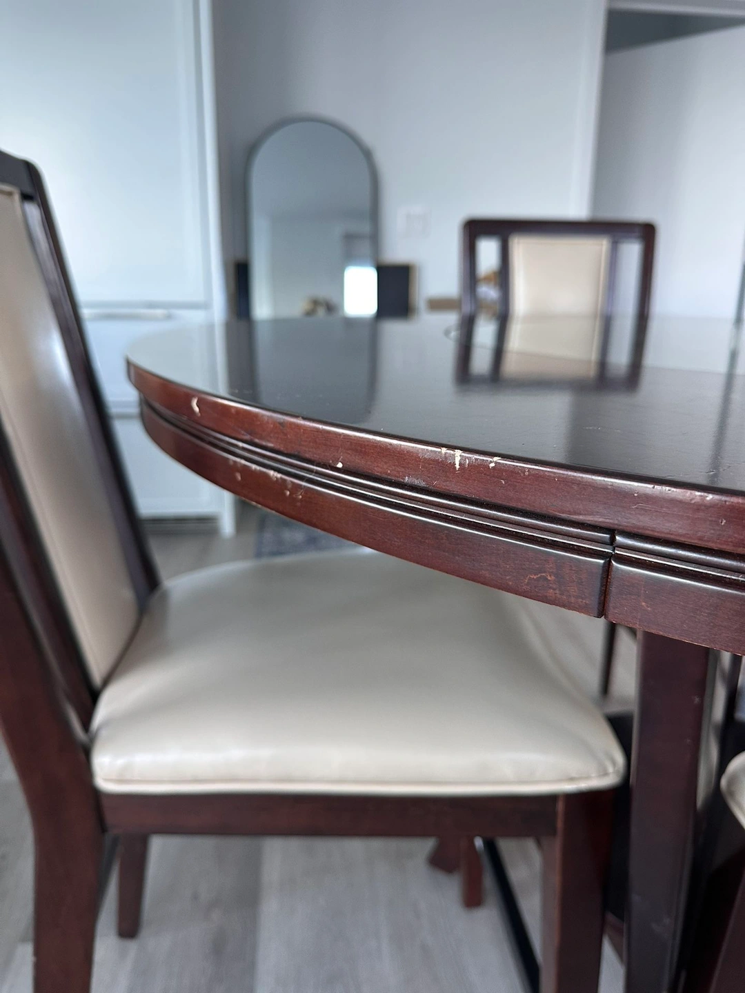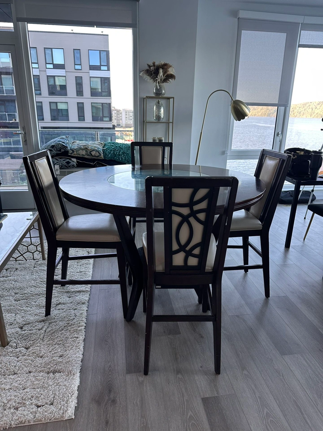 Cindy Crawford Home “Highland” 54″ Round Dining Table + 4 Chairs. This is a solid and functional dining set from the Cindy Crawford Home “Highland” collection. It features a 54″ round table with a glass insert centerpiece and comes with 4 padded chairs. Features: • 54″ round dining table with decorative glass insert • 4 padded dining chairs with wood frames • Sturdy build — table and chairs are solid and reliable • Dark wood finish with timeless style Dimensions (approx): • Table: 54″ diameter × 30″ height • Chairs: 18″ seat height, 36″ back height Condition: • Well-used / older set • Scrapes and scratches on the wood surface and legs (cosmetic wear) • Glass insert intact — no chips or cracks • Cushions and frames still supportive • 100% functional and sturdy — plenty of life left Asking Price: $175 Pickup in Yonkers, NY