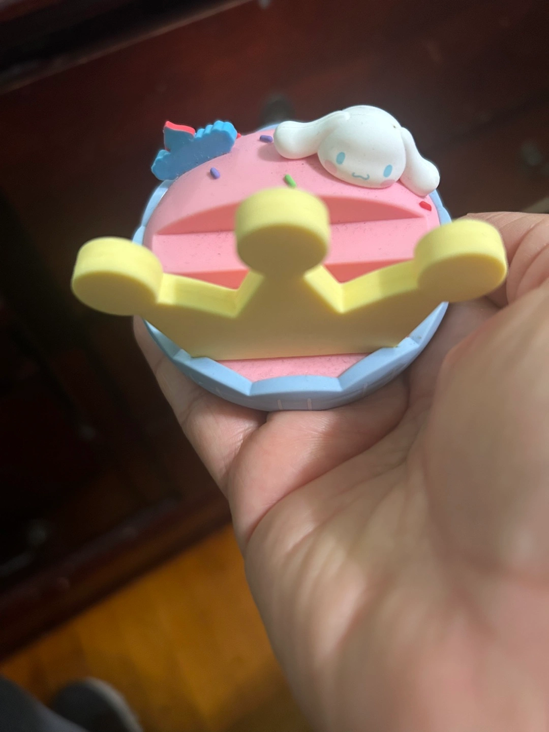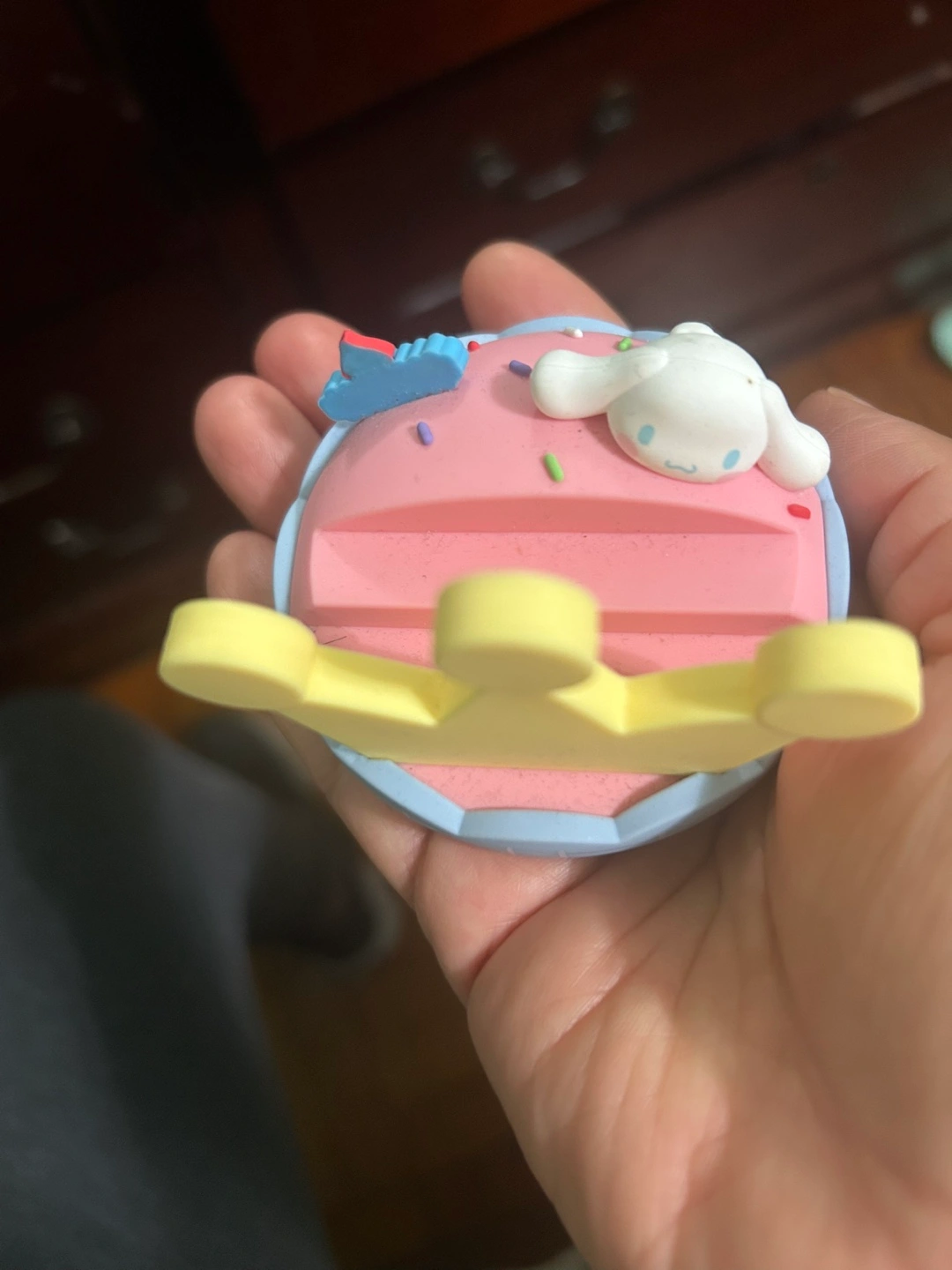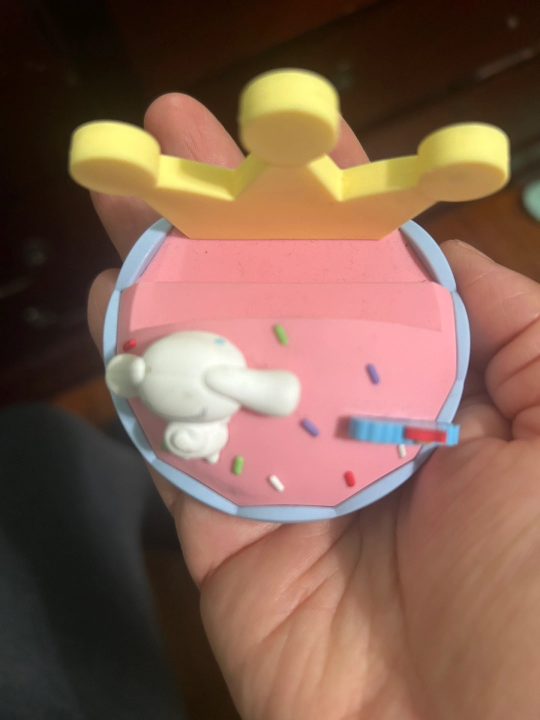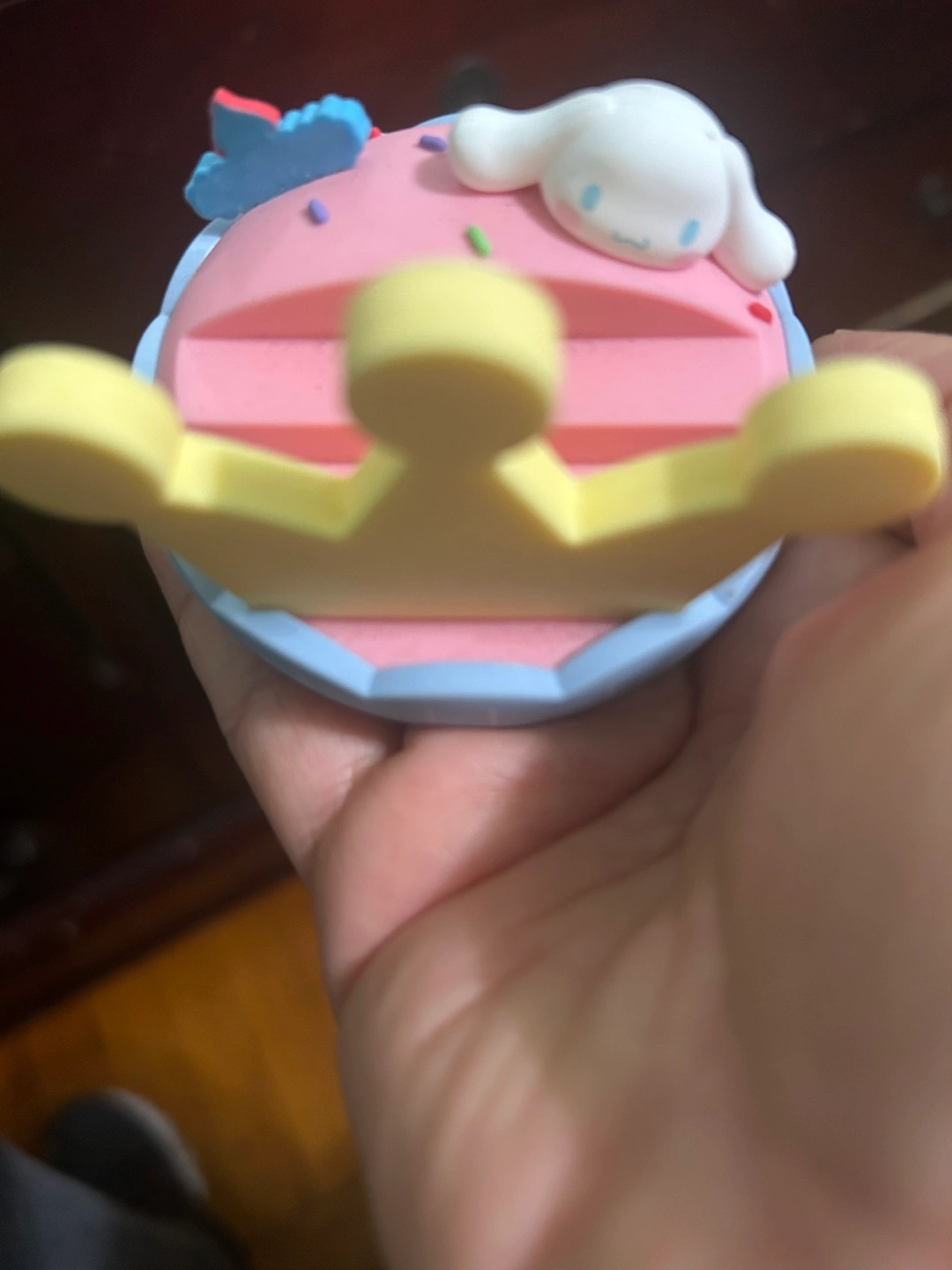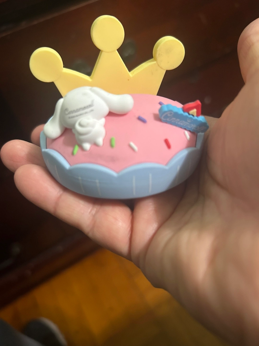 Selling a cute Cinnamoroll phone stand shaped like a crown! It's pink, blue, and yellow and features a Cinnamoroll character on the front