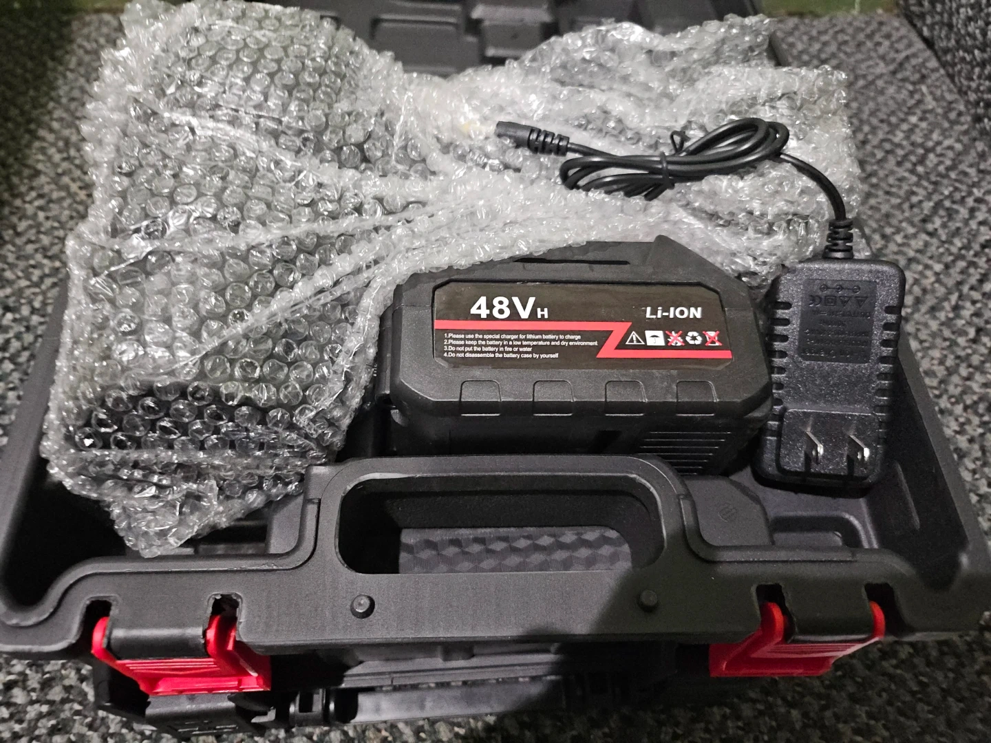 This is a 48V Li-ion cordless leaf blower. It includes the blower unit, a 48V battery, and a charger. The blower features a variable speed switch that's easy to control.