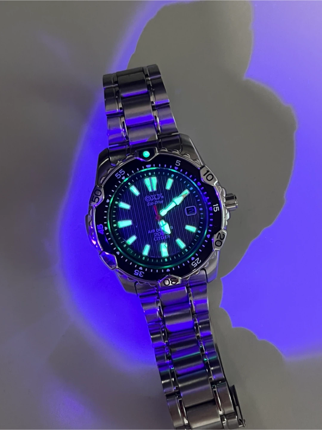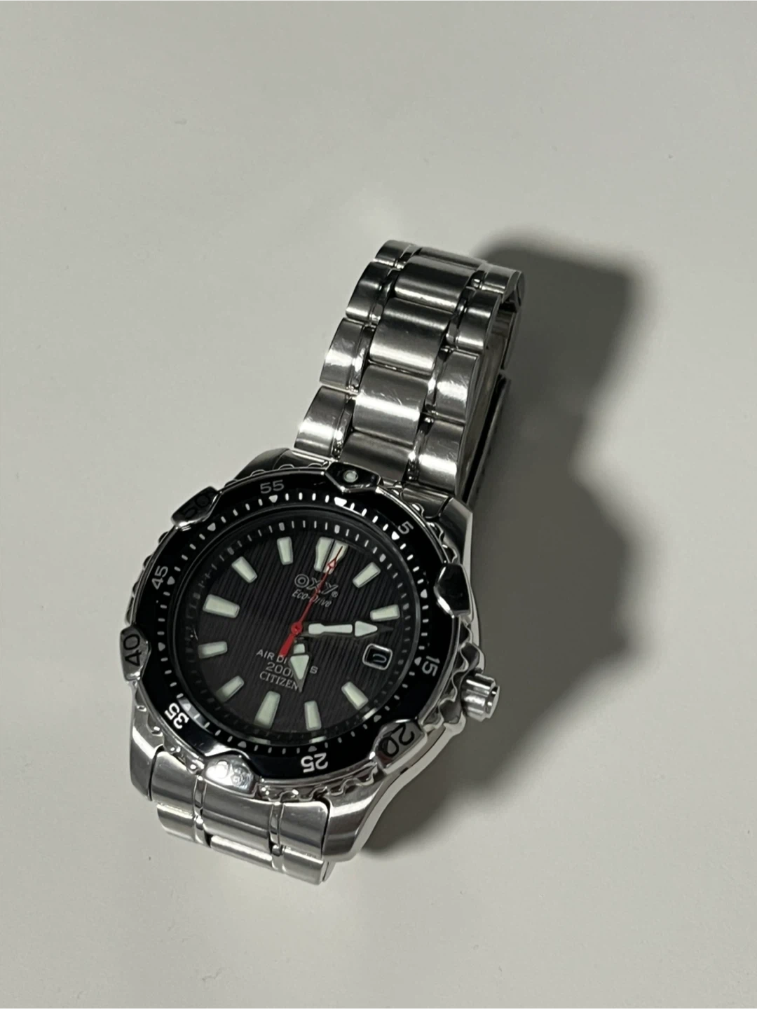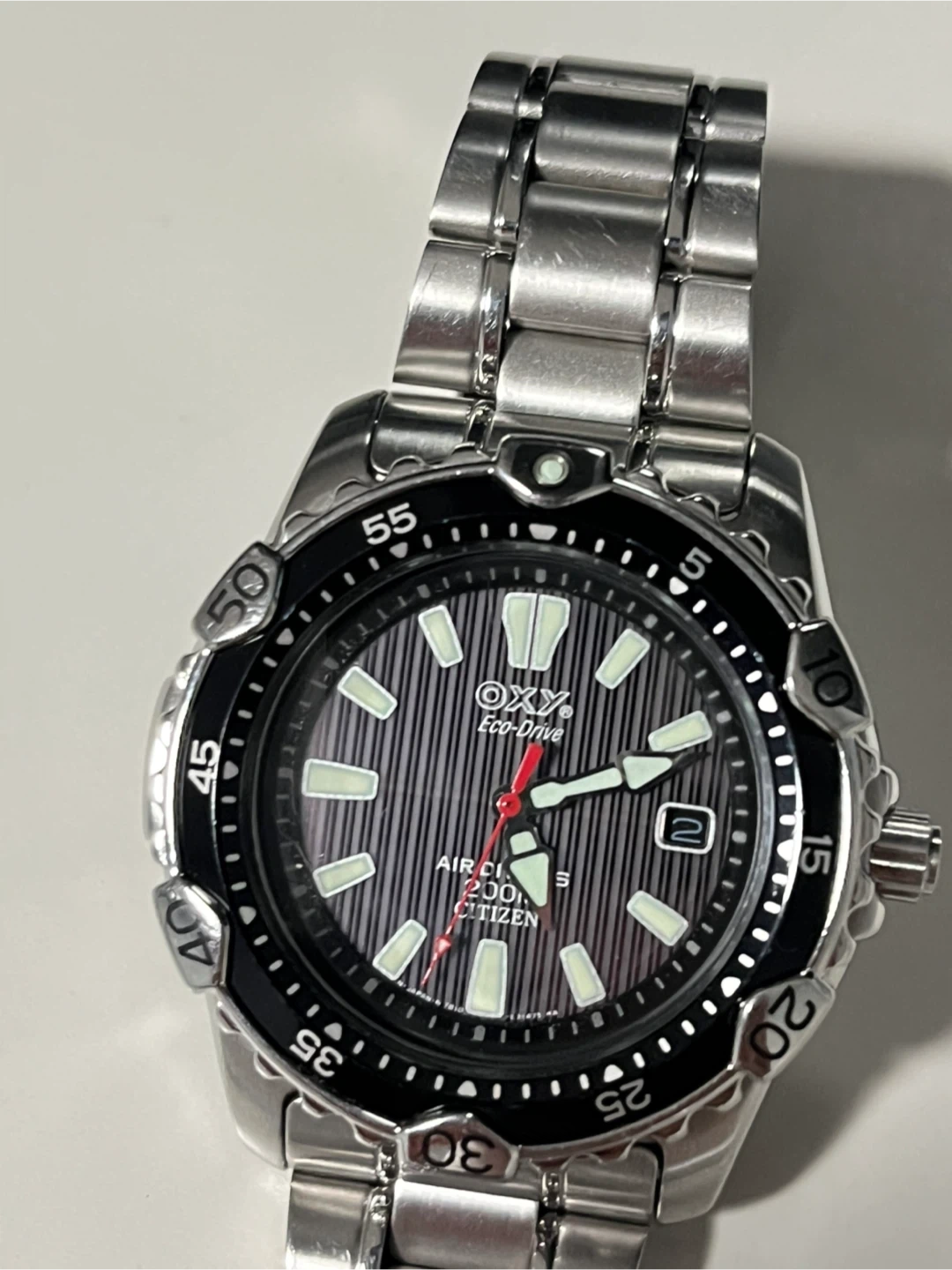 For sales a Citizen OXY Air Diver 200m Eco-Drive Solar Watch in great working condition. Watch only, no box, minor wear.