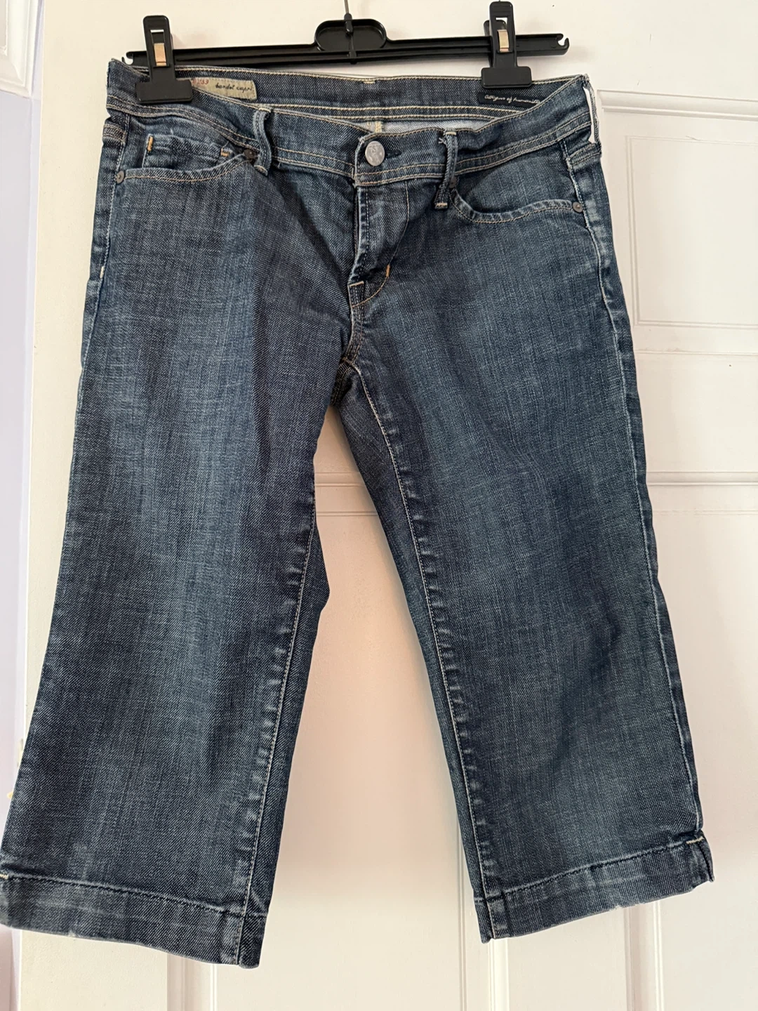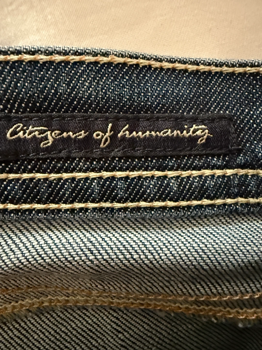 247Selling a pair of Citizens of Humanity denim capri jeans in size 28. They're in great condition and feature a unique design on the back pocket. The jeans are made in the USA from imported fabric, with a blend of cotton and elastane for a comfortable fit. Style number is 259-085.