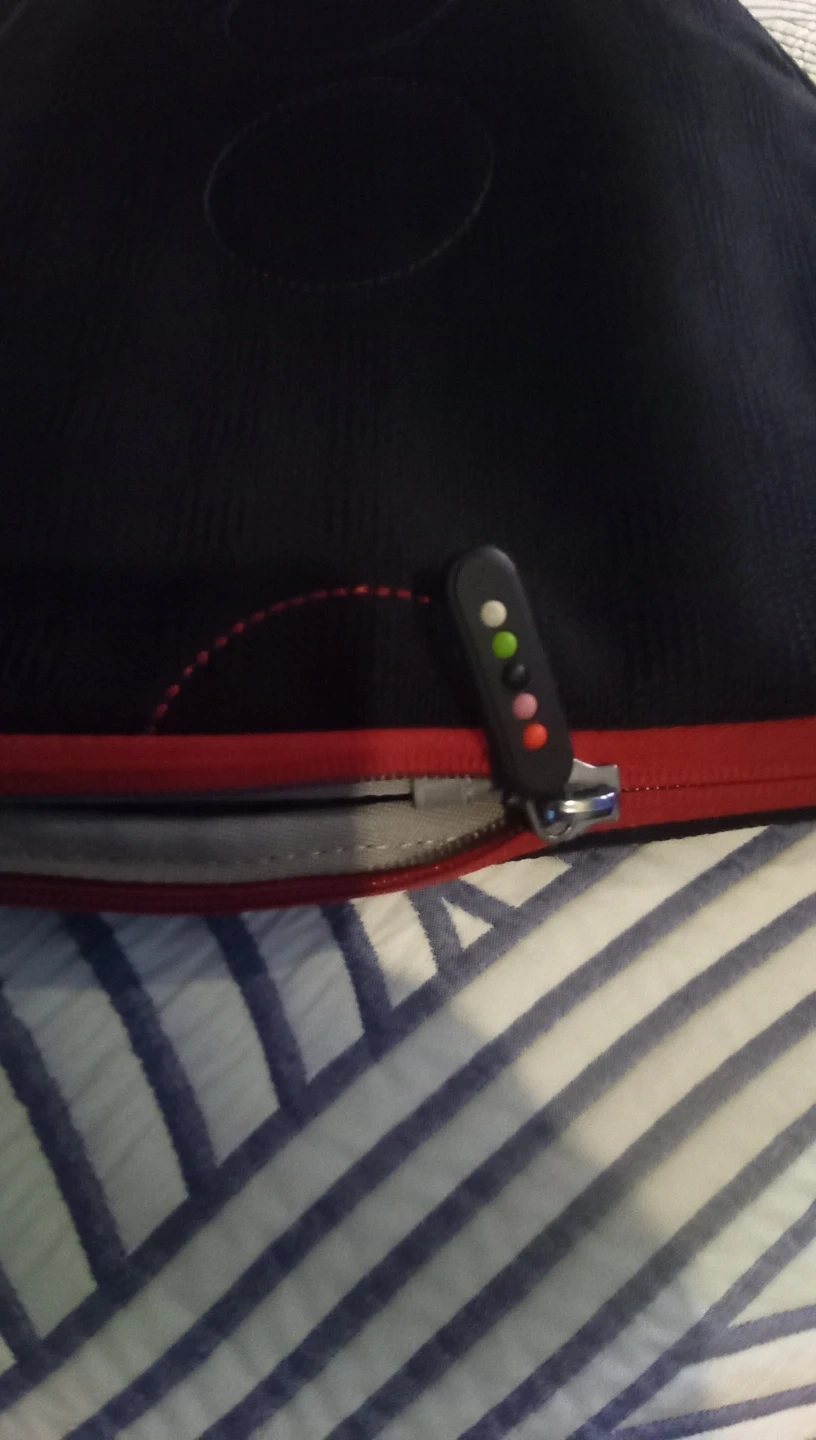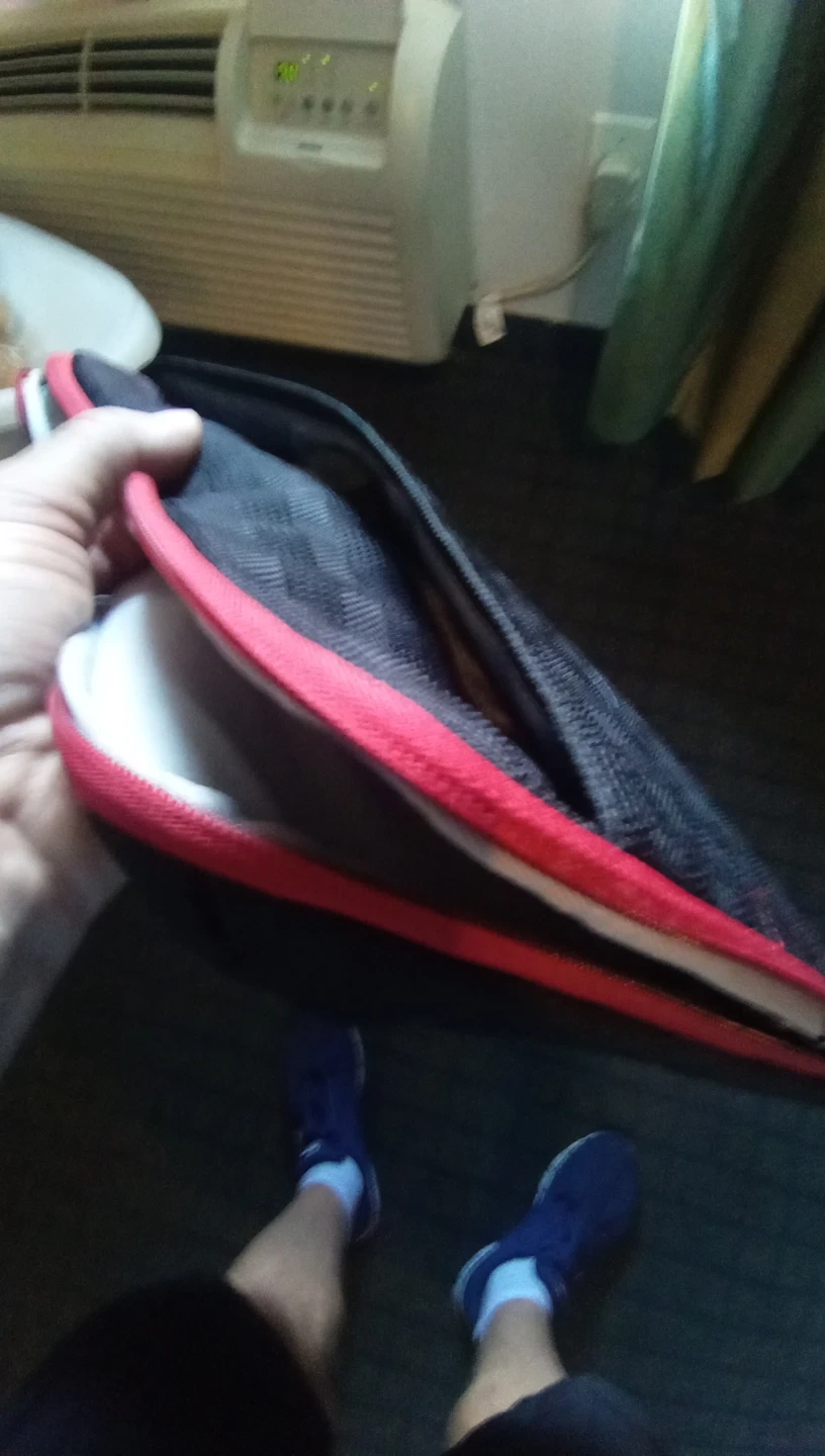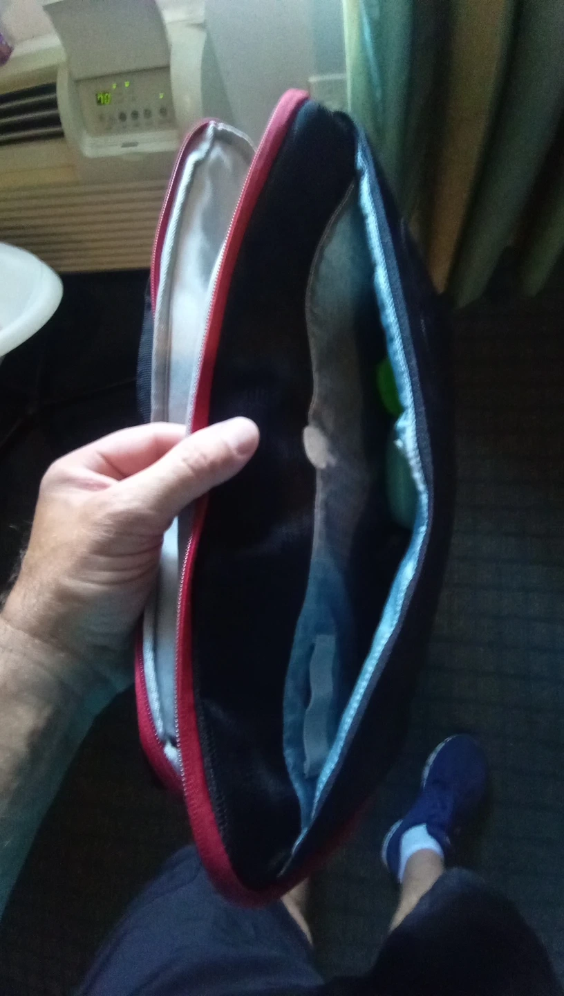 This is a black and red padded sleeve designed for laptops. It features a zippered closure and a handle for easy carrying. The interior lining is soft to protect your device.