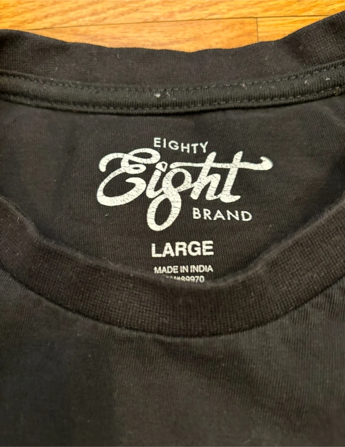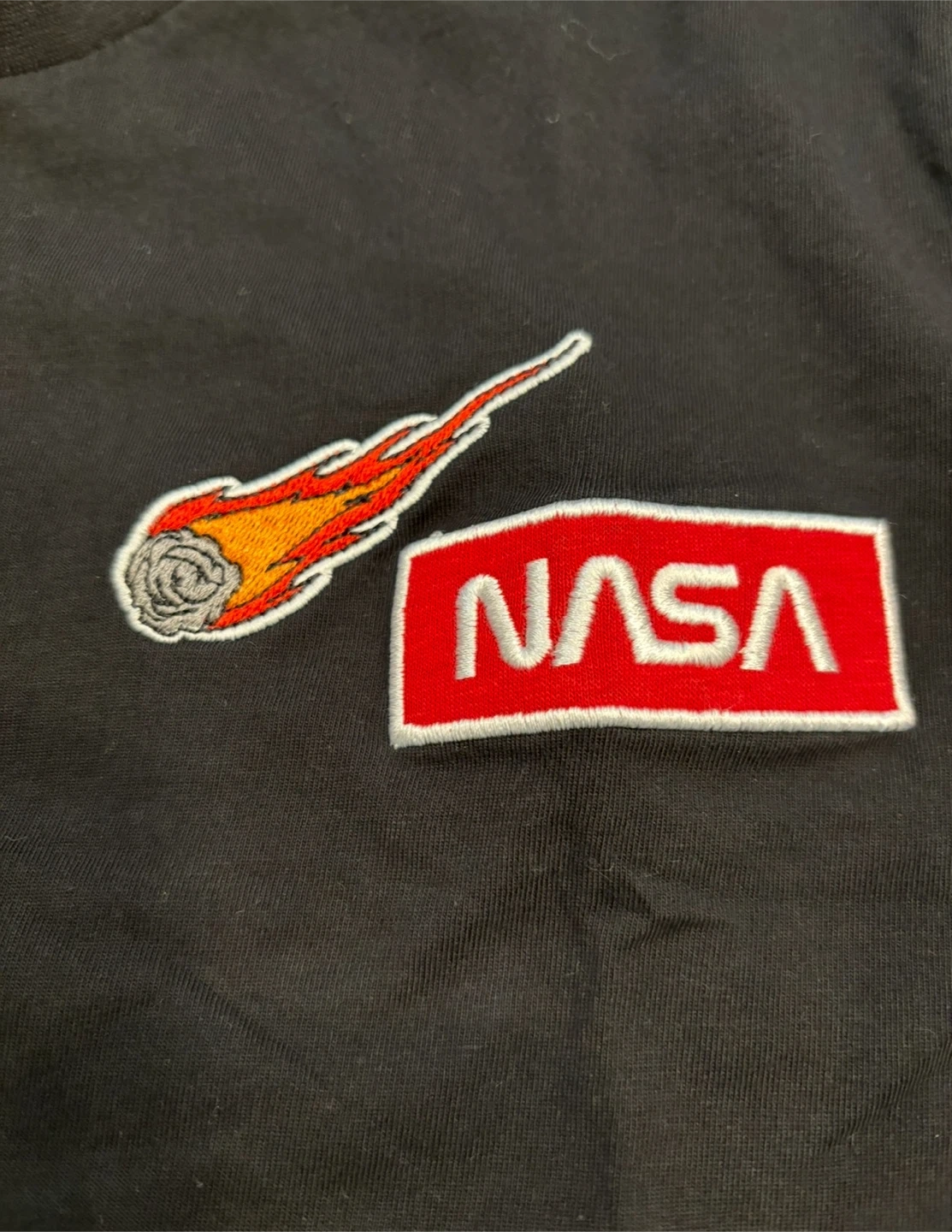 This is a black t-shirt from Eighty Eight Brand. It's a size large with NASA patches and space-themed graphics. It's made of comfortable material.
