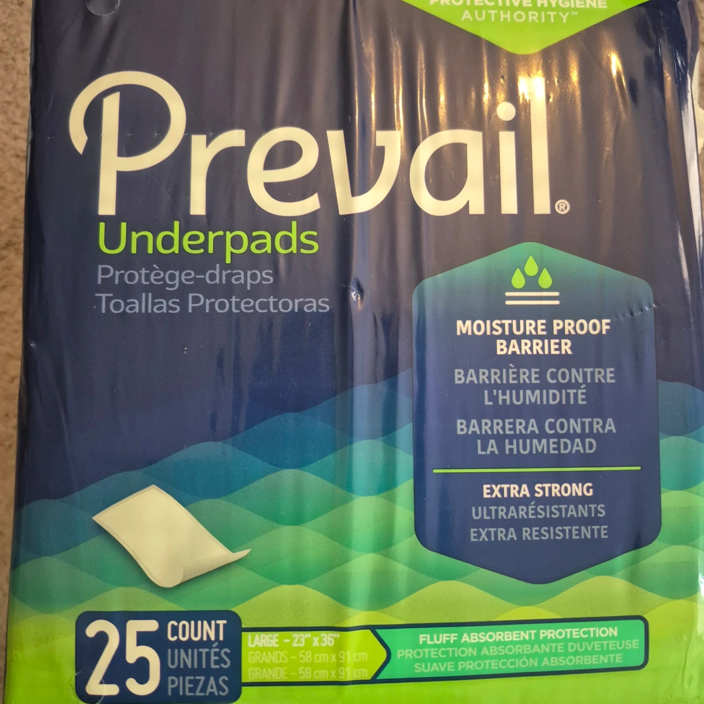 Selling a pack of Prevail Underpads. This package contains 25 underpads, each measuring 23"x36". They feature a moisture-proof barrier and extra strong protection, with fluff absorbent protection