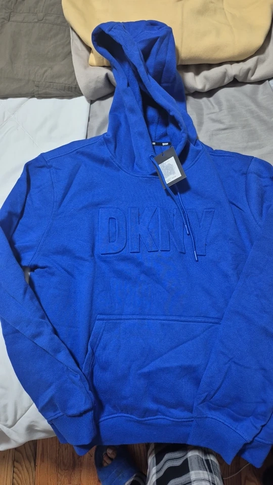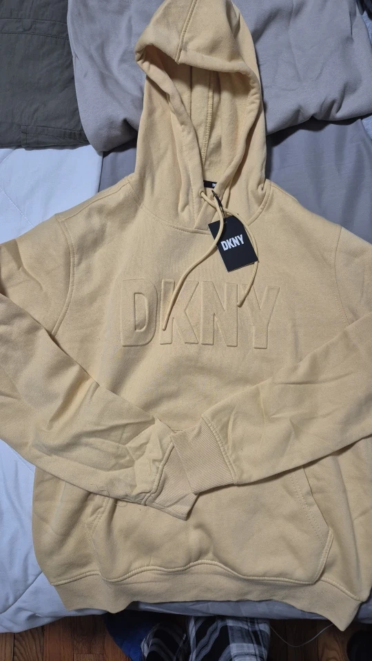 I have a new DKNY hoodie for sale! It's in excellent condition and has never been worn. I have one in a yellow color and another in blue. Both have the DKNY logo embossed on the front. Perfect for staying cozy and stylish!