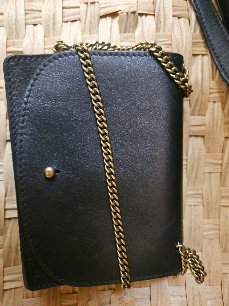 Selling a stylish Madewell black leather wallet featuring a chic gold chain accent. It's in great condition and ready for a new home! Perfect for adding a touch of elegance to your everyday style