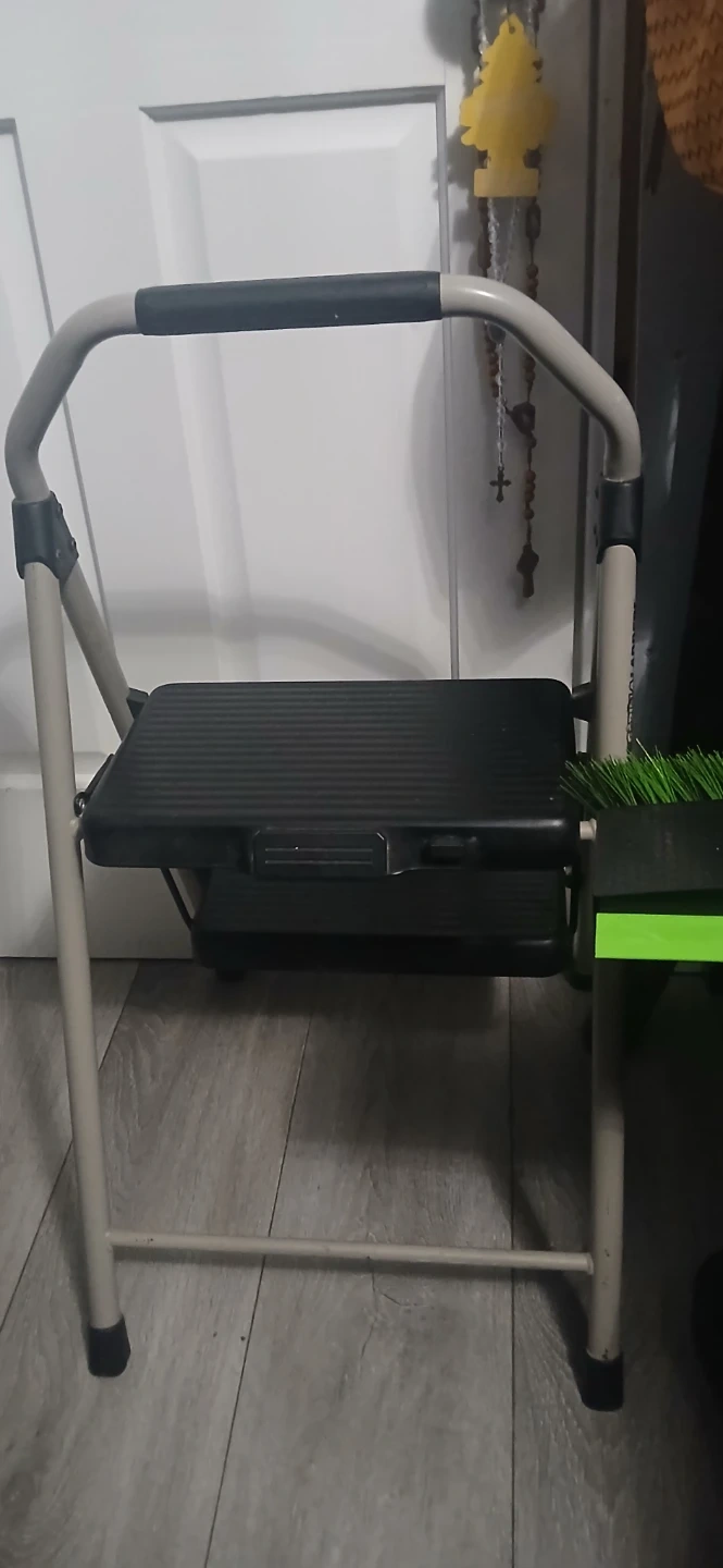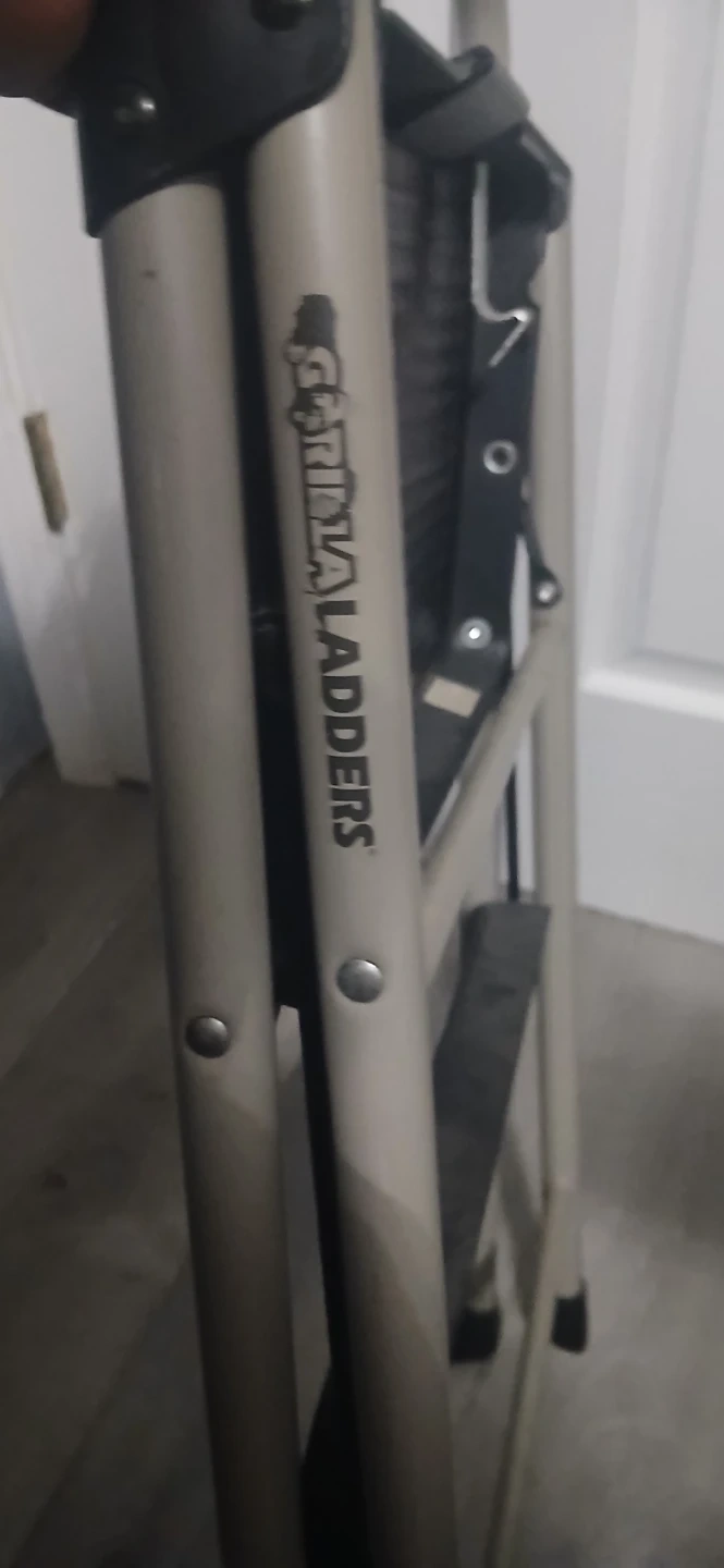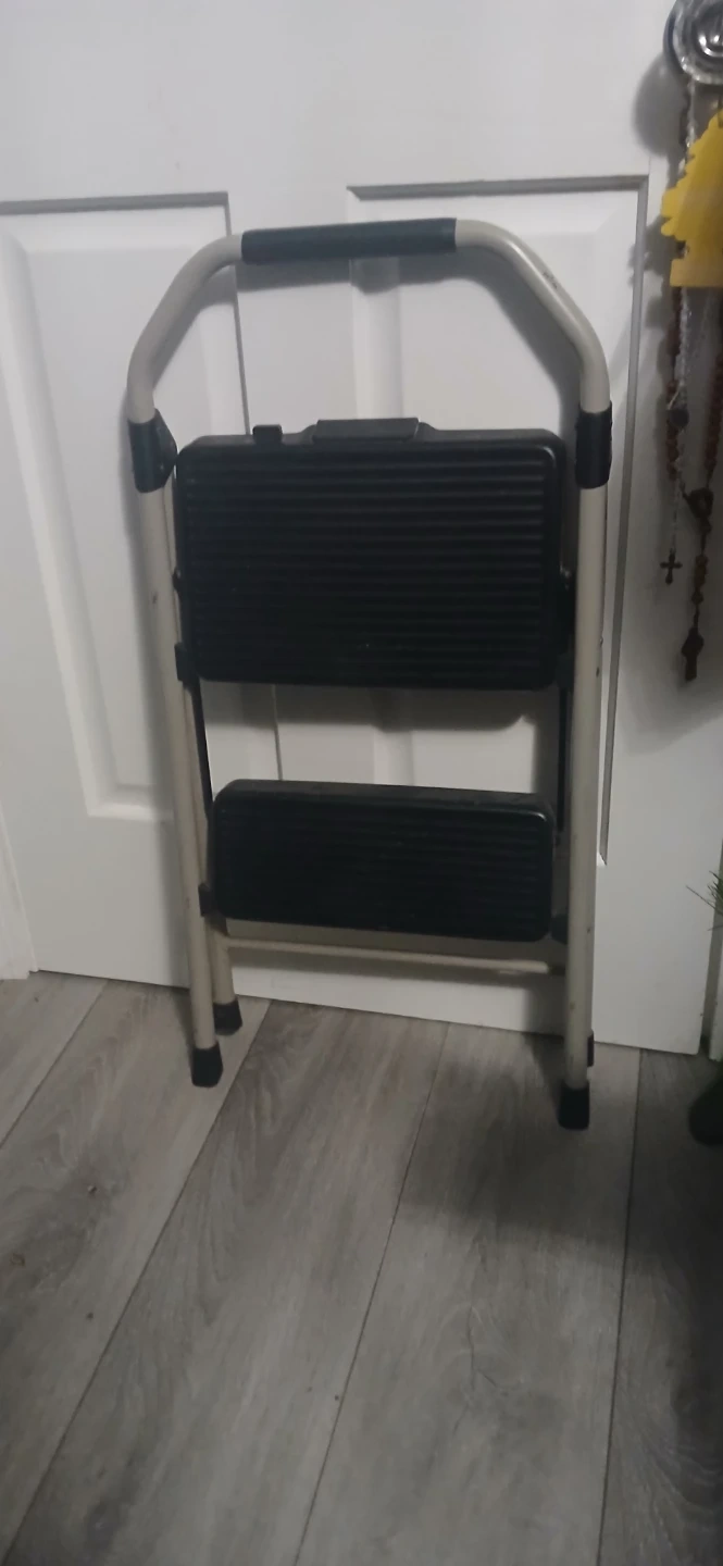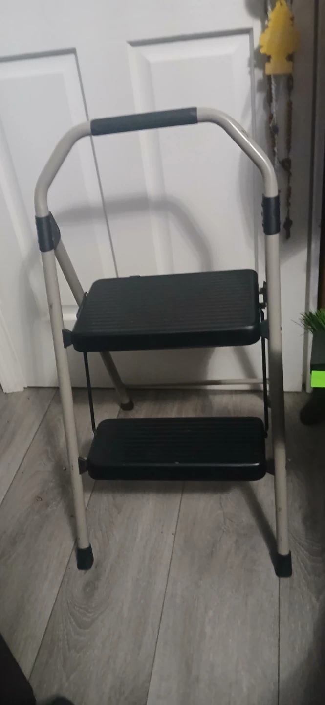 This is a 2-step folding step stool from Gorilla Ladders. It's made of metal with black plastic treads on the steps and handle grips. The steps have a textured surface for grip. It folds flat for easy storage. Handy for reaching higher shelves or for quick tasks around the house!