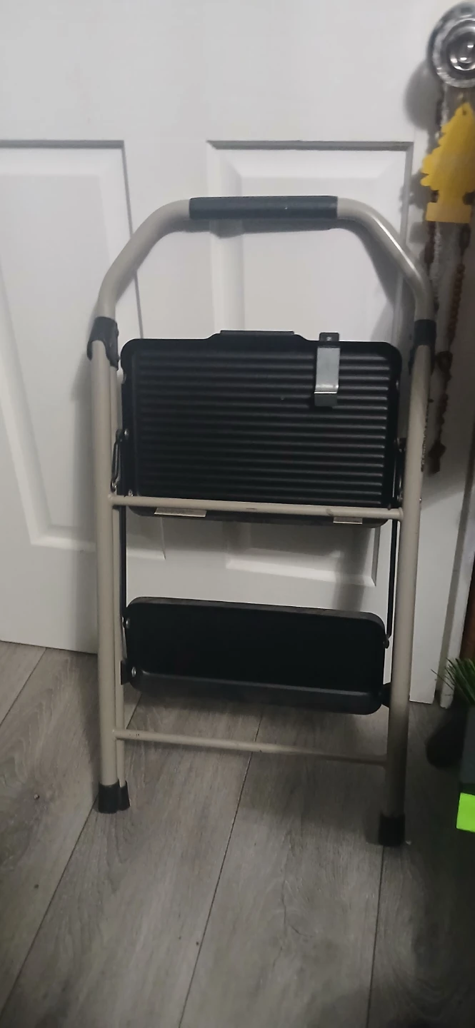 This is a 2-step folding step stool from Gorilla Ladders. It's made of metal with black plastic treads on the steps and handle grips. The steps have a textured surface for grip. It folds flat for easy storage. Handy for reaching higher shelves or for quick tasks around the house!