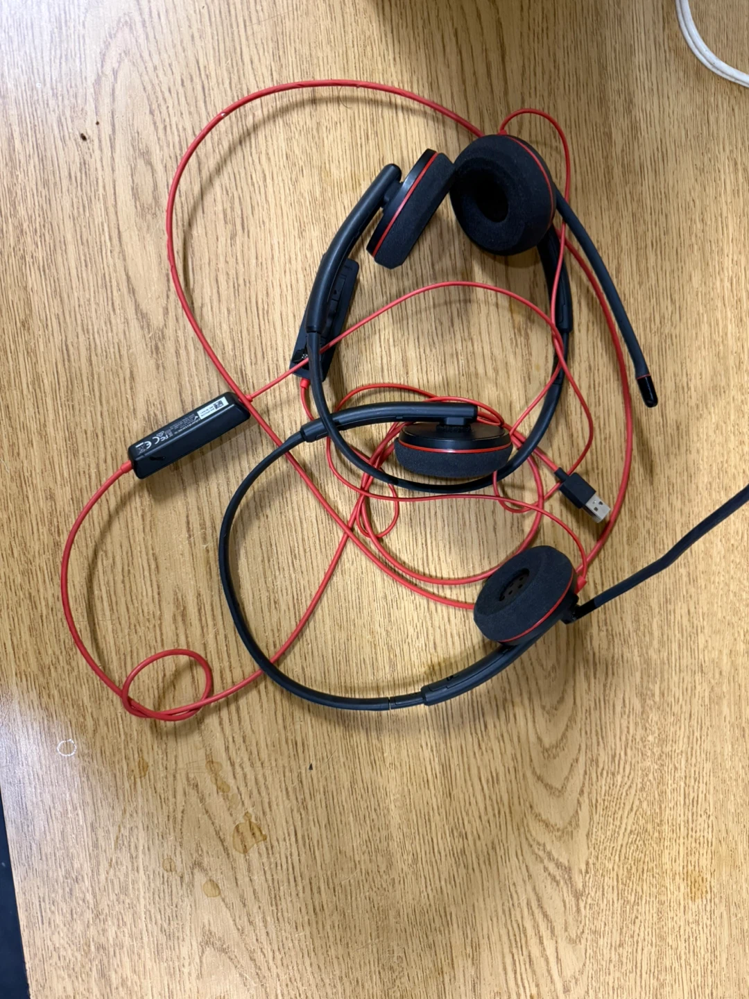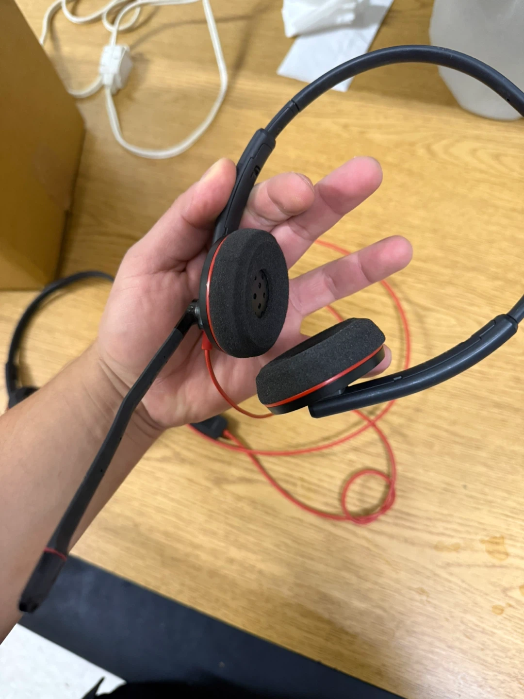 Selling a black wired headset. It features a microphone and has red accents. Perfect for calls or gaming!
