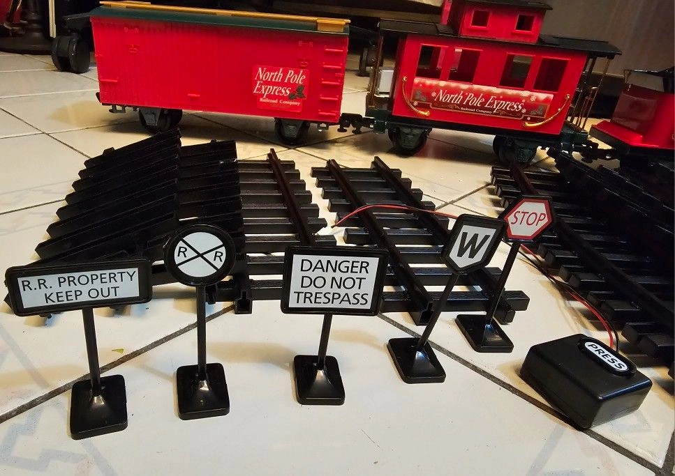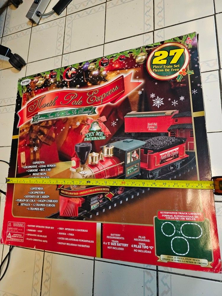 Needs 4 C batteries (not included). 2 little road signs missing. Box was a little worn, but it's still great for Christmas gift.