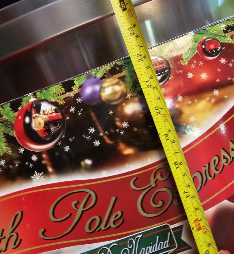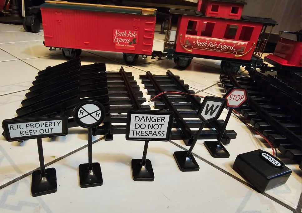 Needs 4 C batteries (not included). 2 little road signs missing. Box was a little worn, but it's still great for Christmas gift.