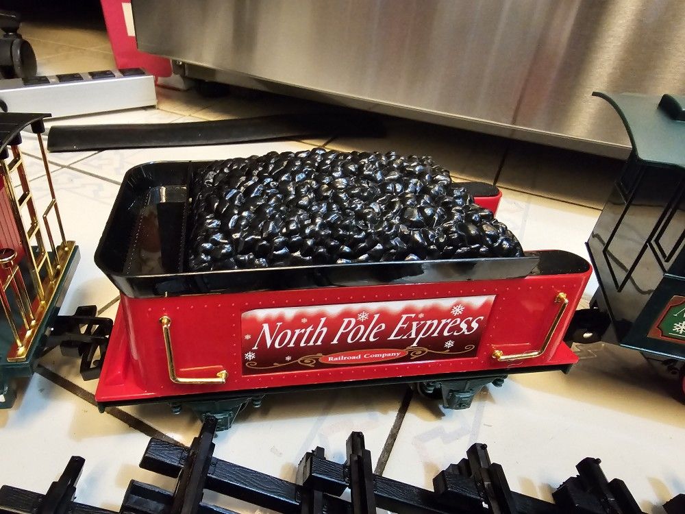 The train set features a colorful red, black & green plastic design. It is perfect for collectors or as a fun holiday decoration.